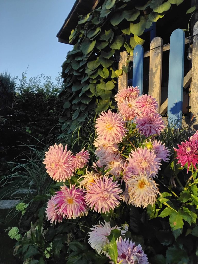 Poniżej pokażę dwa zdjęcia z mojego ogrodu pod Warszawą. Latem dalie są w pełnym rozkwicie i trzymane przez podpory ogrodowe, a ten sam fragment w grudniu wygląda zupełnie inaczej, gdy dalie zimują w garażu, a podpory grają pierwsze skrzypce.