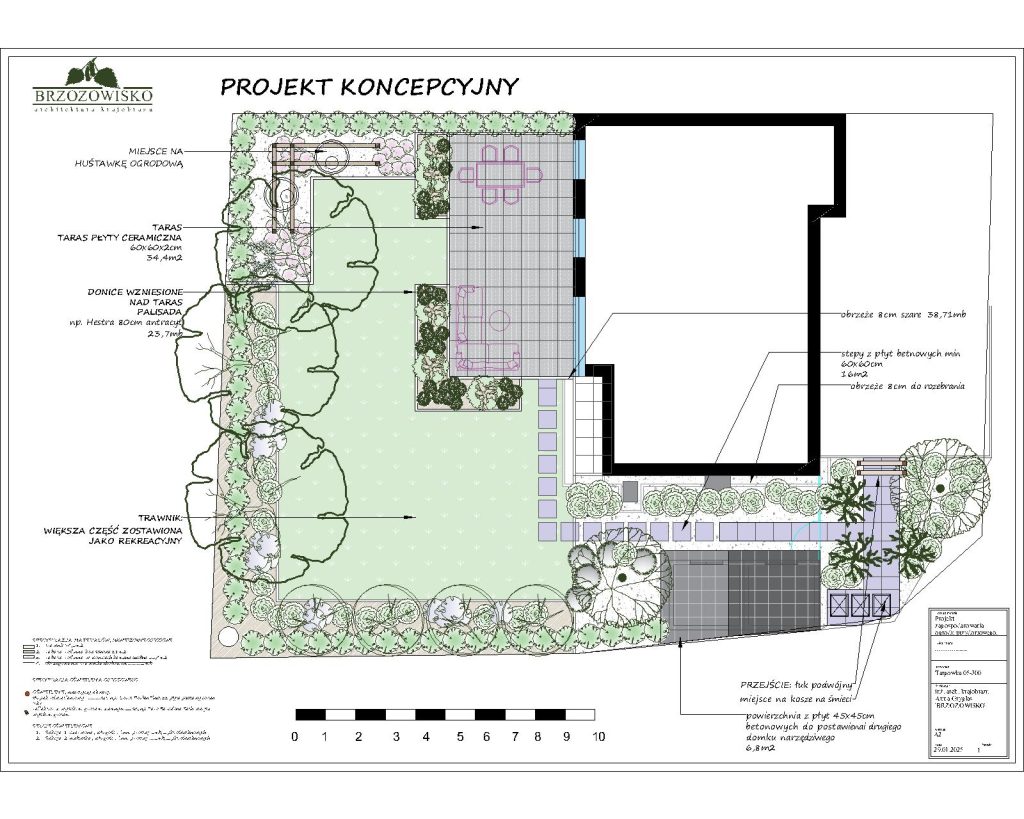 Pierwszy plan aranżacji małego ogrodu powstaje na podstawie inwentaryzacji, pomiarów terenowych, obserwacji oraz odpowiedzi właścicieli dotyczących stylu, potrzeb i funkcji ogrodu. W opisanym przypadku ogród ma niespełna 280 m² i znajduje się przy zabudowie bliźniaczej. Projekt obejmował układ dojść, wielkość i technologię wykonania tarasu oraz elementy dodatkowe, takie jak huśtawka i łuk wejściowy do ogrodu. Plan był następnie korygowany w trakcie konsultacji. Zmieniono szerokości płyt na ścieżkach, doprecyzowano funkcję strefy rekreacyjnej, w której ostatecznie znalazły się huśtawka i jacuzzi, dodano pergolę nad tarasem oraz uzupełniono aranżację o oświetlenie w formie kulistych lamp.