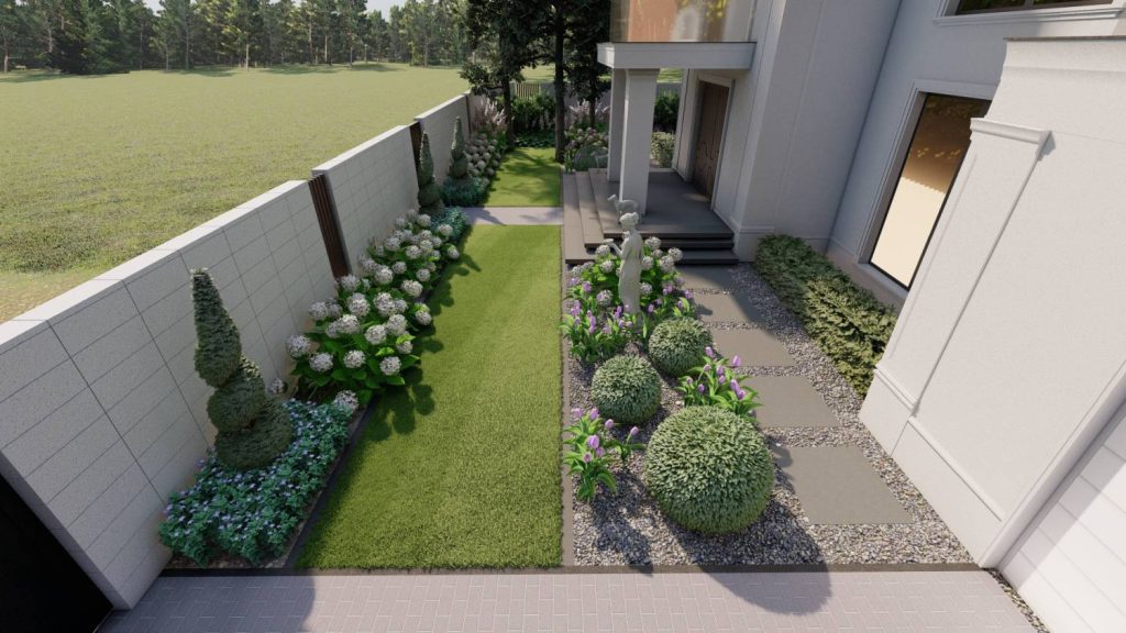 Bok działki często przyjmuje formę wąskiego pasa, szczególnie w zabudowie bliźniaczej. Zamiast traktować go jako problem, warto zamienić opaskę wokół domu w funkcjonalną ścieżkę prowadzącą na tył posesji. Ułatwia to komunikację i pielęgnację tej części terenu.