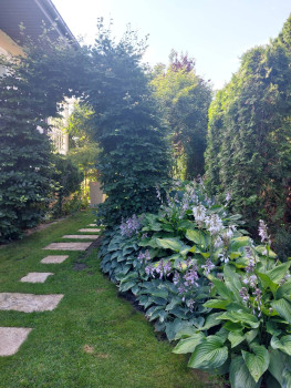 Powyżej na lewo zaznaczenia przejścia między frontem ogrodu a tyłem dzięki nasadzeniu dwóch egzemplarzy buka pospolitego strzyżonego w łuk. Cienisty zakątek wypełniają hosty. Na prawo mały ogród w bloku. Aranżacja ogrodu z wykorzystaniem brył żywopłotów, które dzielą przestrzeń i są tłem dla roślin kwitnących.