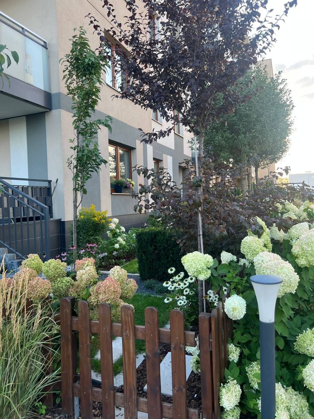 Front ogrodu zdobią hortensje oraz hakonechloa.
