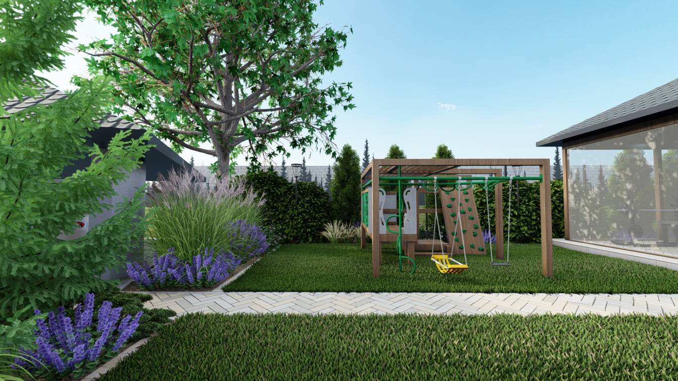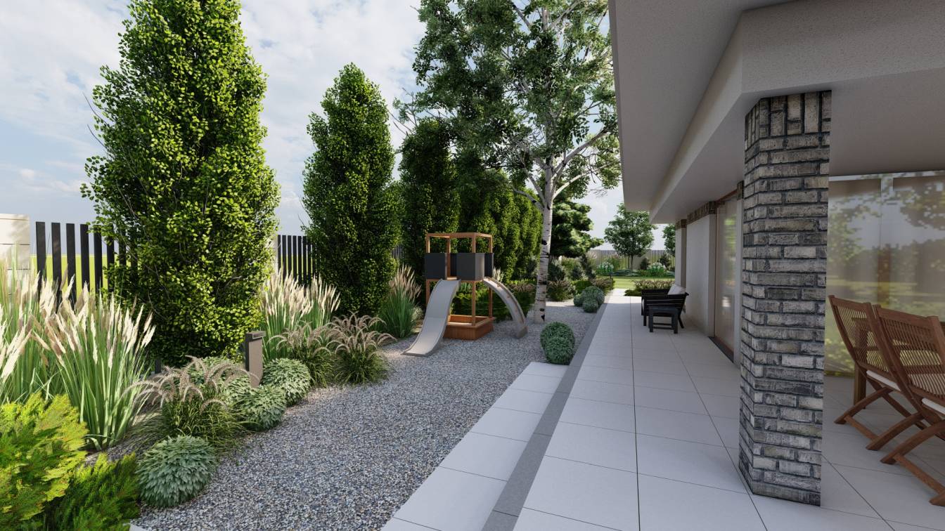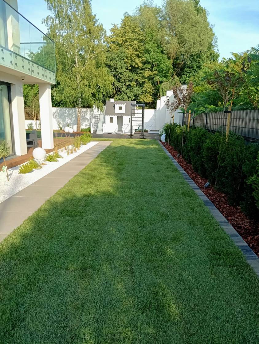 Główny trawnik pozostawiono możliwie duży, z myślą o zabawach dzieci.