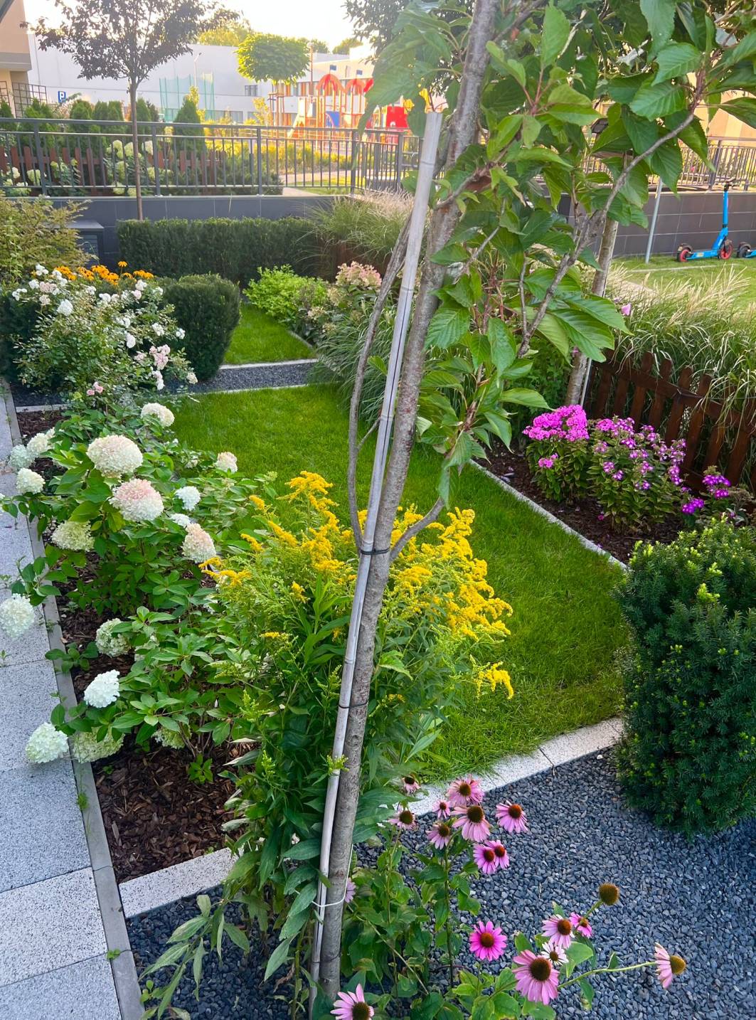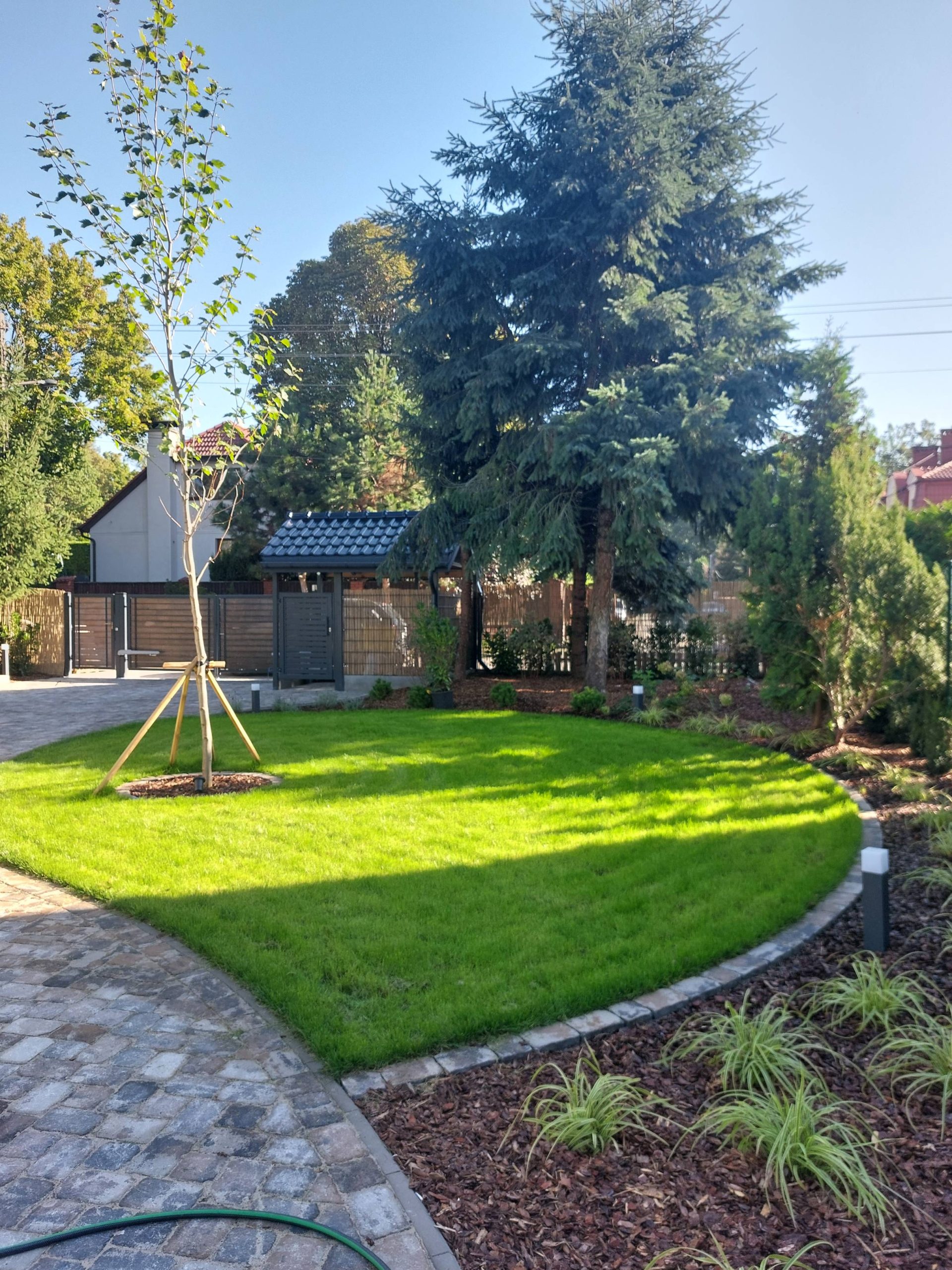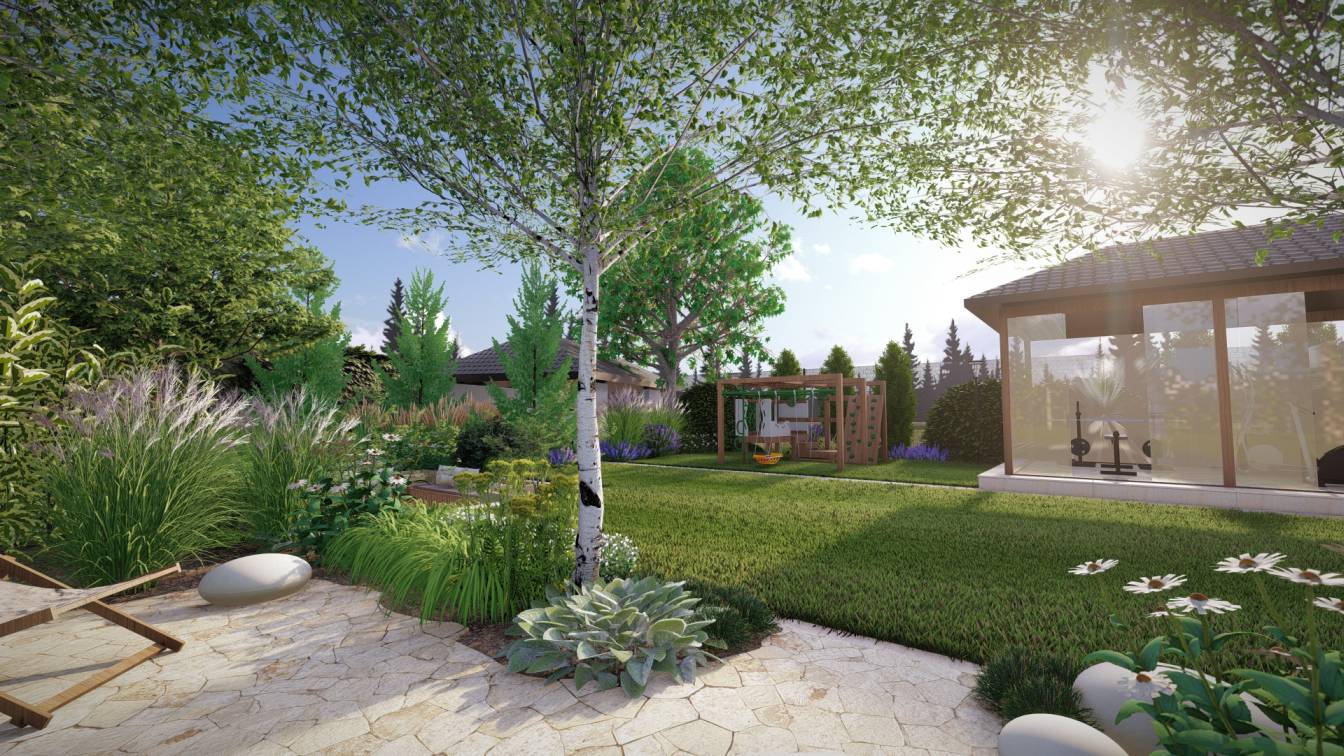Główny trawnik pozostawiono możliwie duży, z myślą o zabawach dzieci.