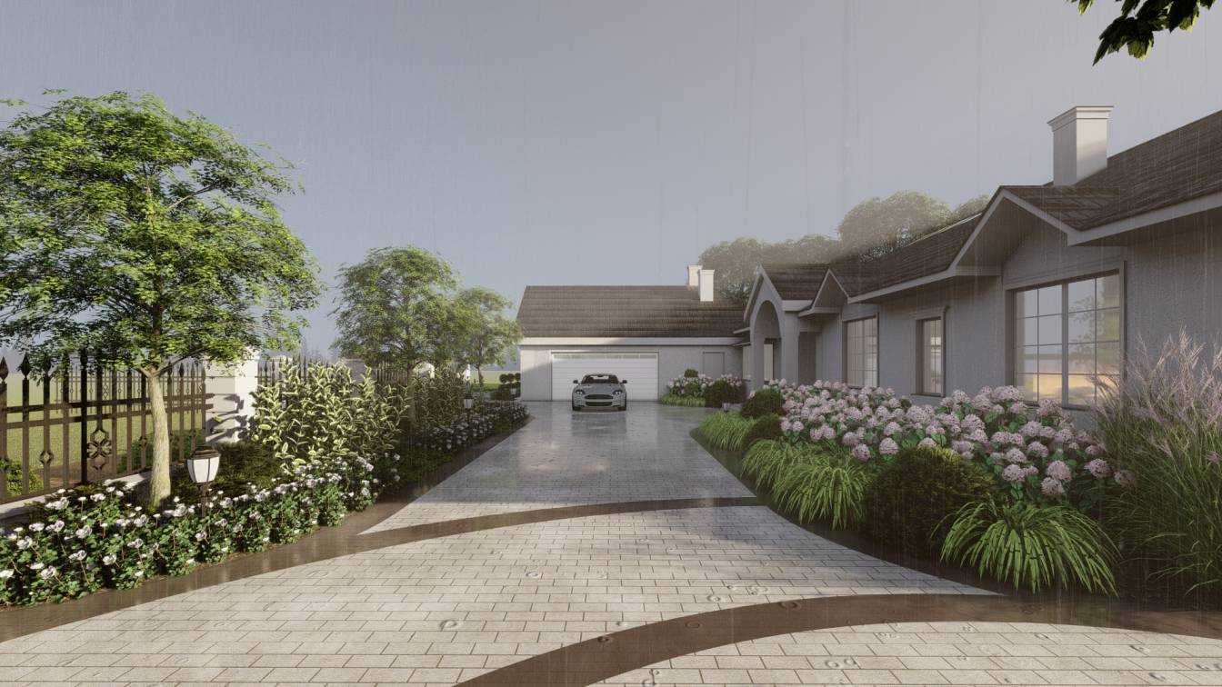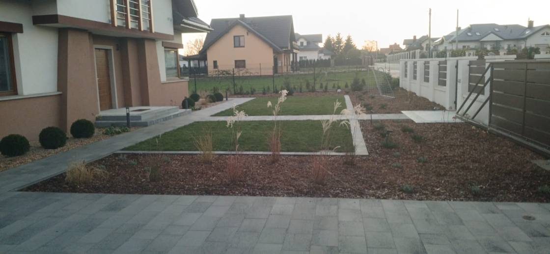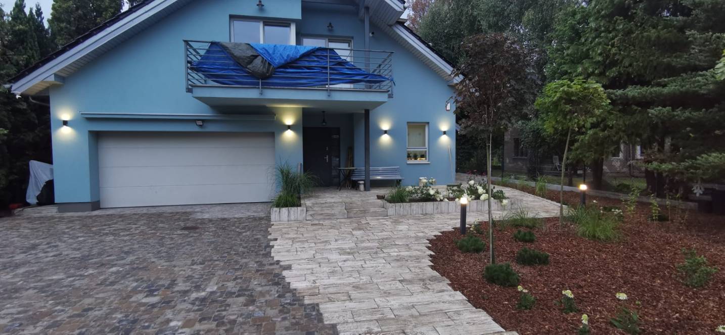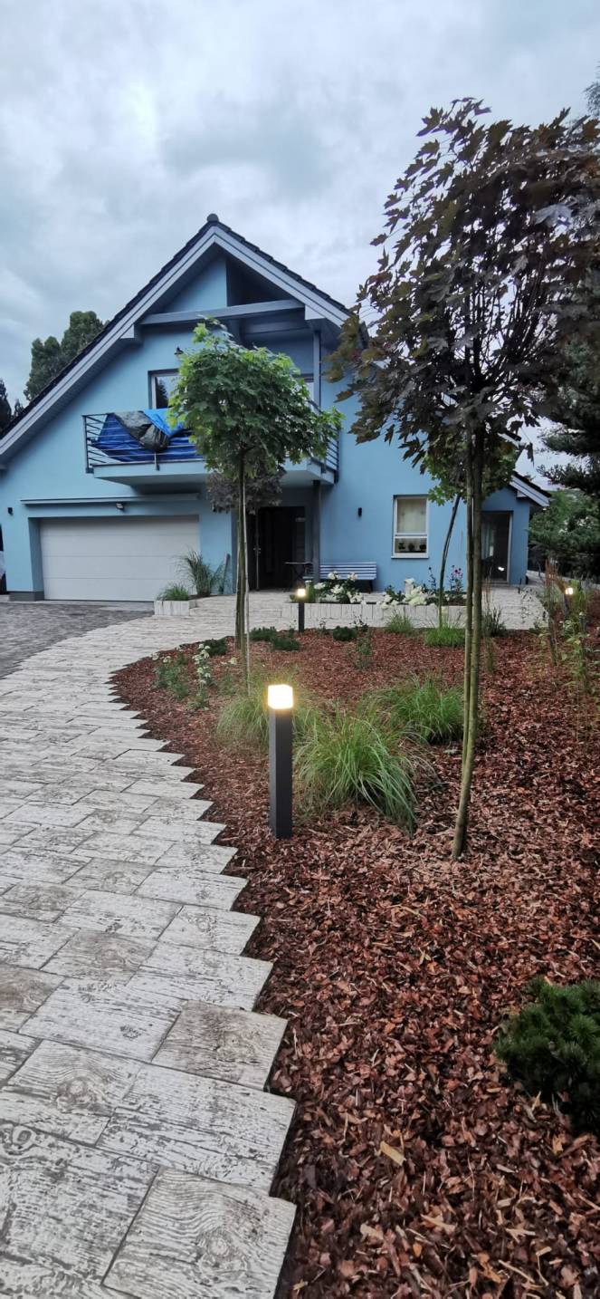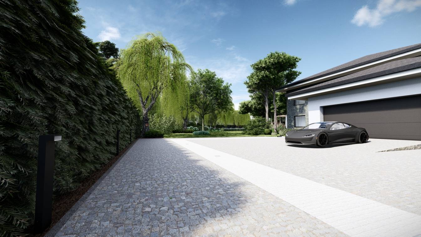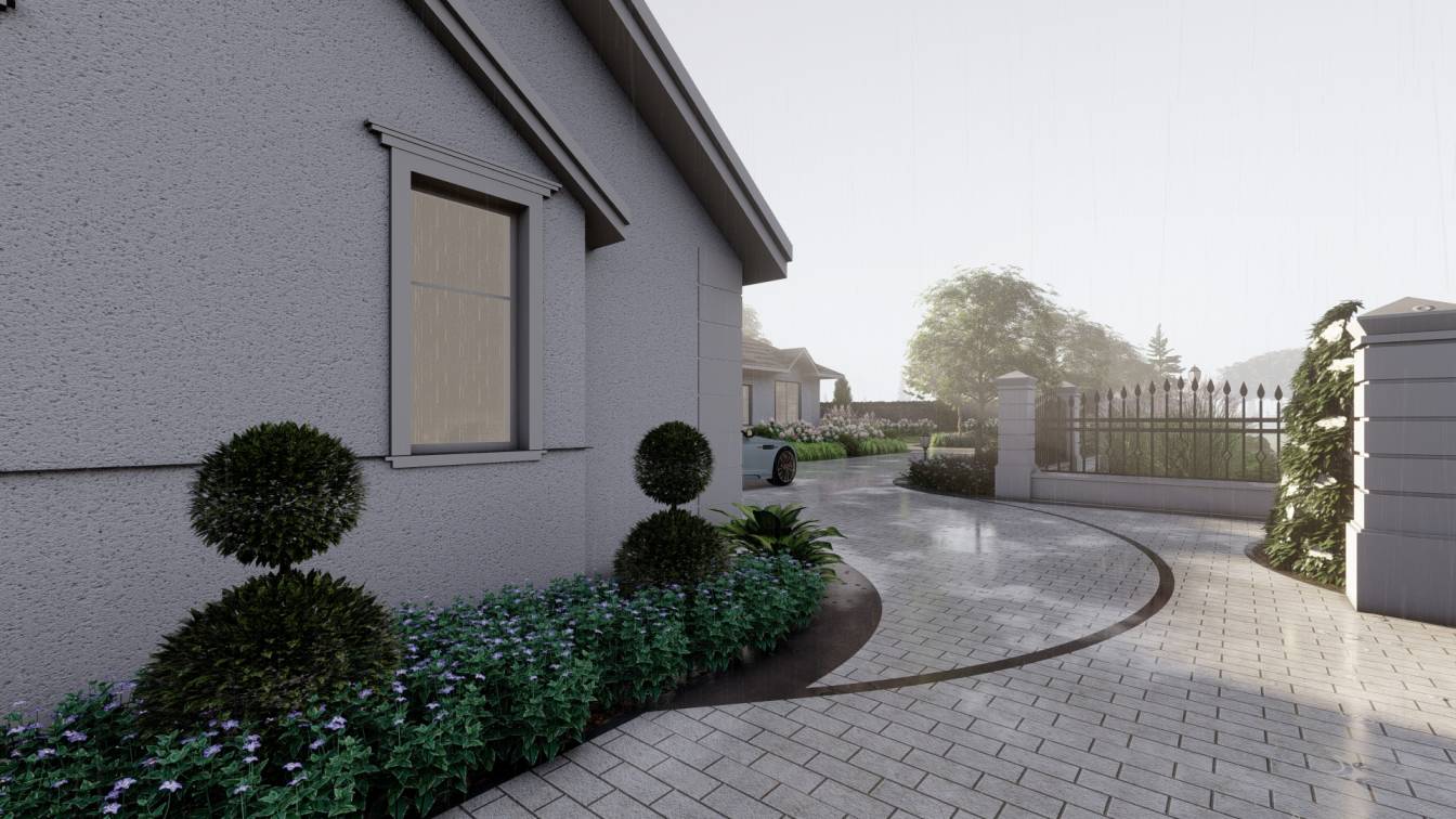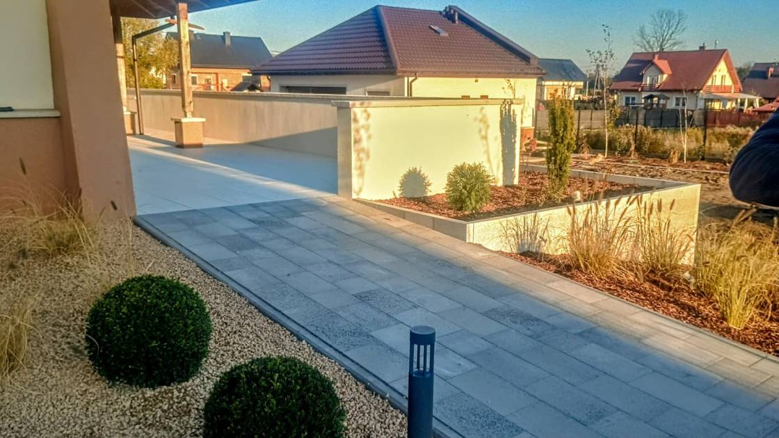 Właścicielom zależało na opracowaniu najbliższego otoczenia domu, wraz z podjazdem i tarasem.
