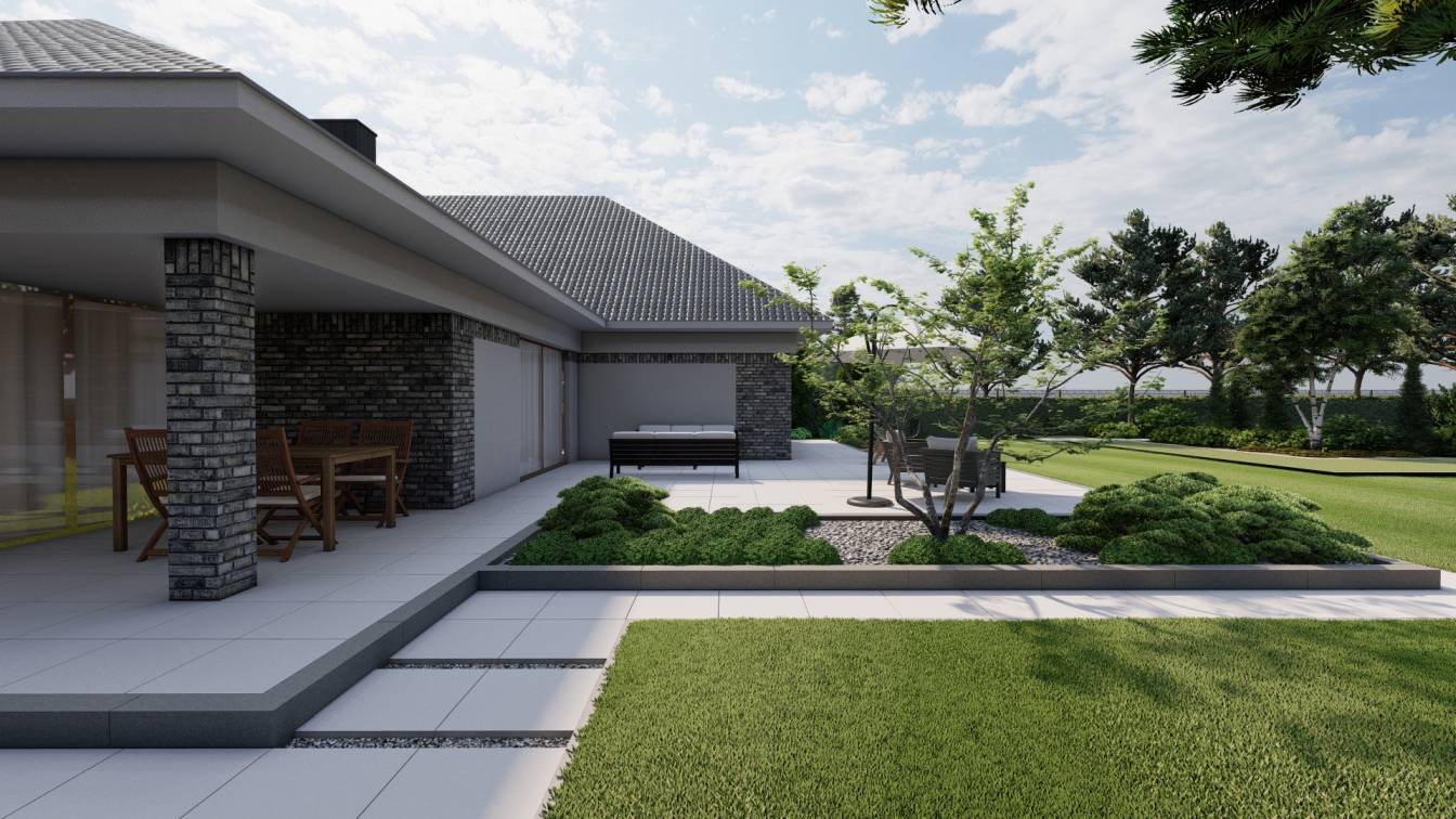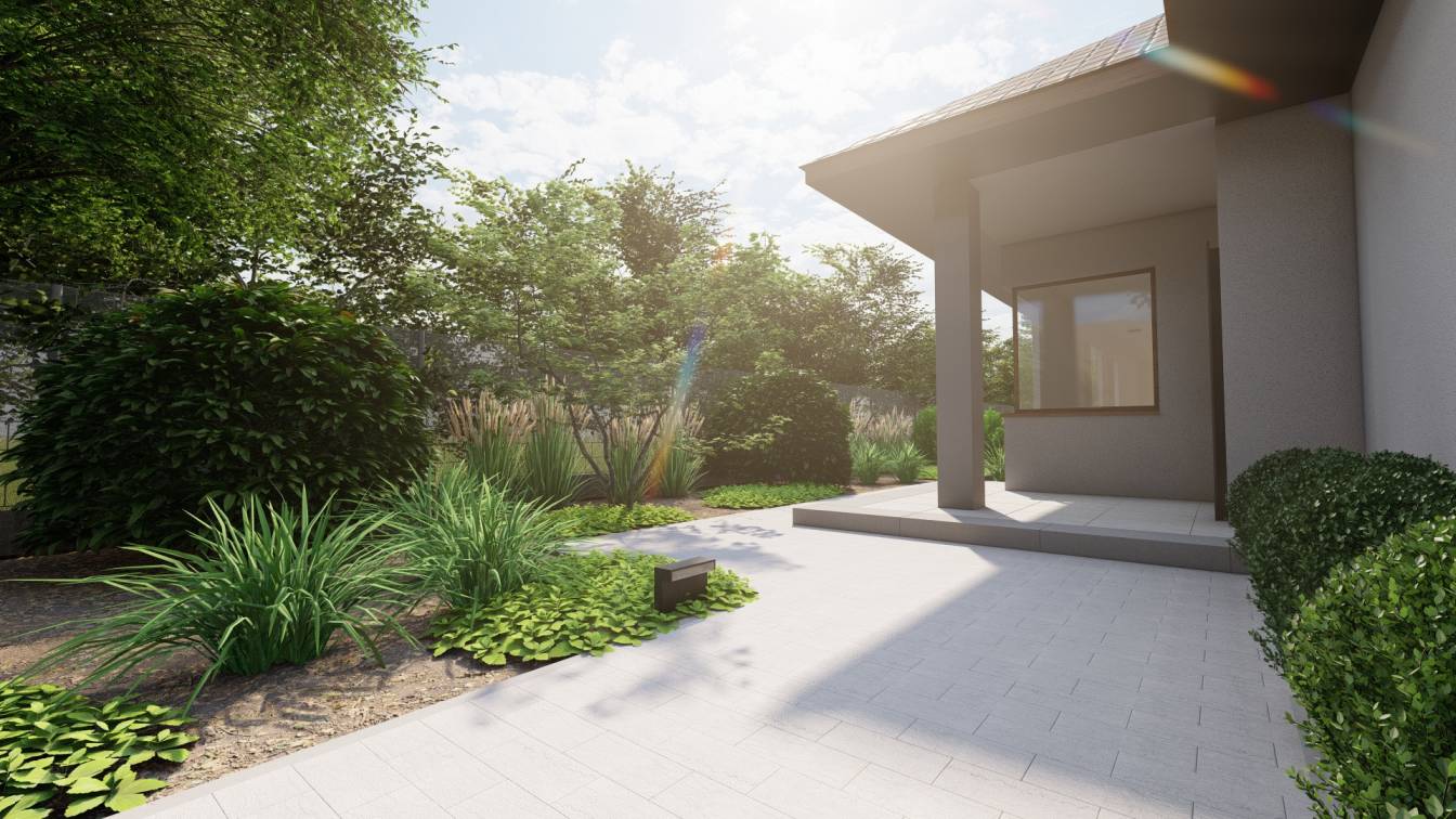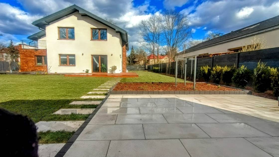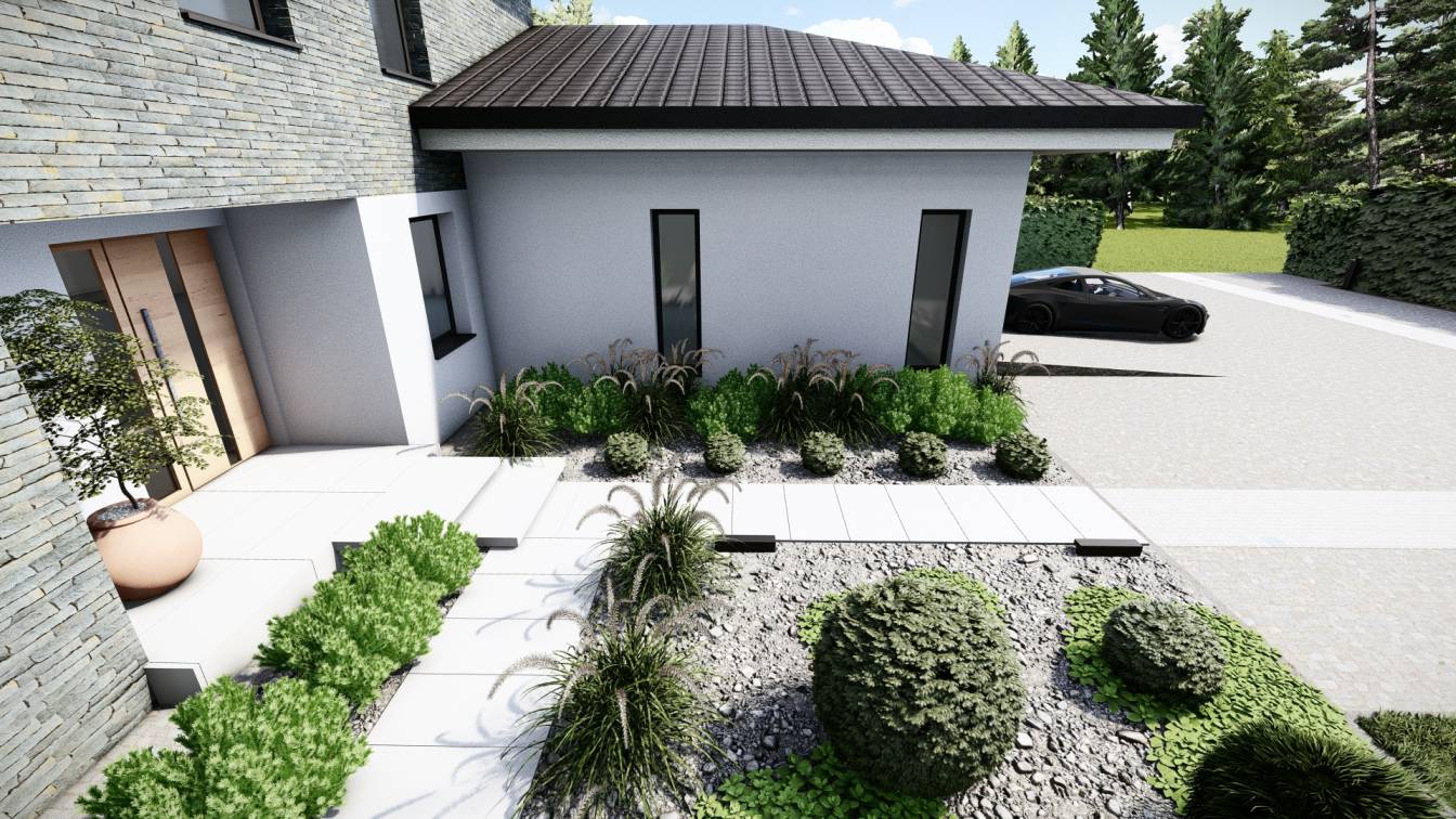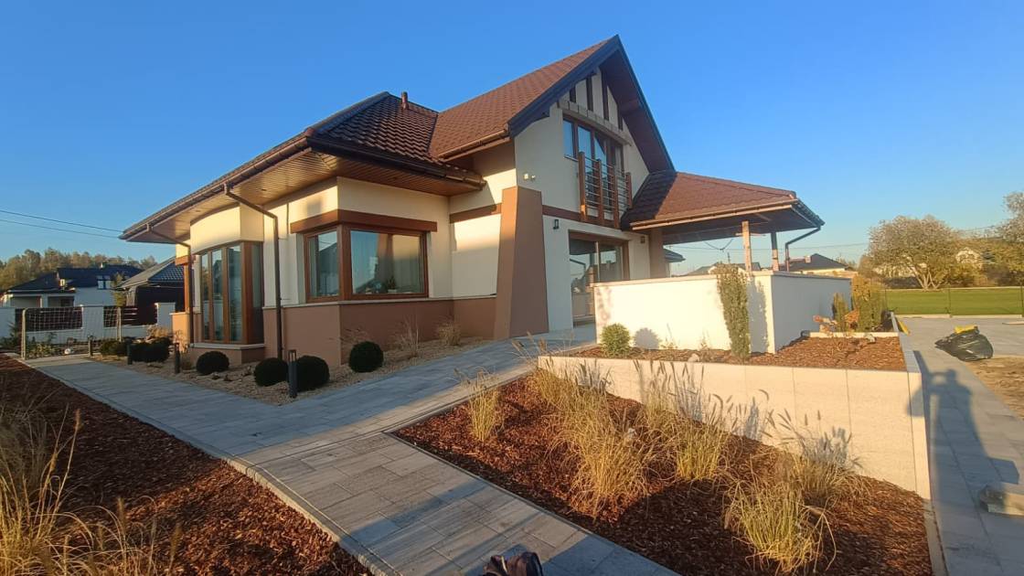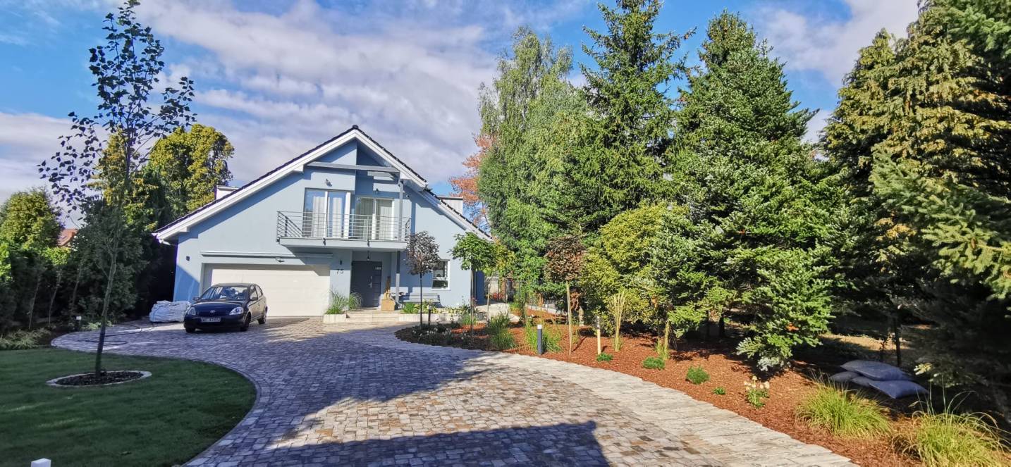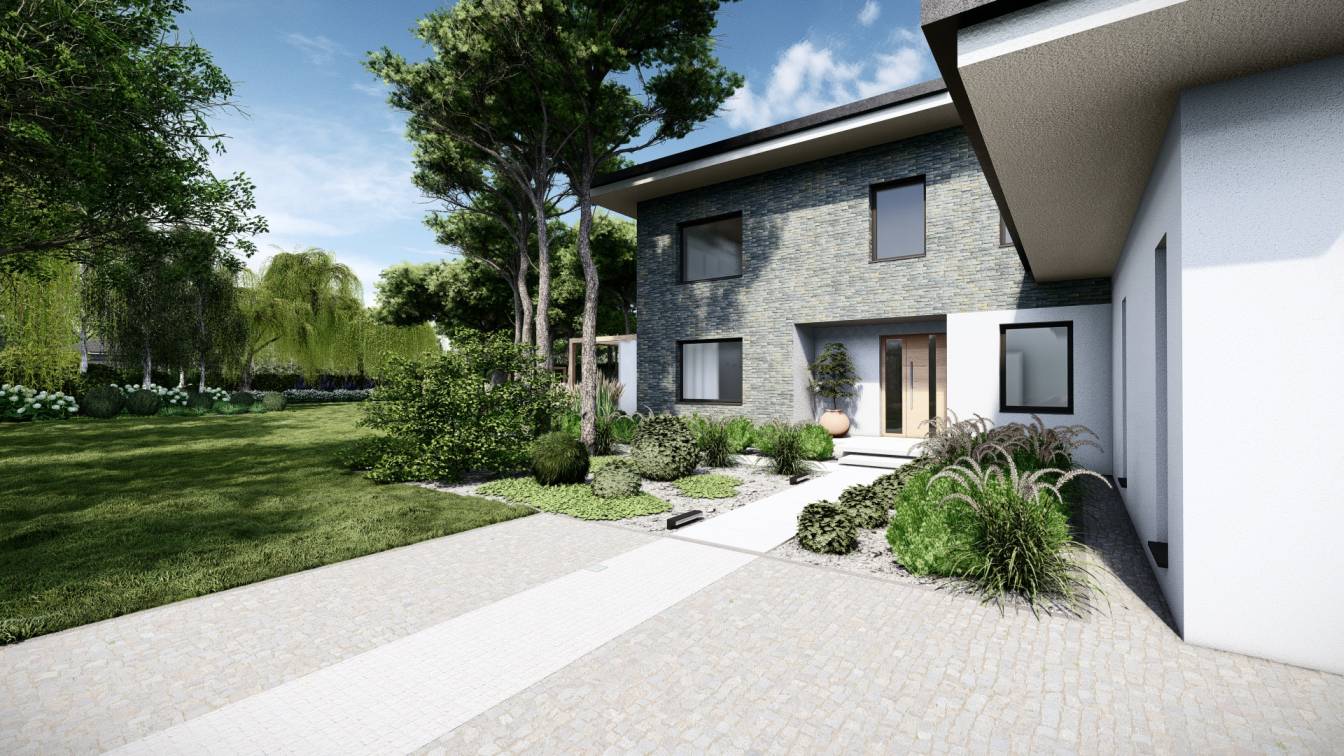 Właścicielom zależało na opracowaniu najbliższego otoczenia domu, wraz z podjazdem i tarasem.