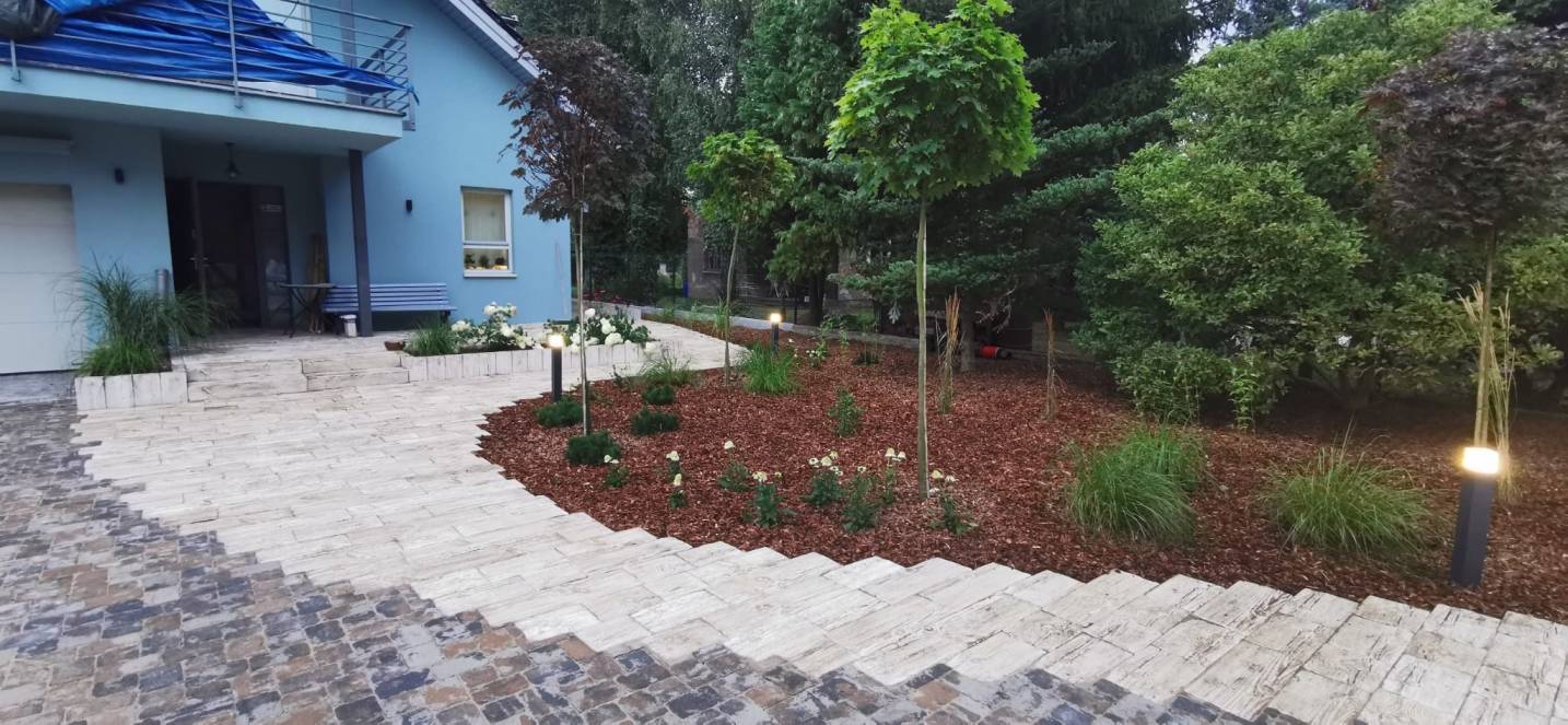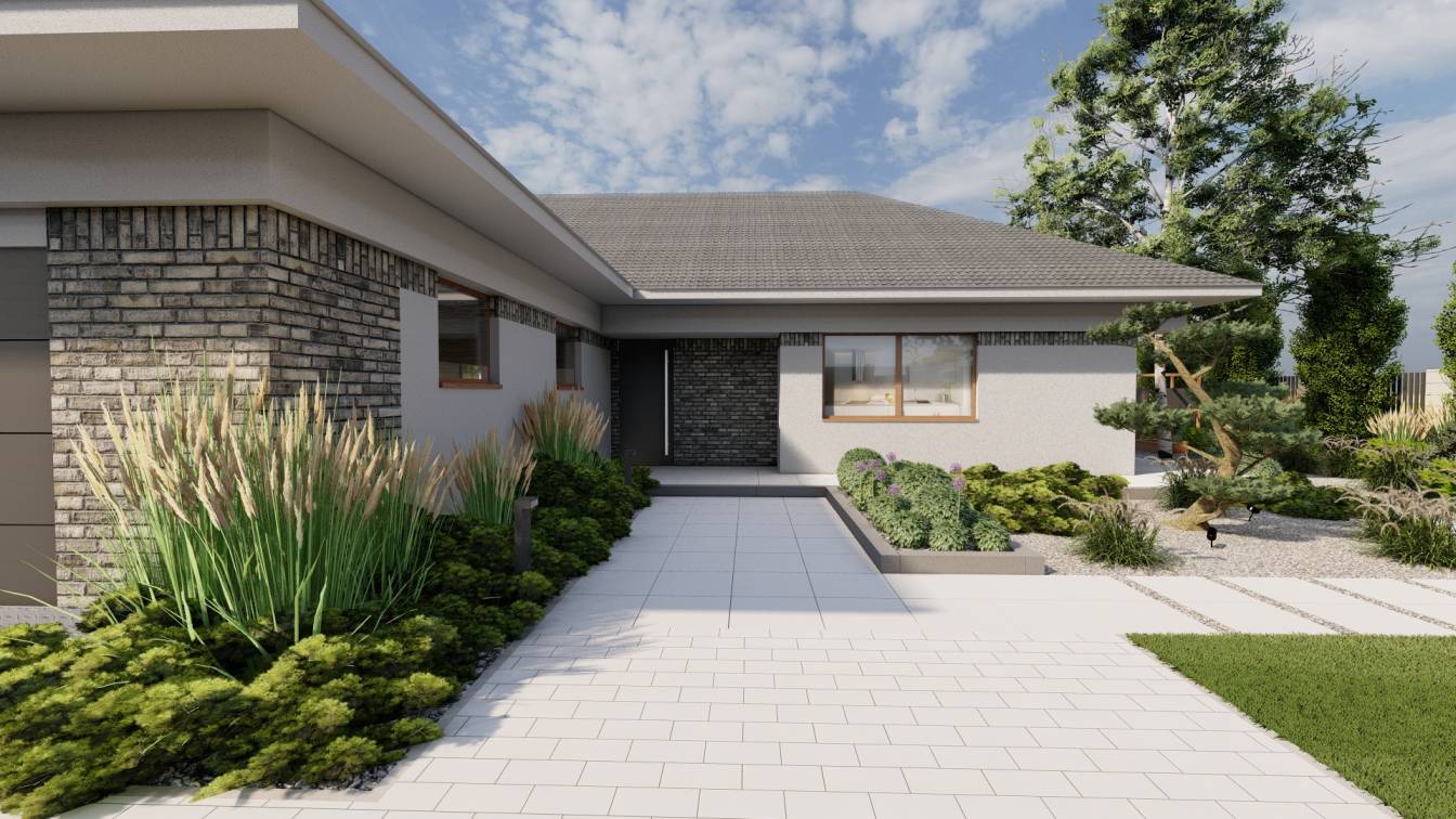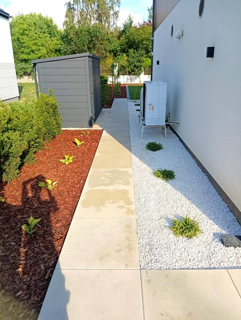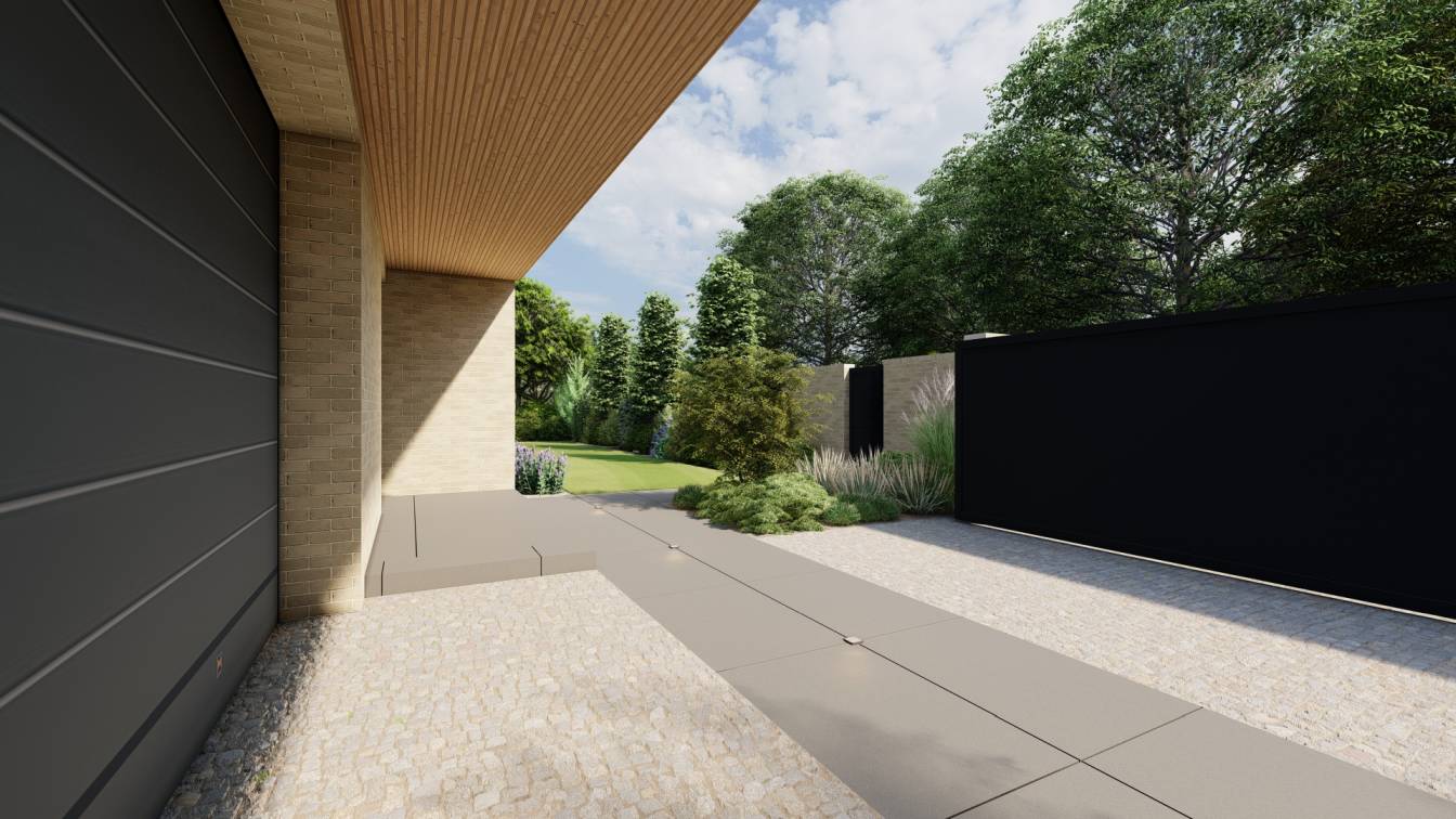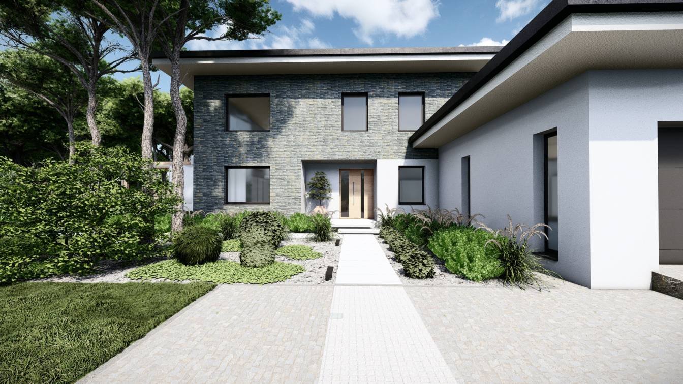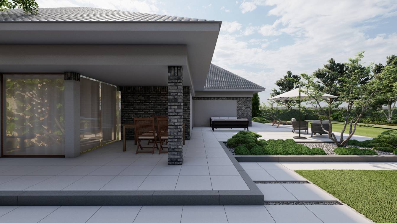 Właścicielom zależało na opracowaniu najbliższego otoczenia domu, wraz z podjazdem i tarasem.