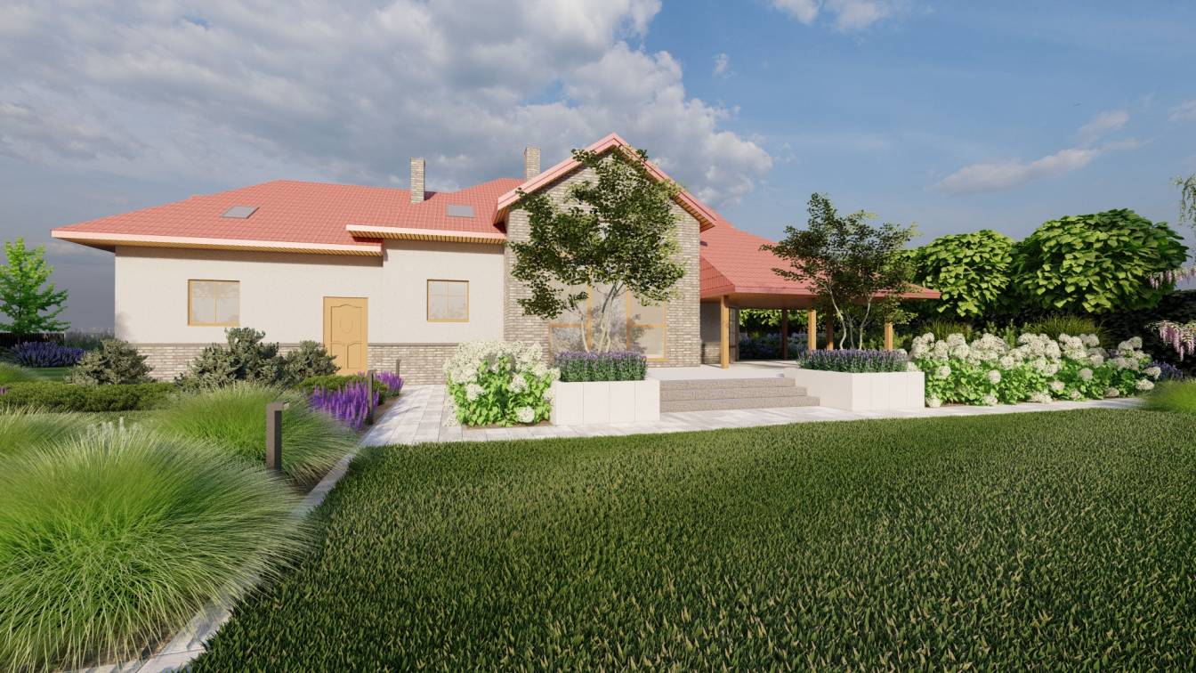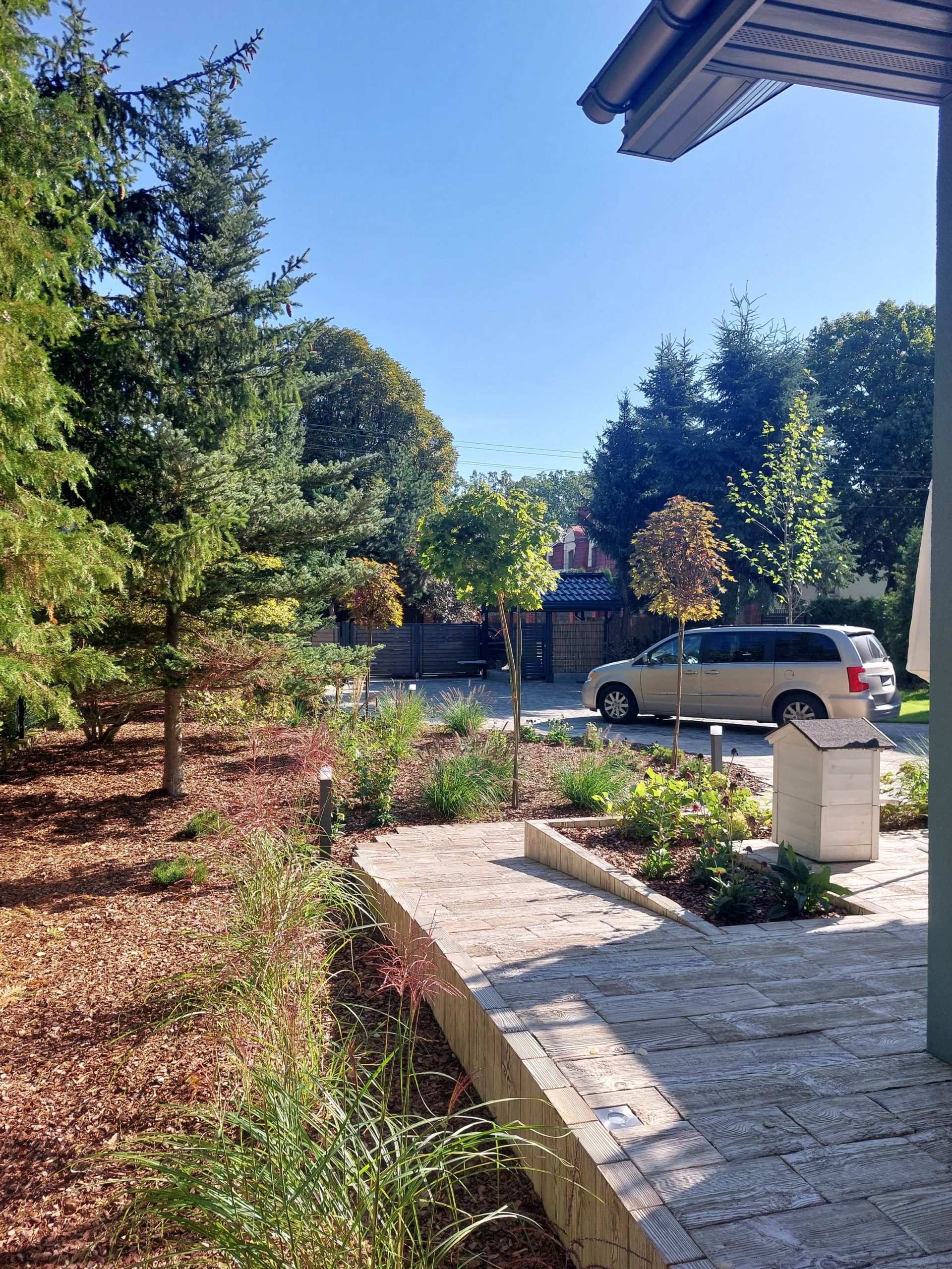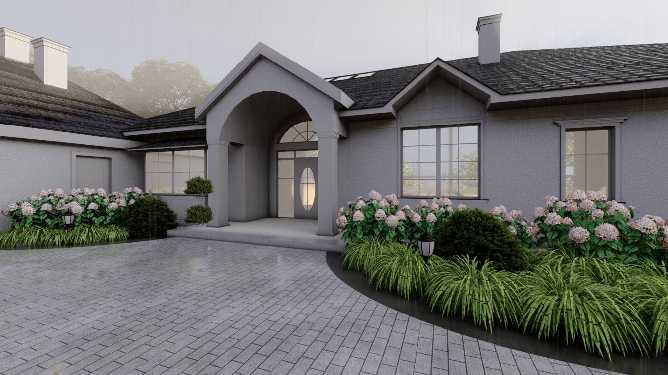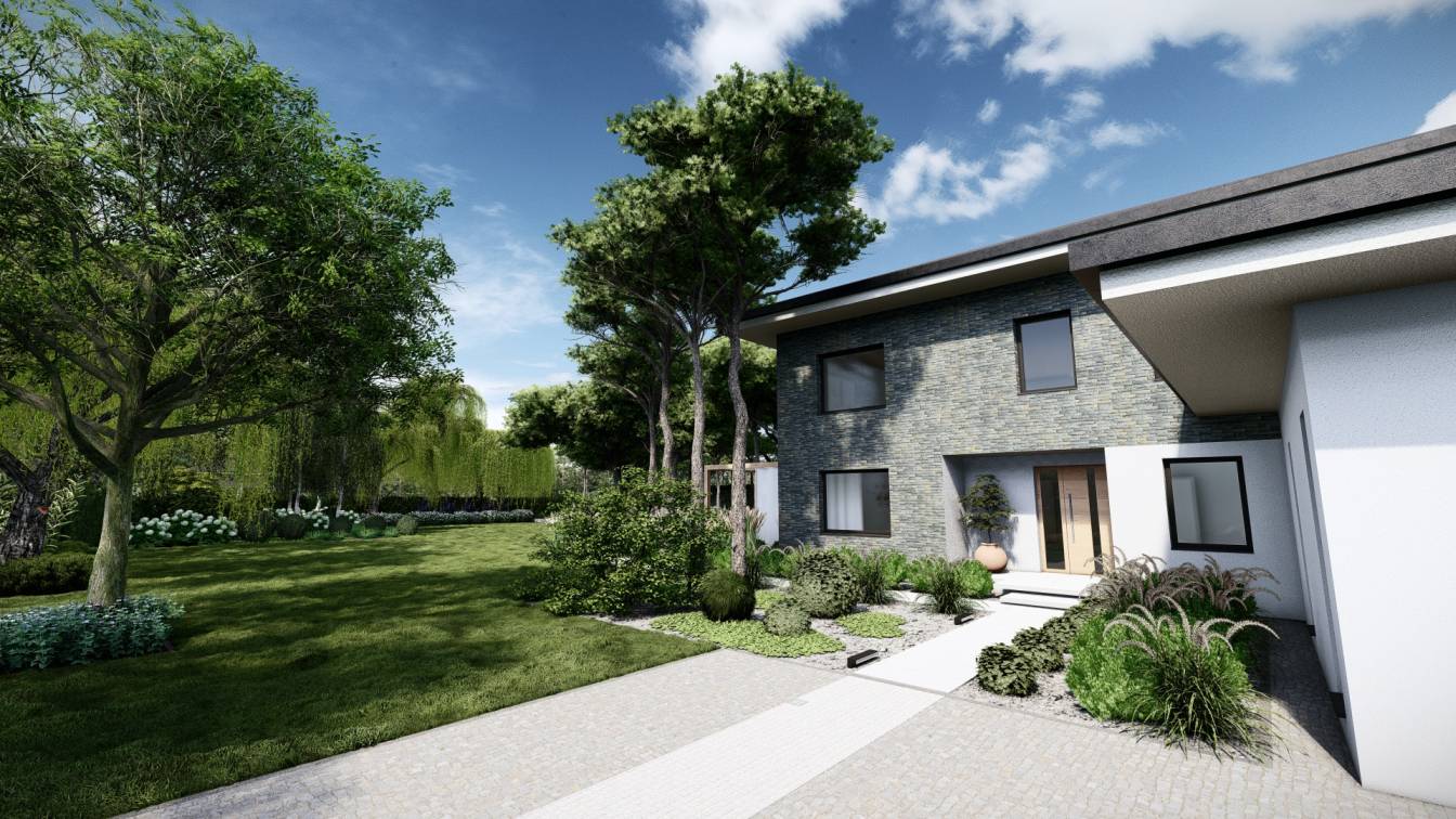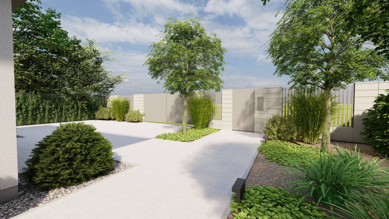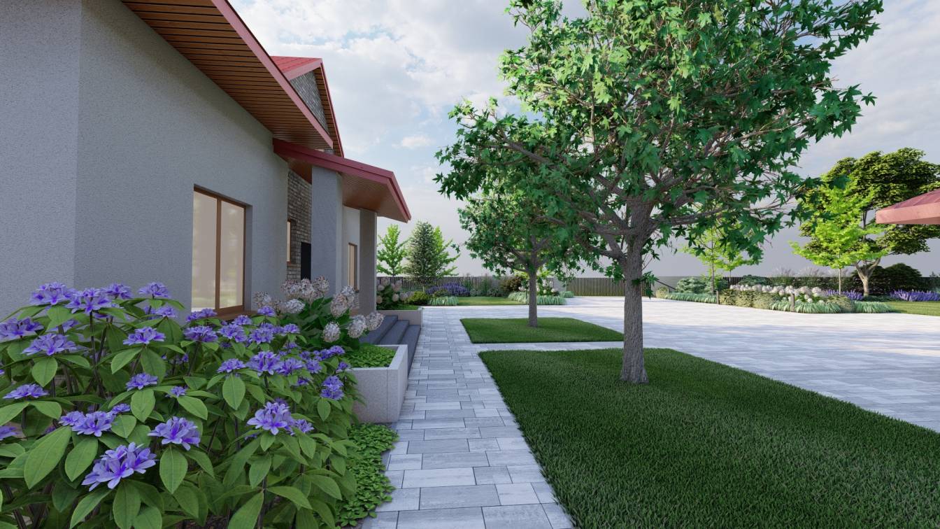 Właścicielom zależało na opracowaniu najbliższego otoczenia domu, wraz z podjazdem i tarasem.
