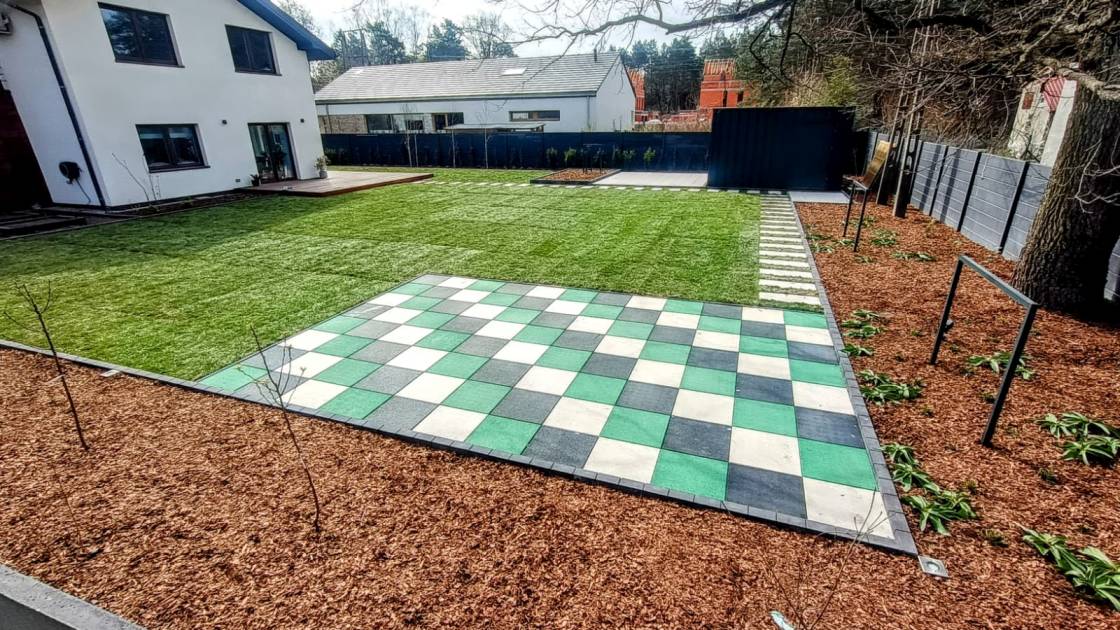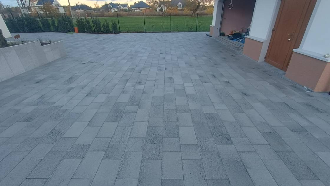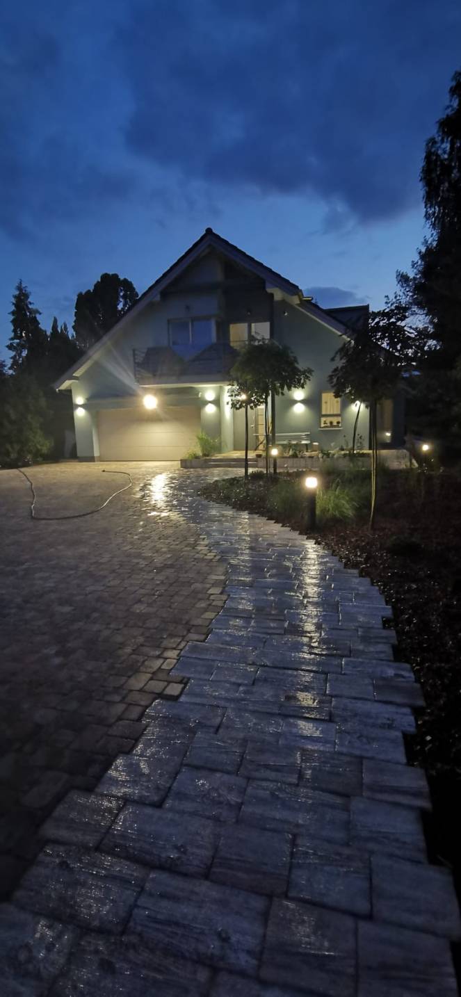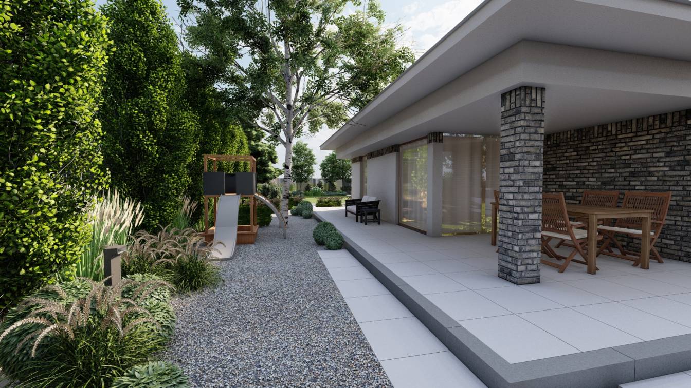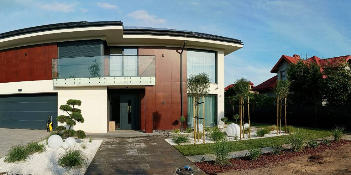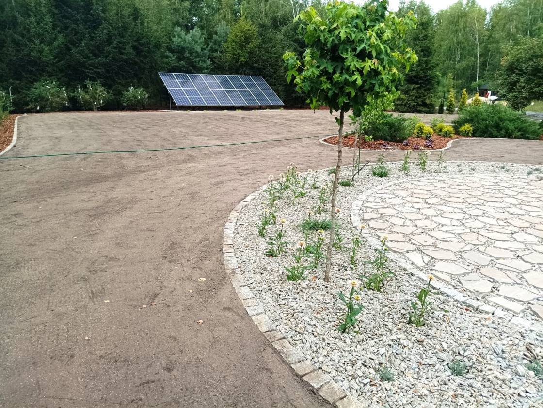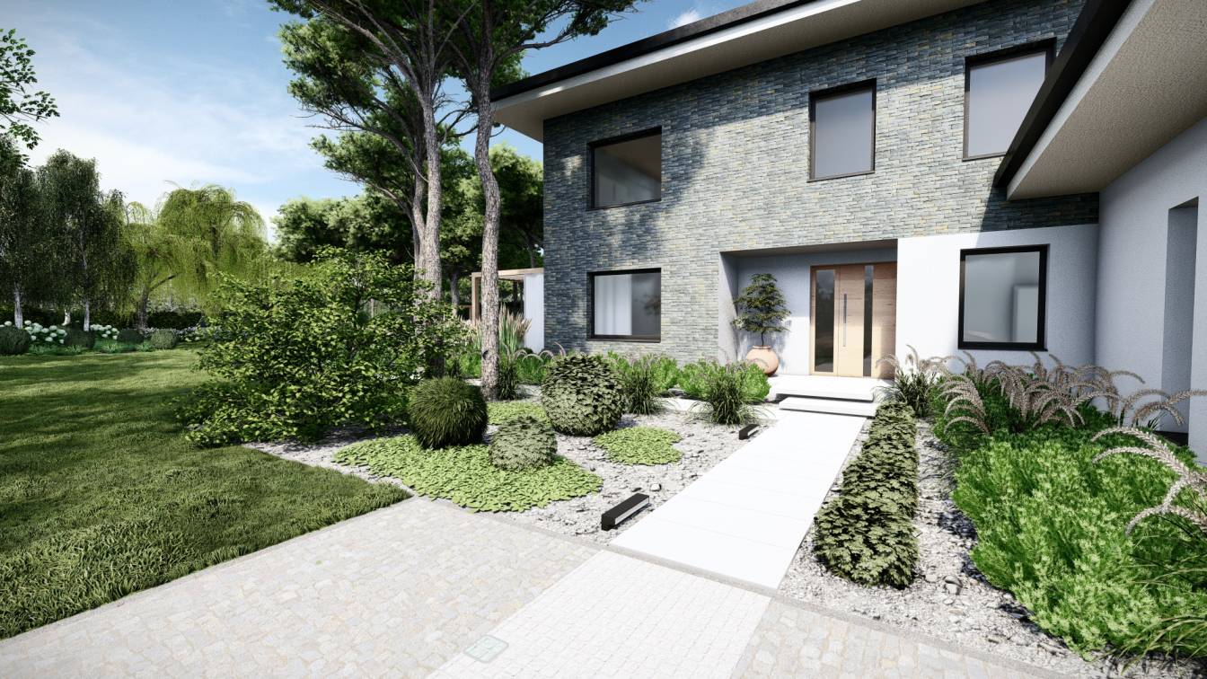 Właścicielom zależało na opracowaniu najbliższego otoczenia domu, wraz z podjazdem i tarasem.