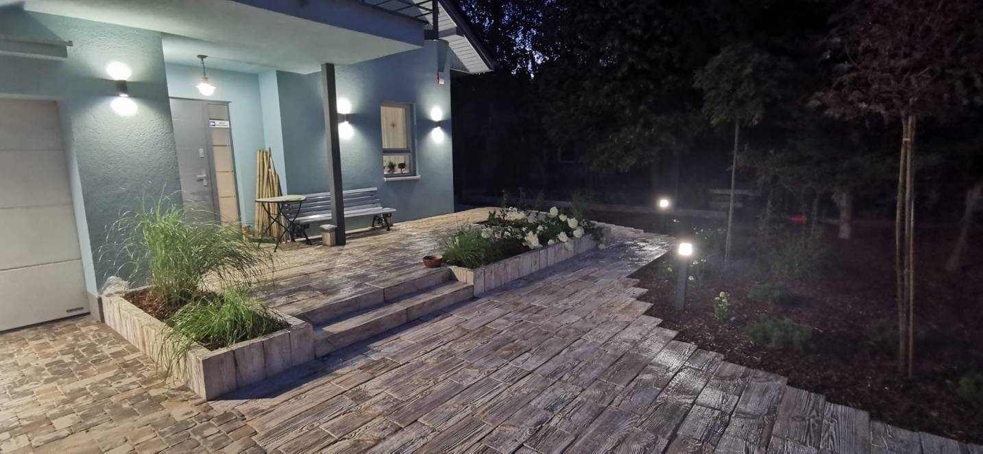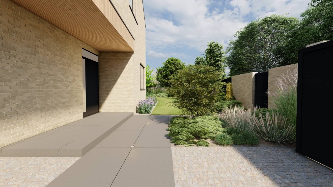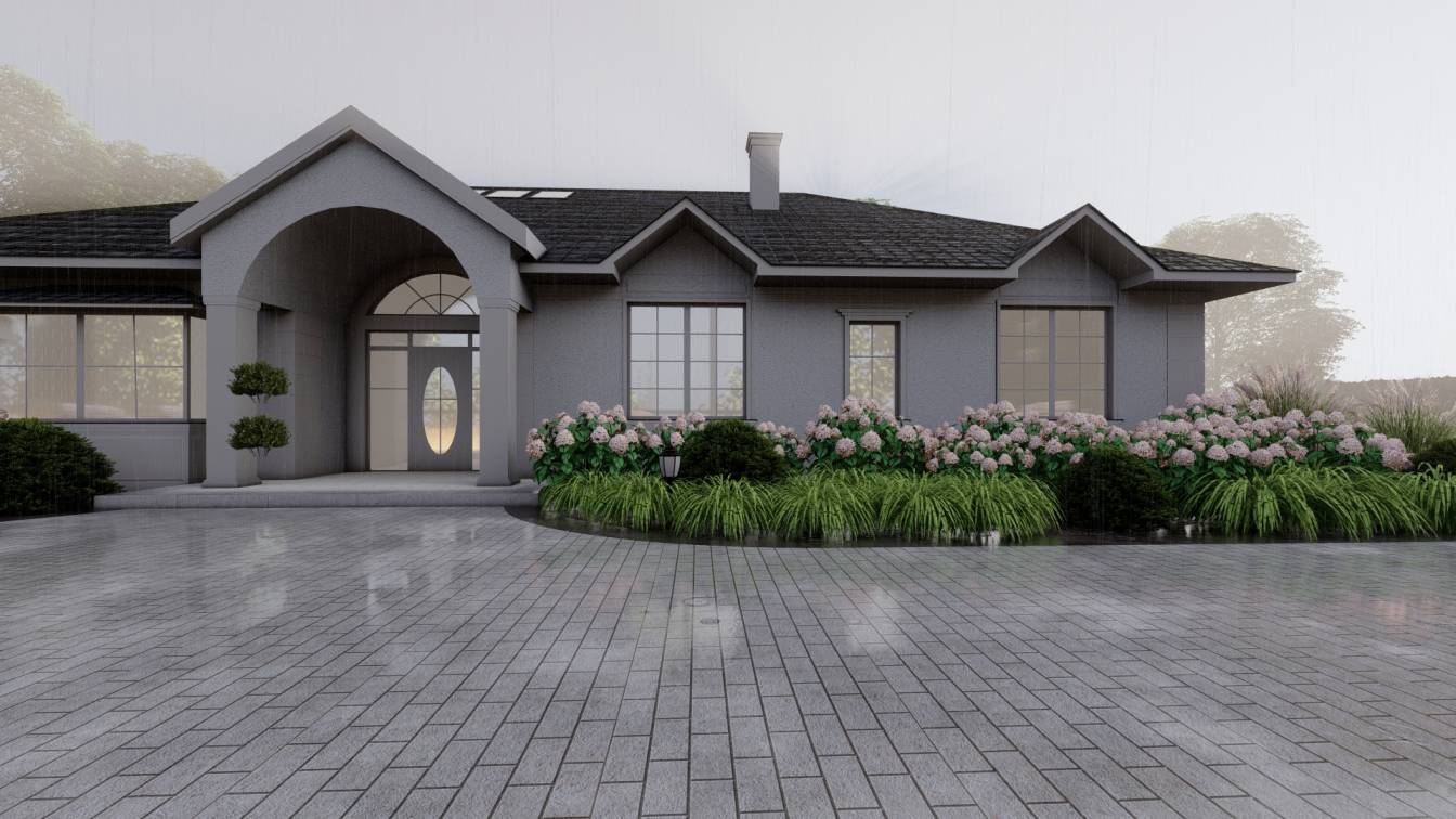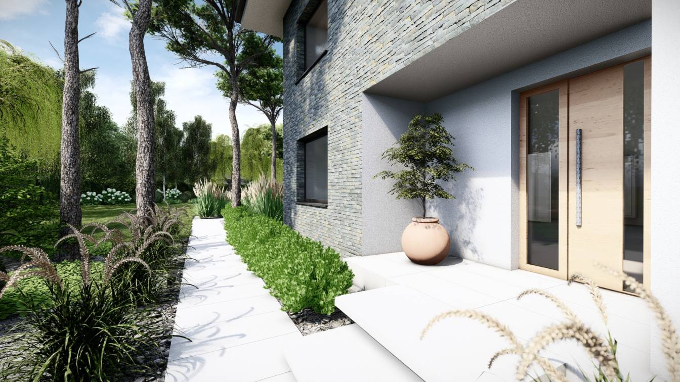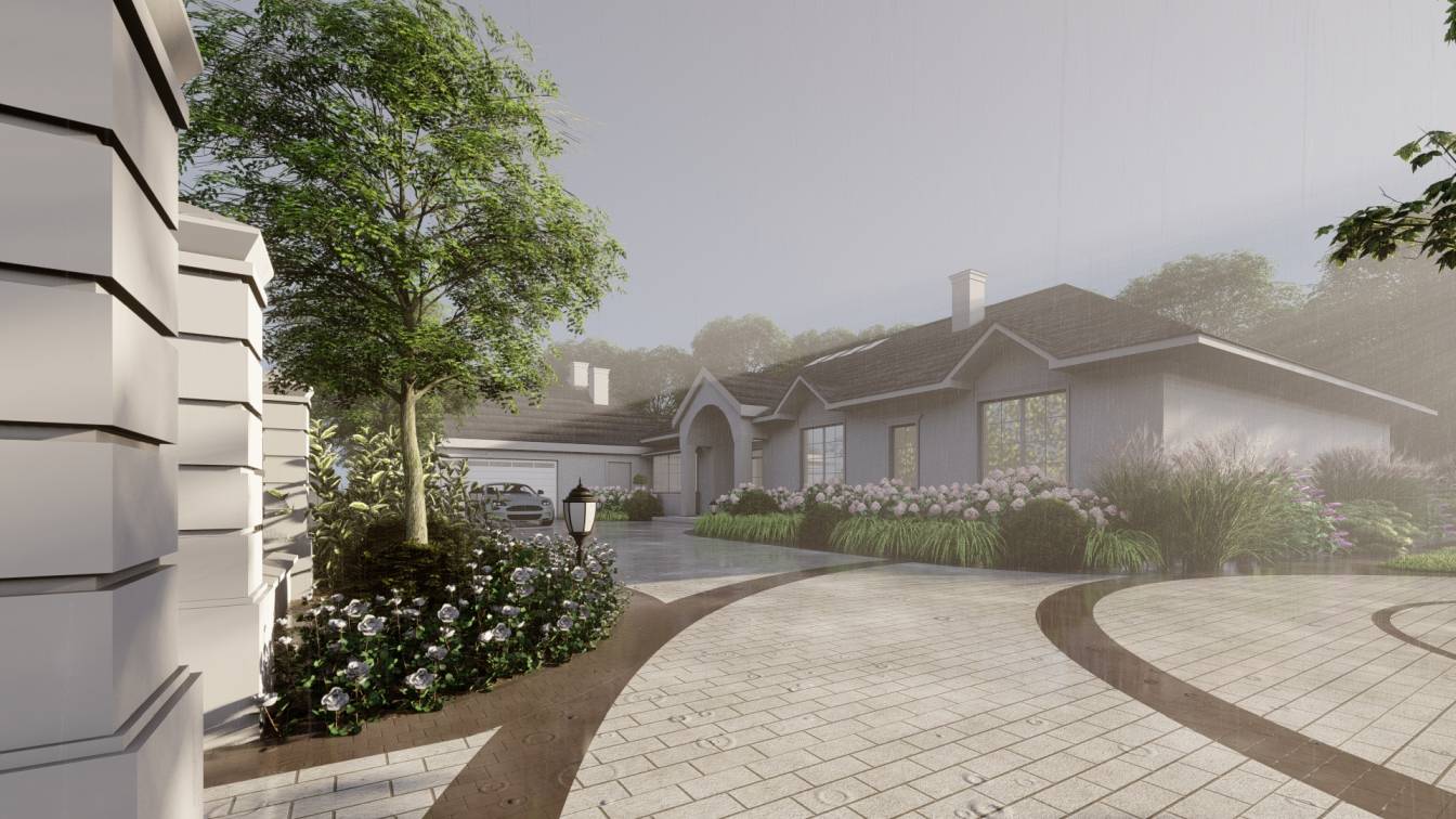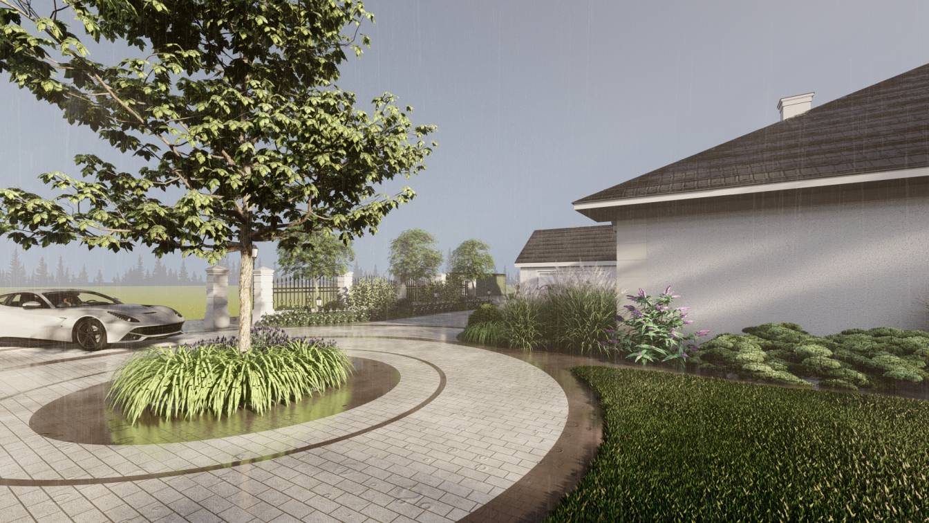 Właścicielom zależało na opracowaniu najbliższego otoczenia domu, wraz z podjazdem i tarasem.