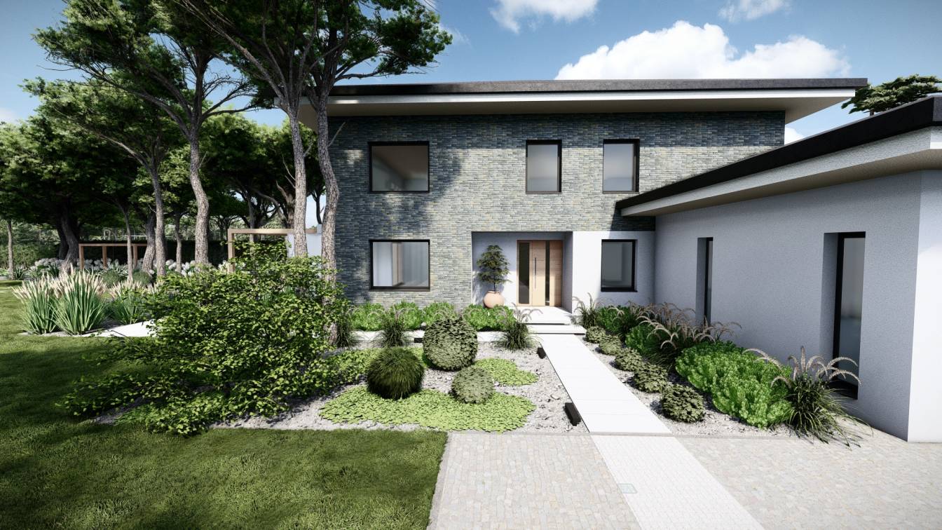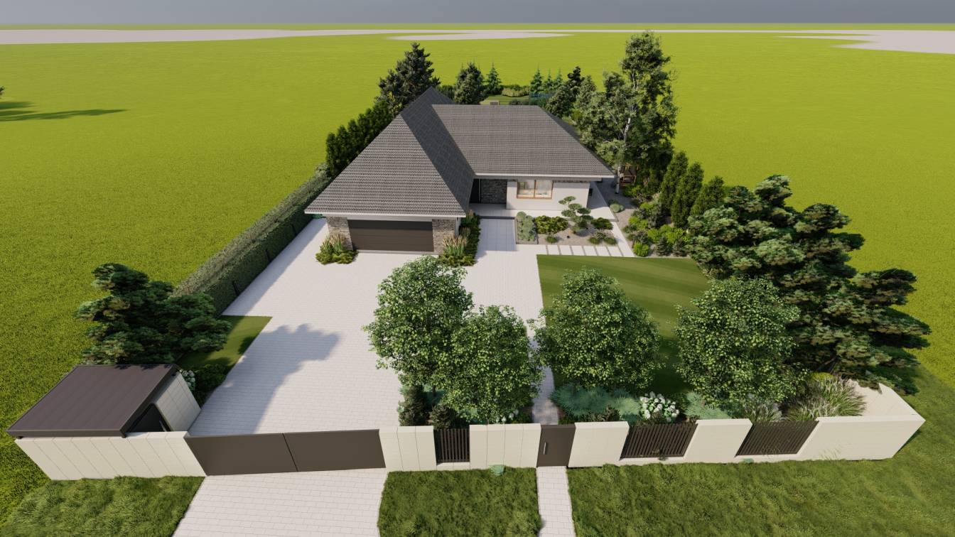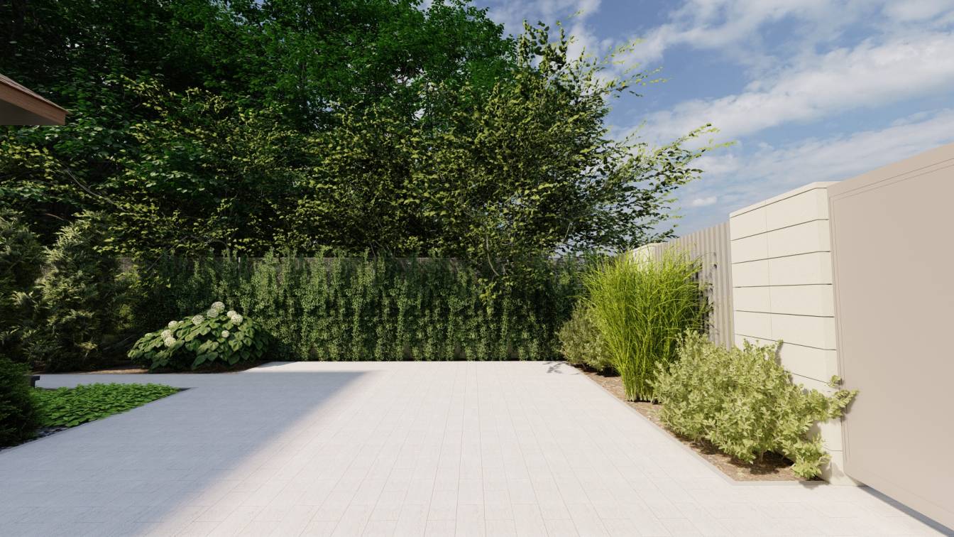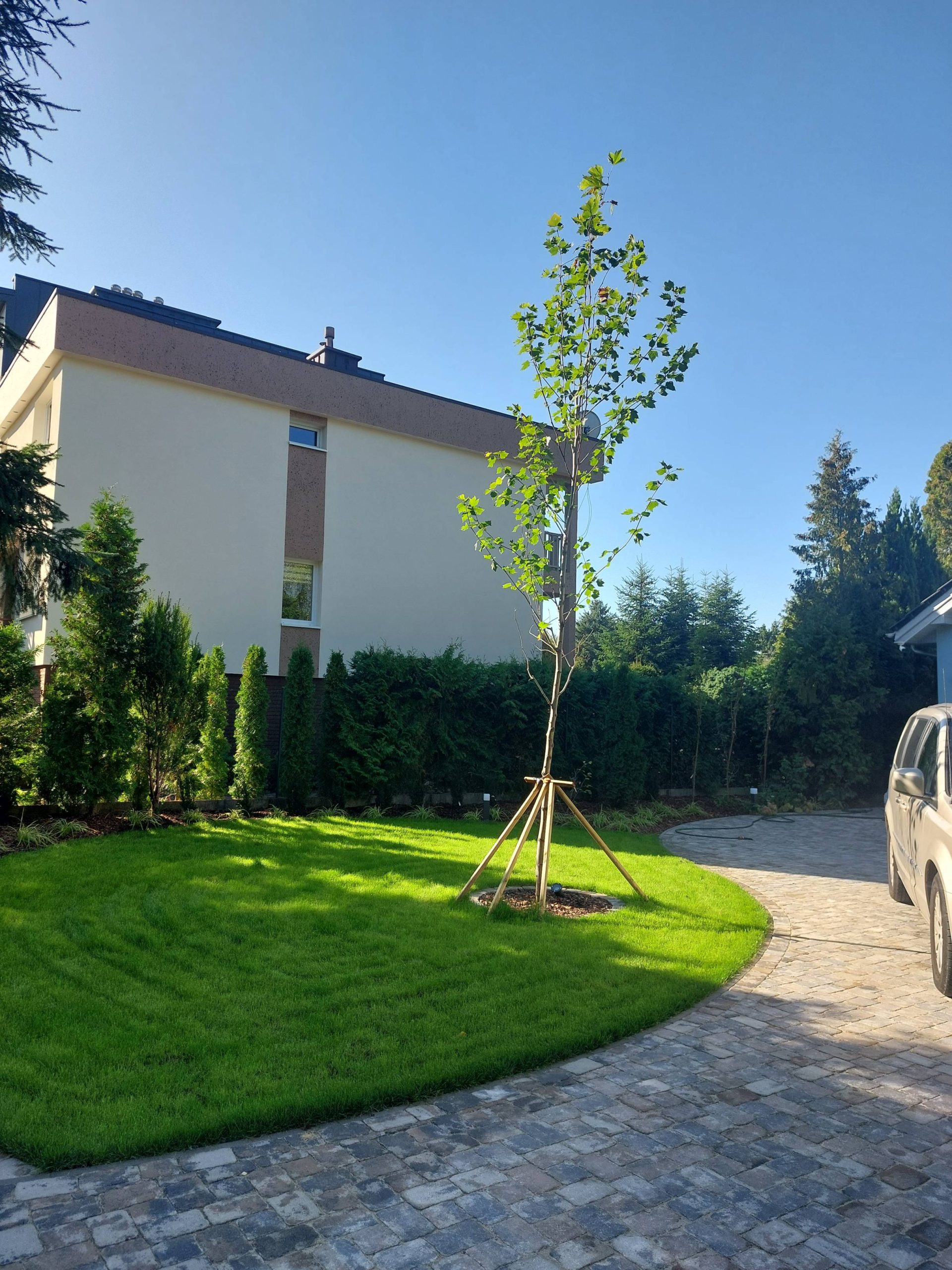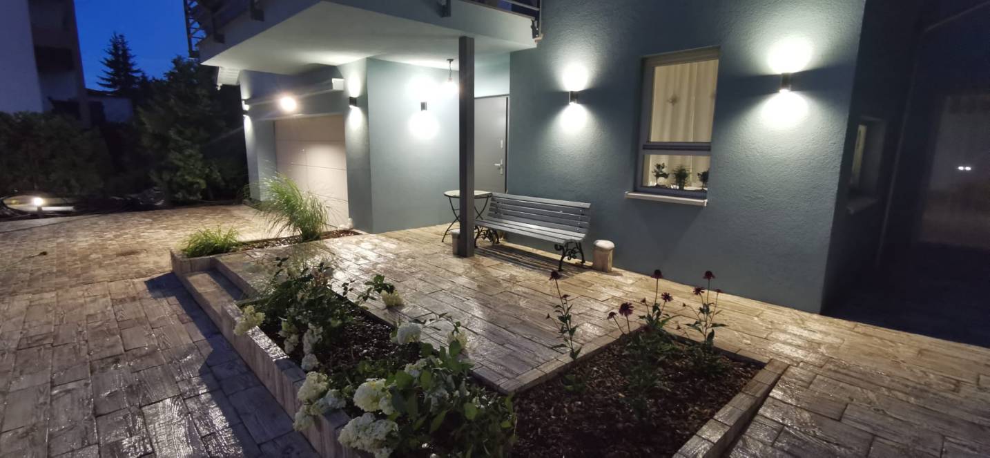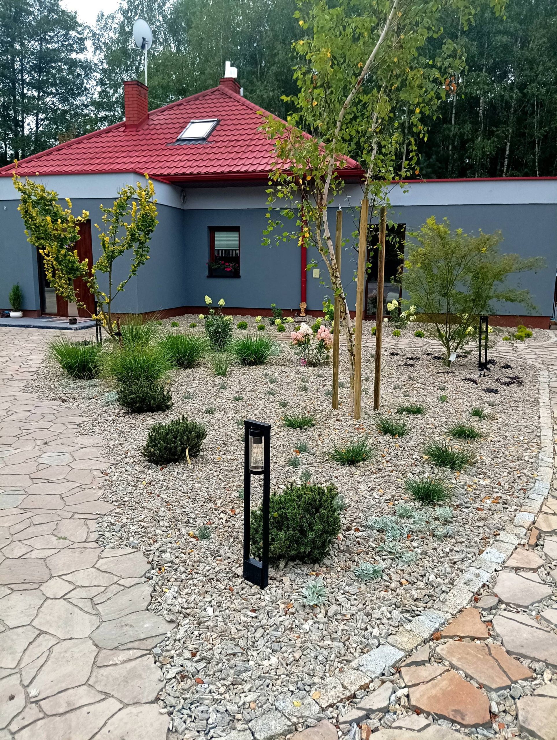 Właścicielom zależało na opracowaniu najbliższego otoczenia domu, wraz z podjazdem i tarasem.