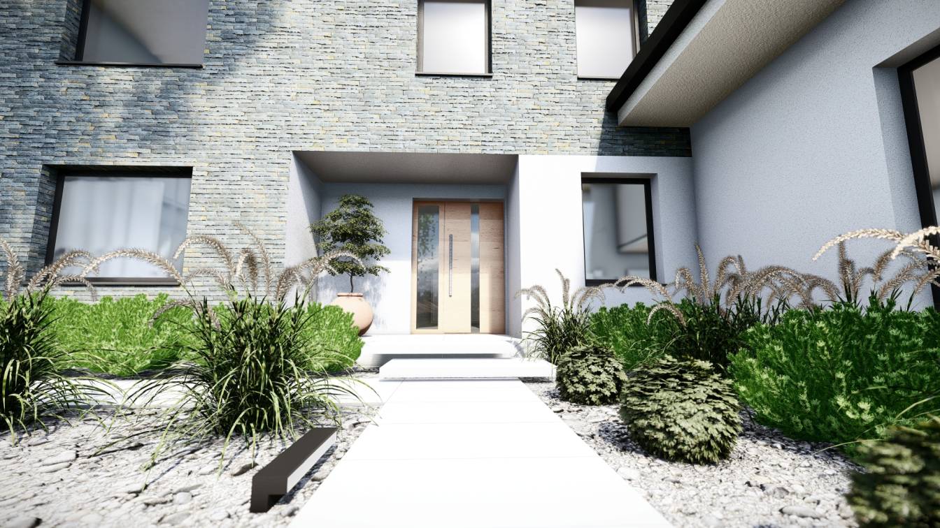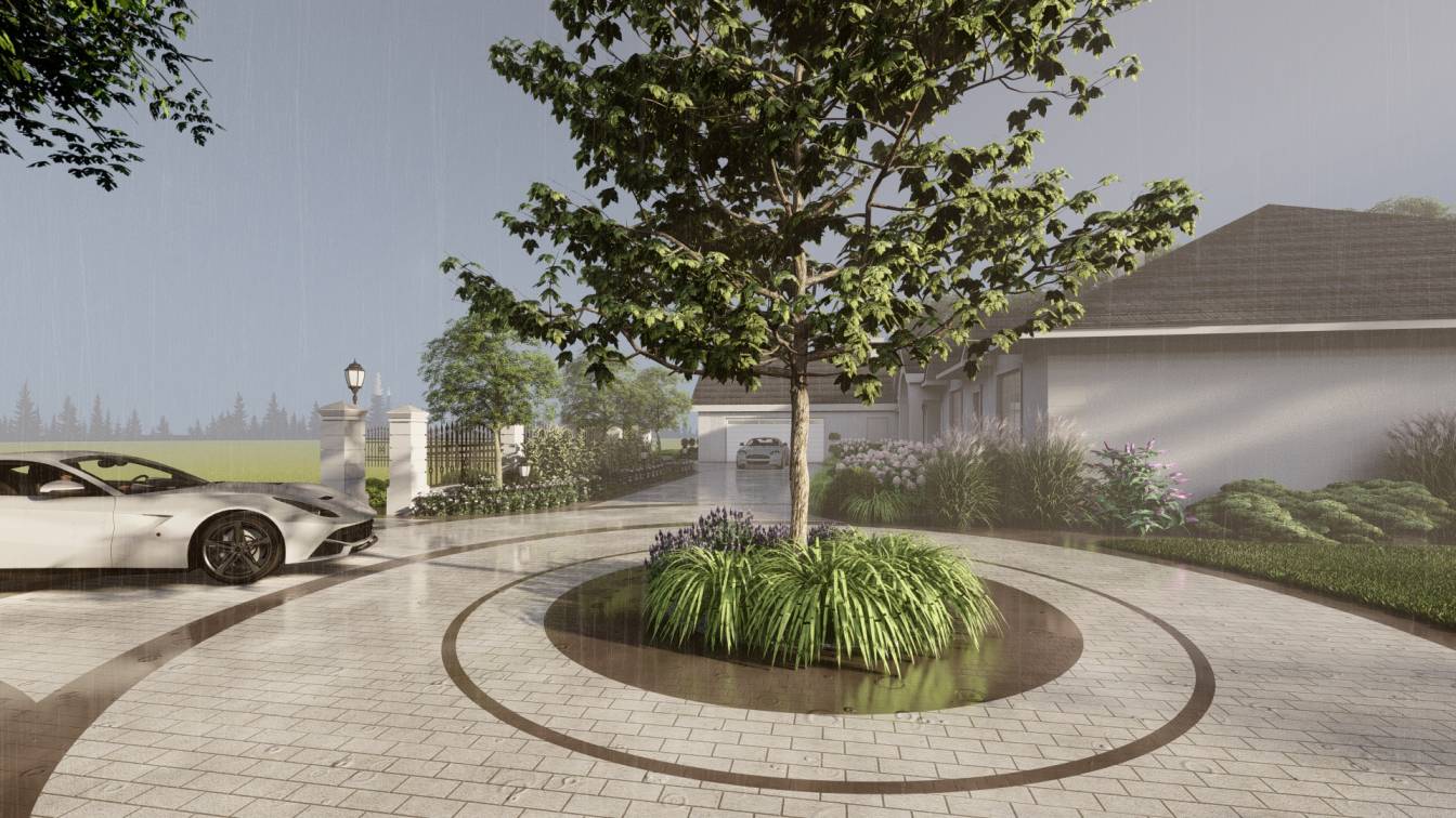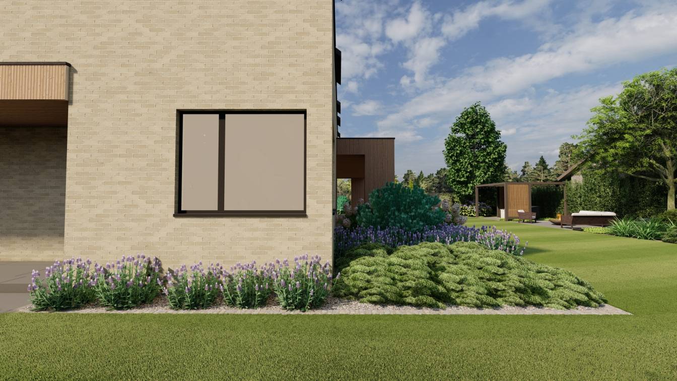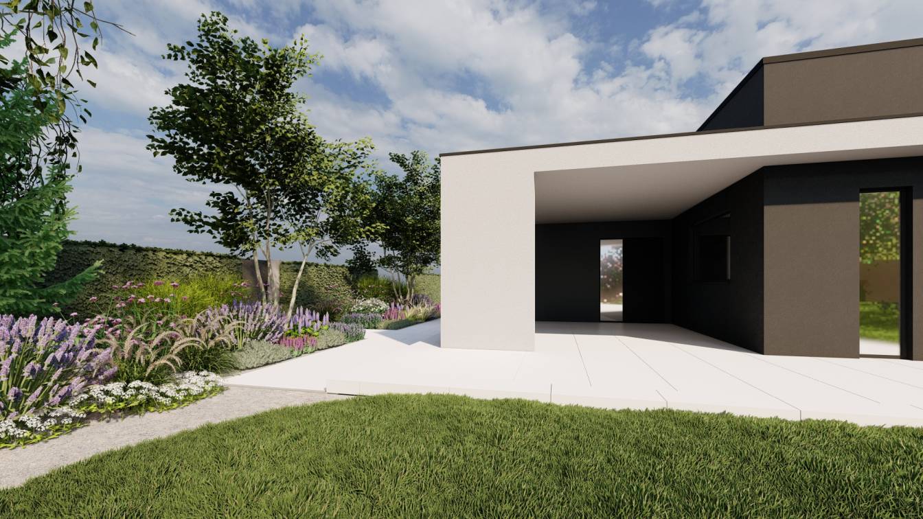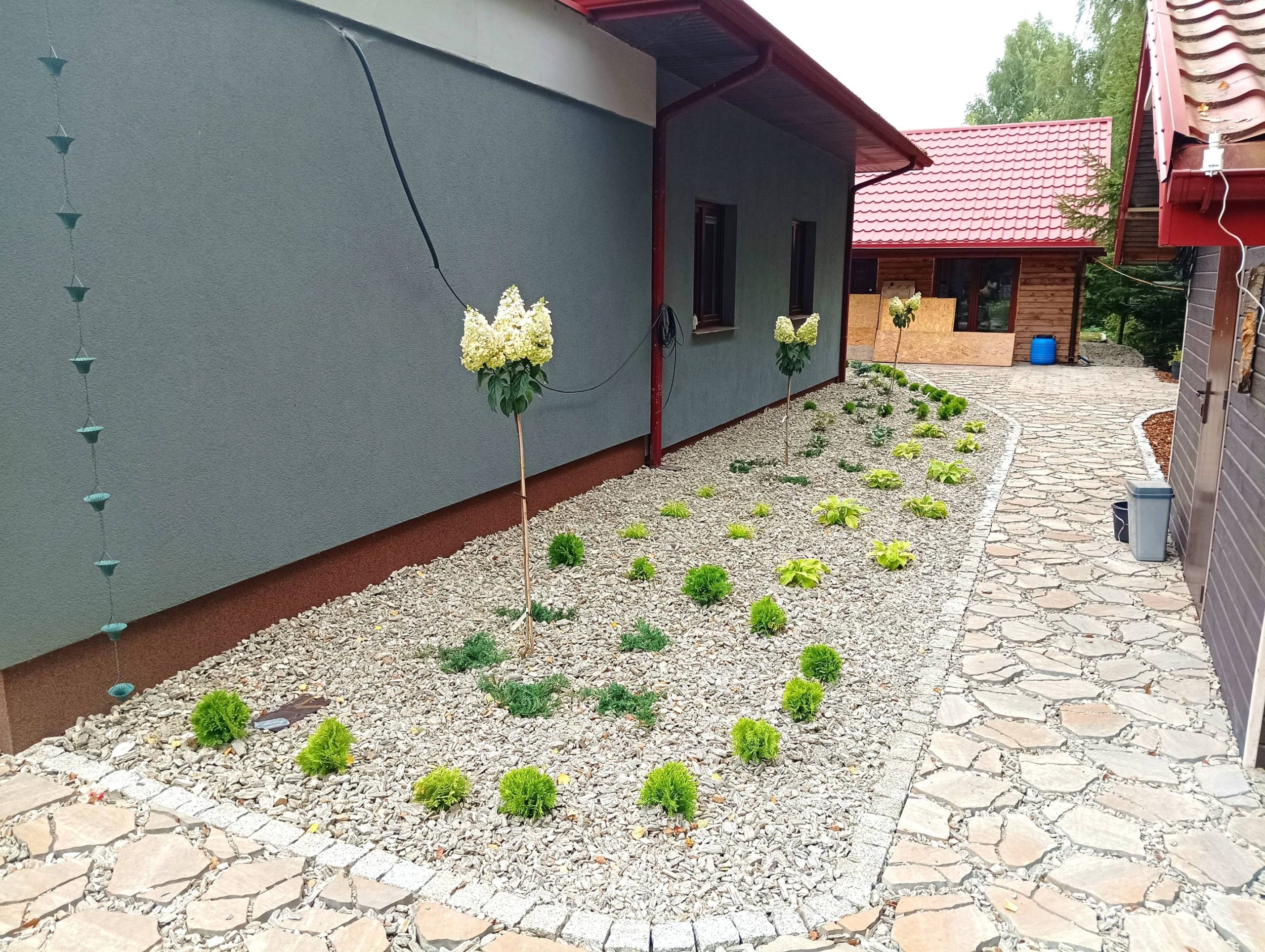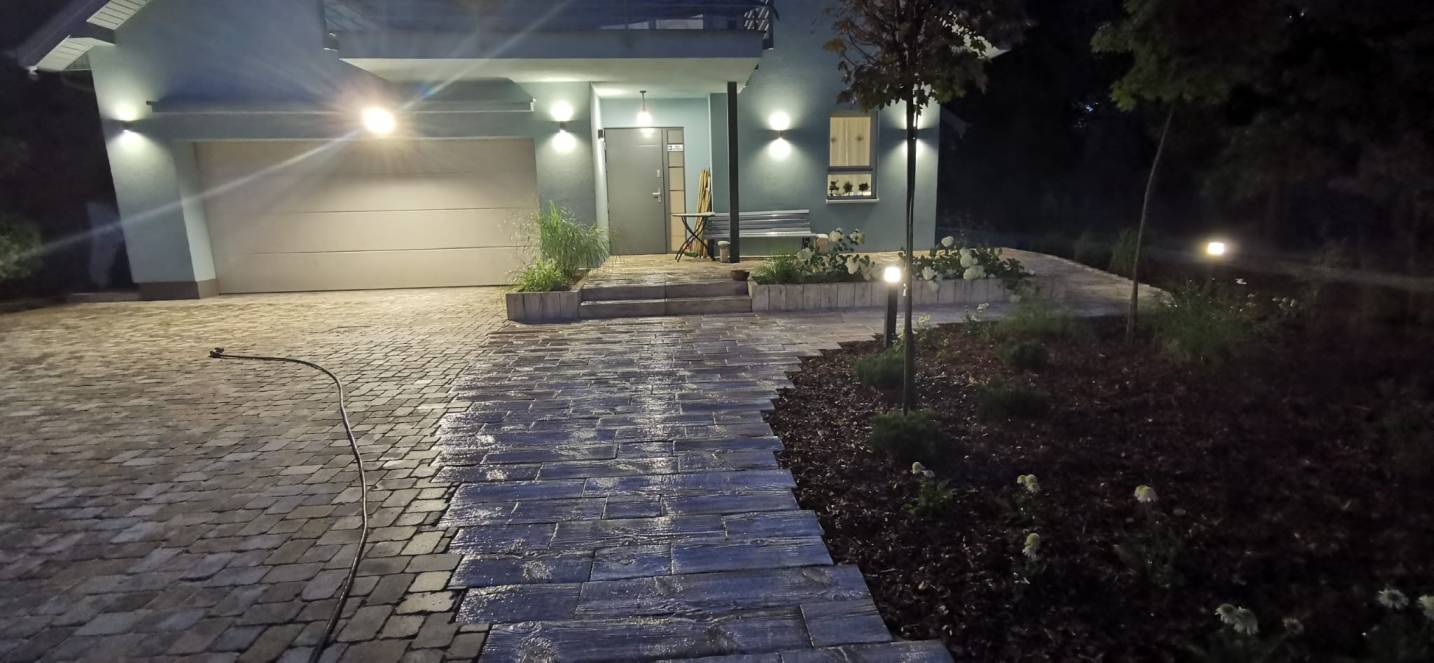 Właścicielom zależało na opracowaniu najbliższego otoczenia domu, wraz z podjazdem i tarasem.