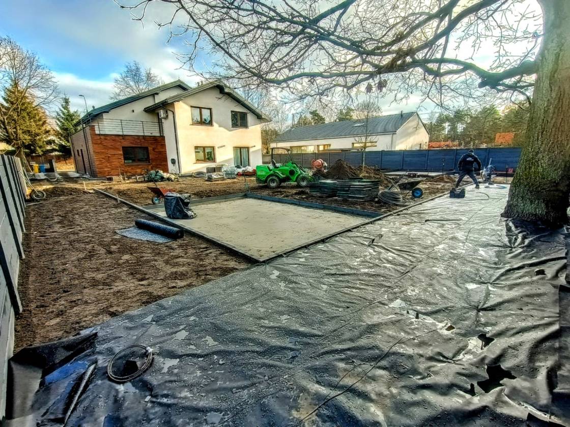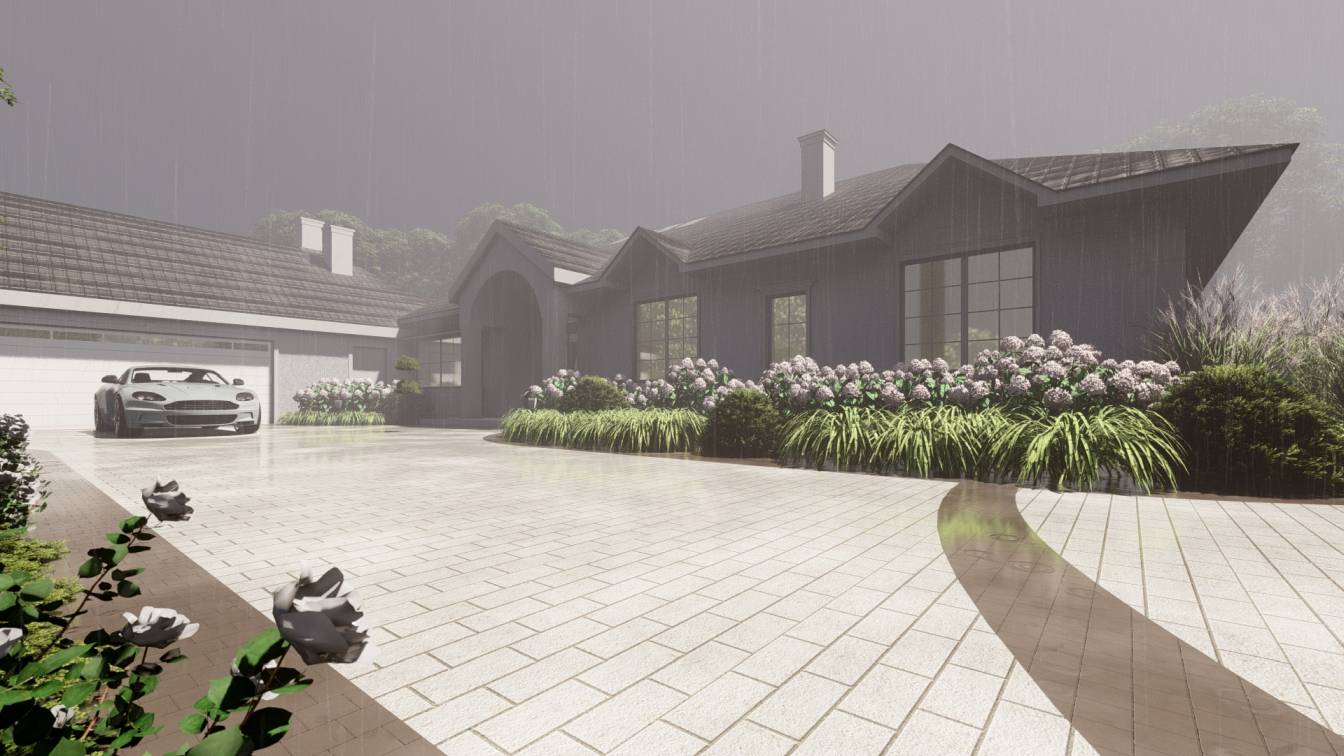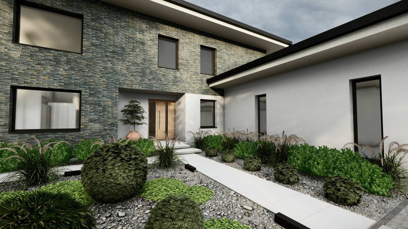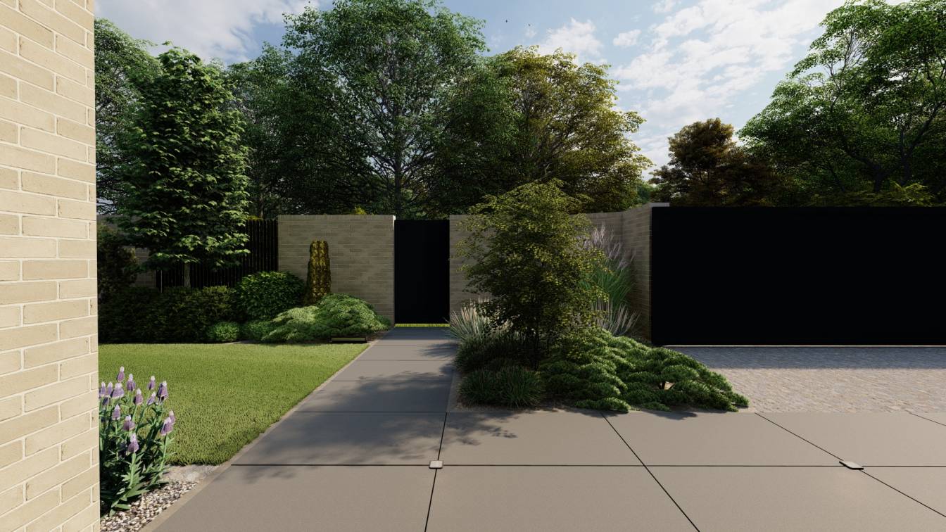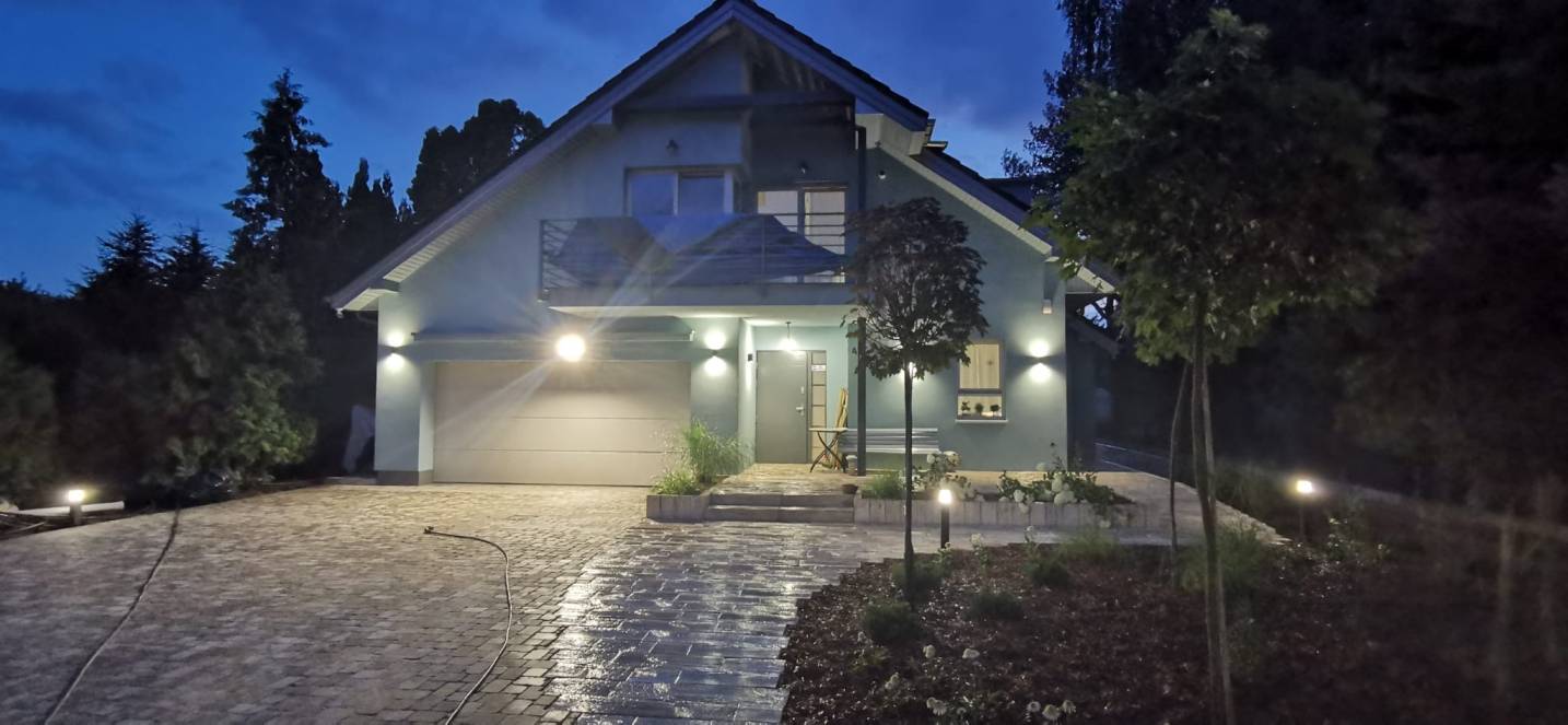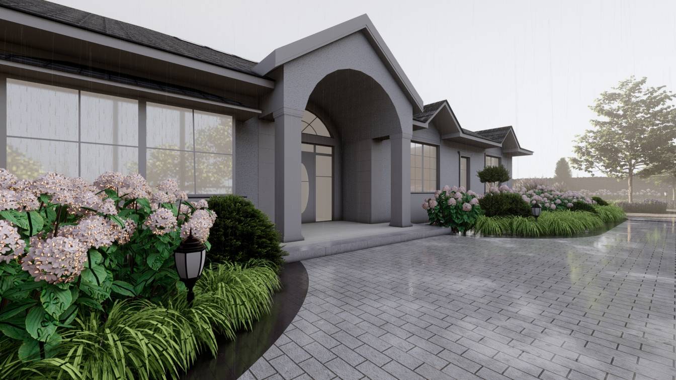Właścicielom zależało na opracowaniu najbliższego otoczenia domu, wraz z podjazdem i tarasem.