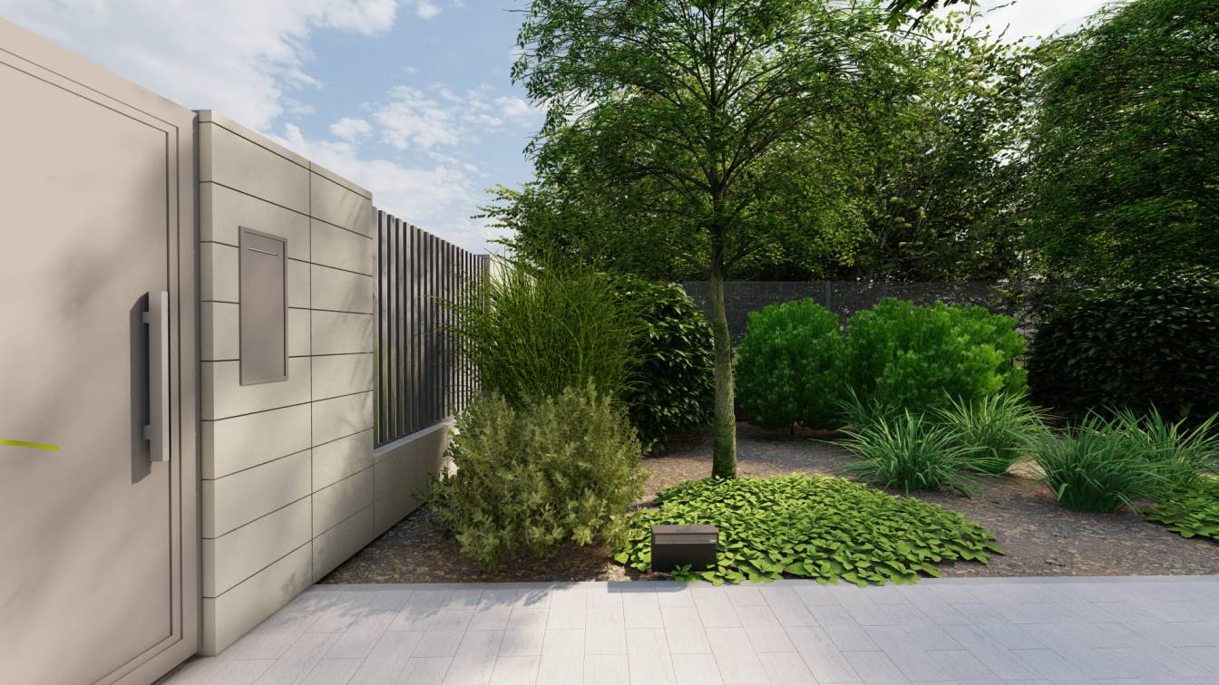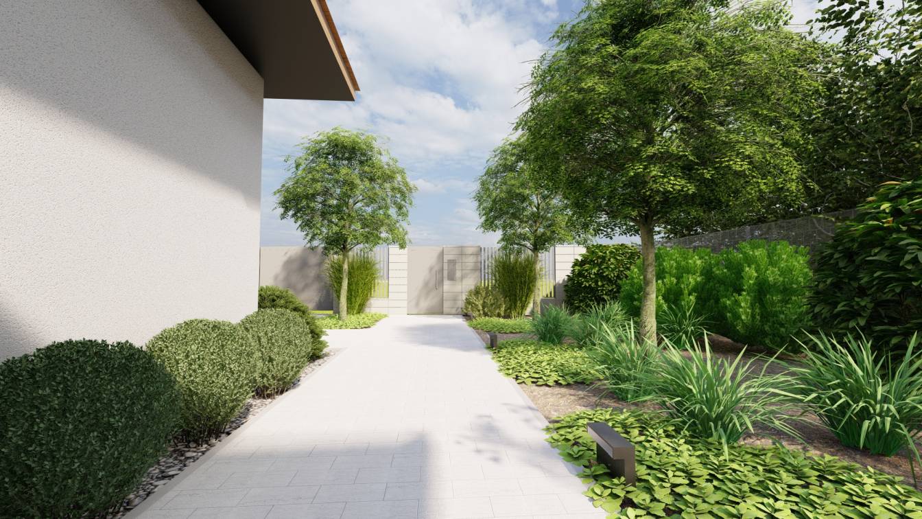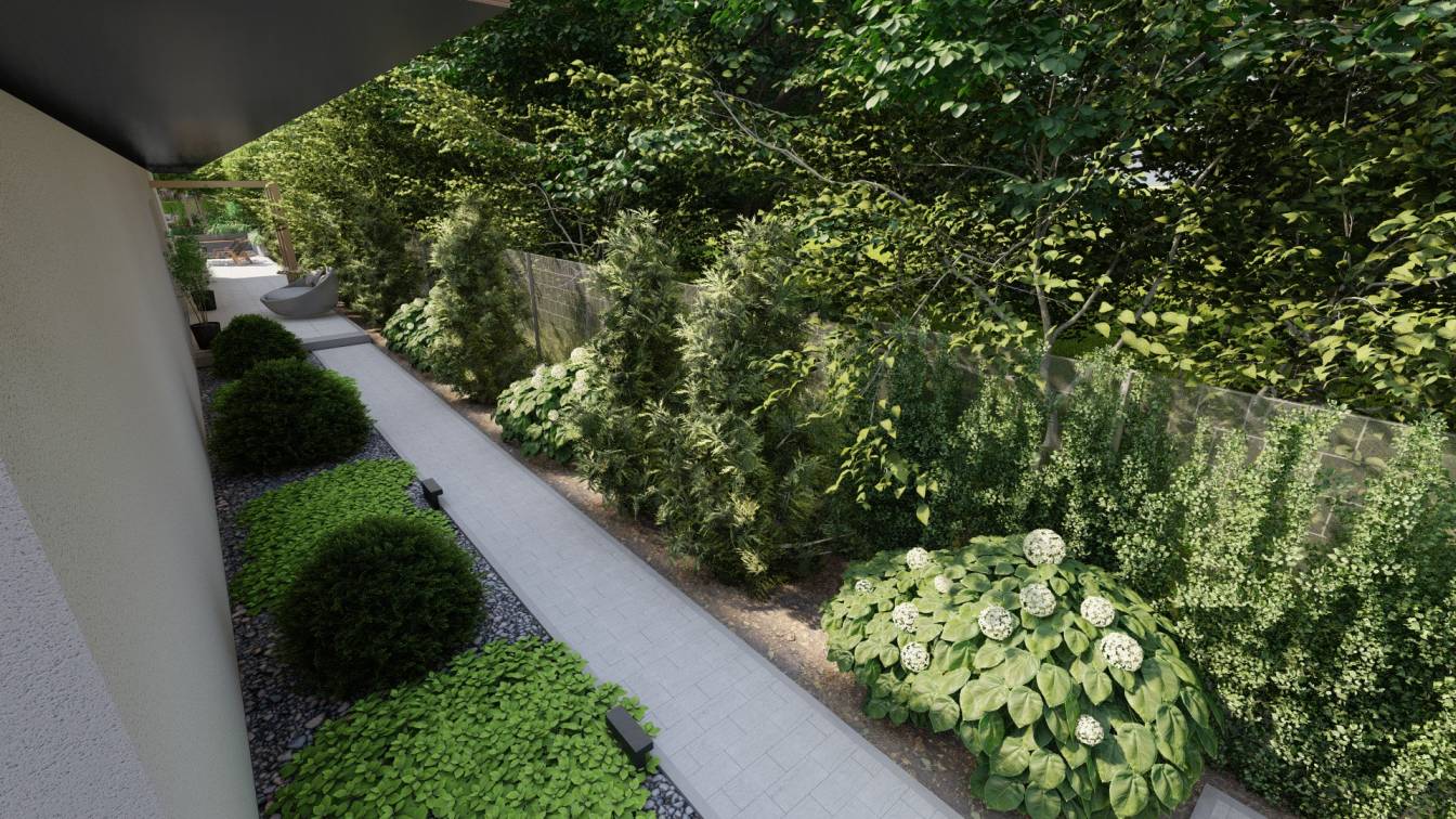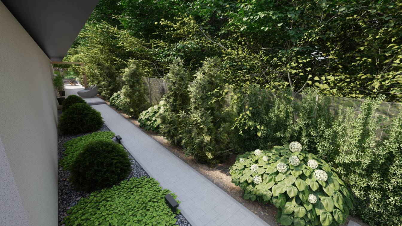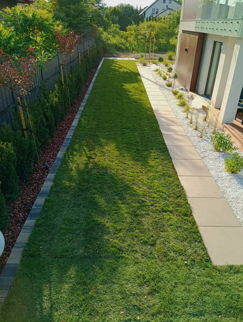 Ogród ma interesująco zaprojektowaną strefę wejściową oraz bardzo wąski tył działki.
