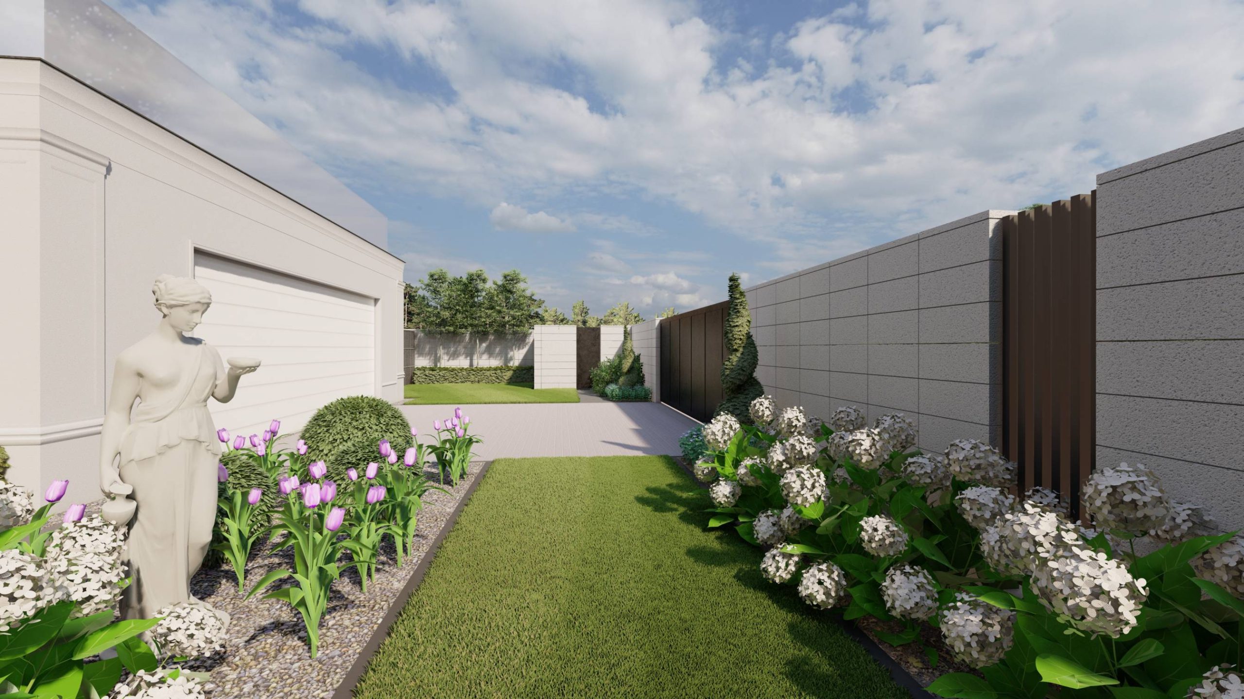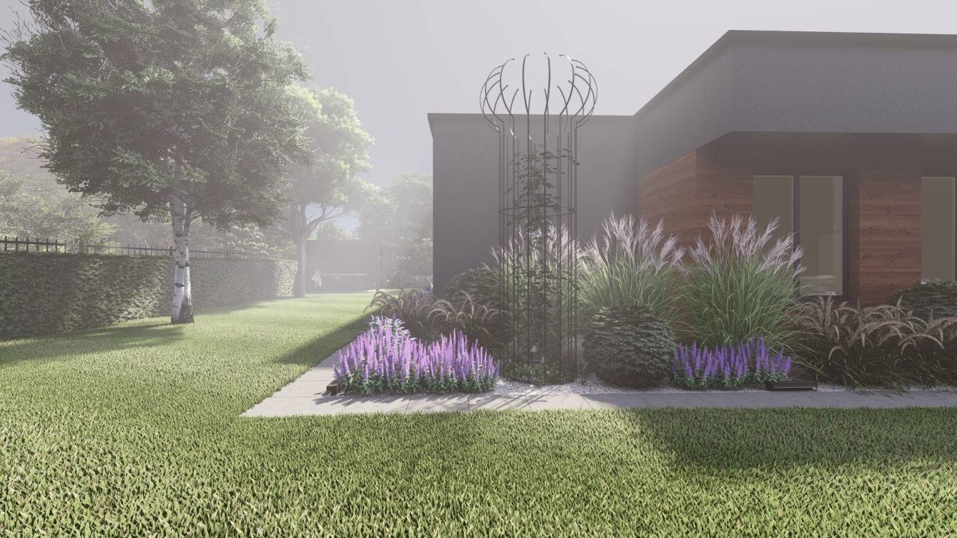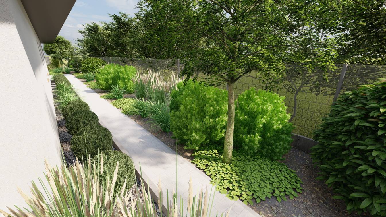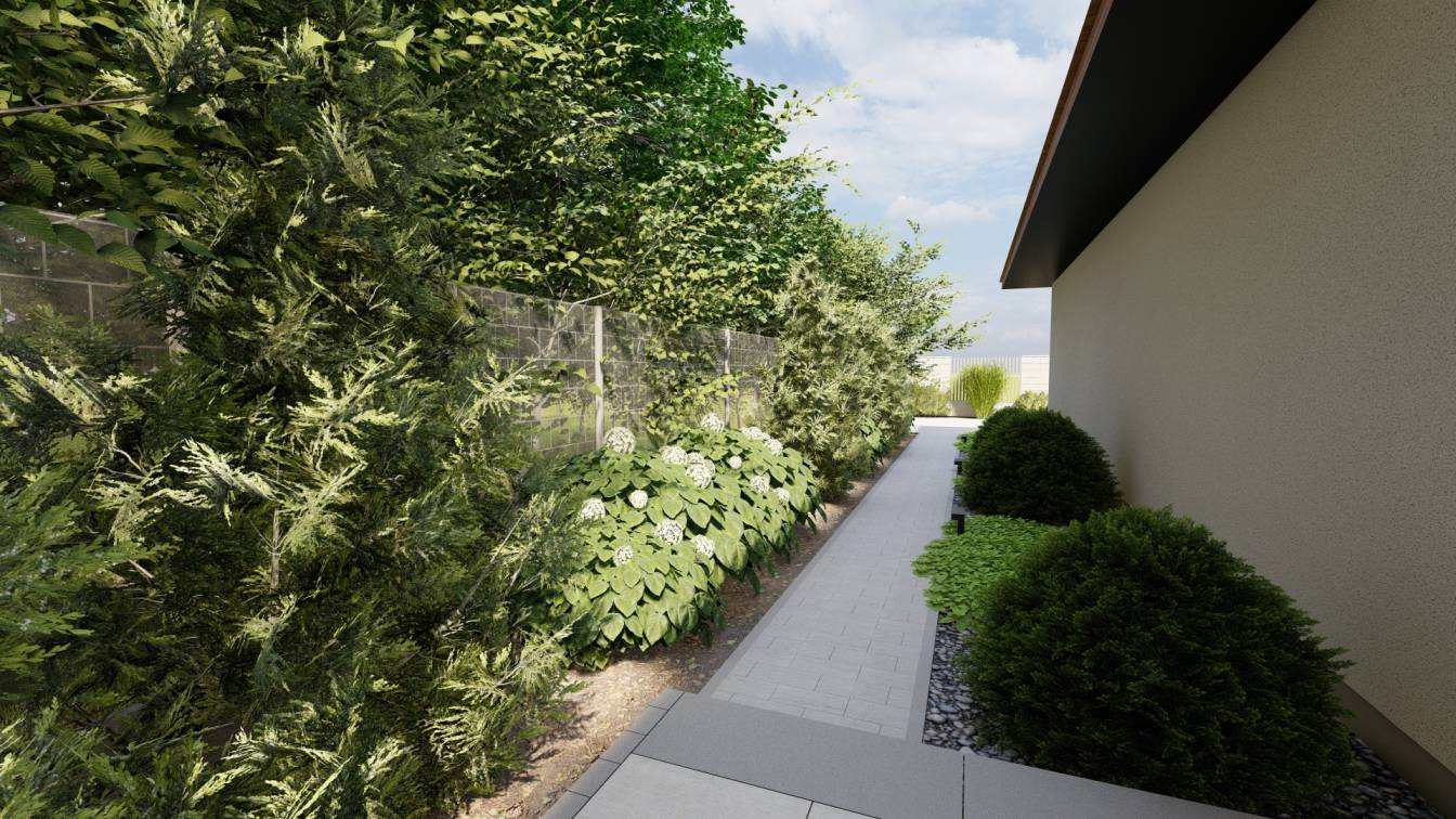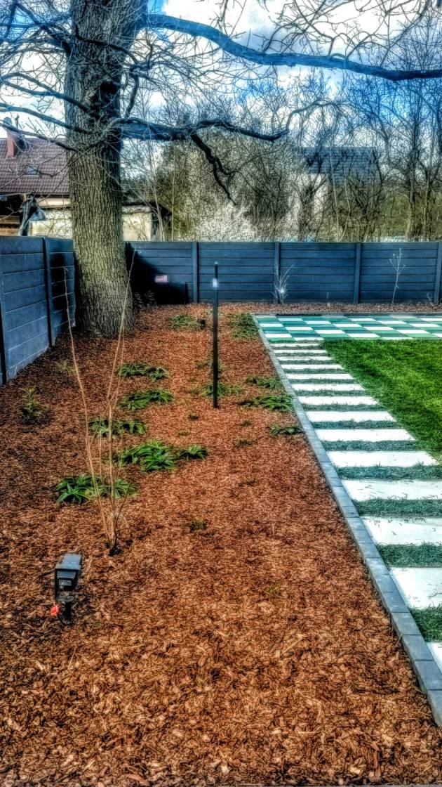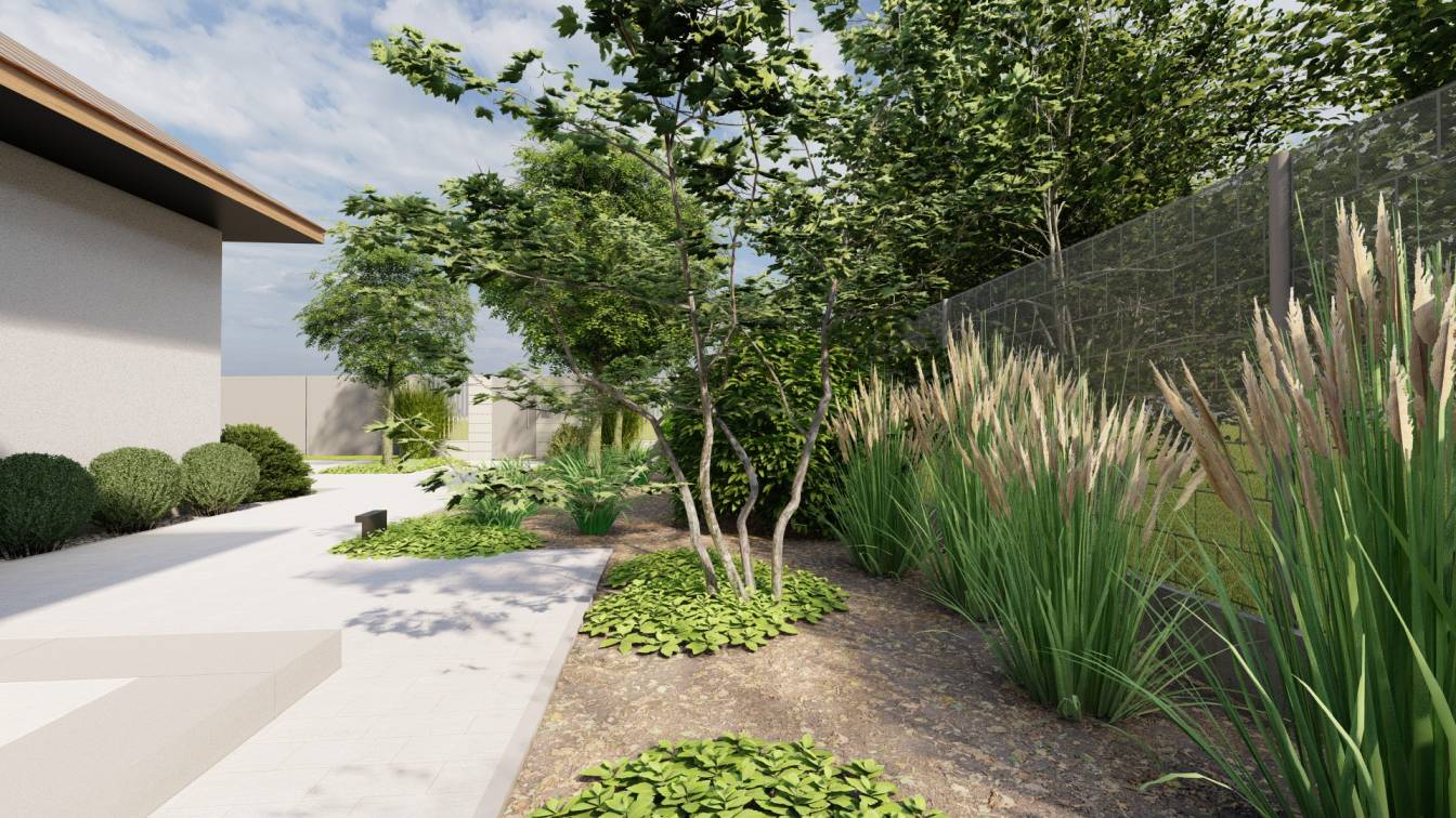 Ogród ma interesująco zaprojektowaną strefę wejściową oraz bardzo wąski tył działki.