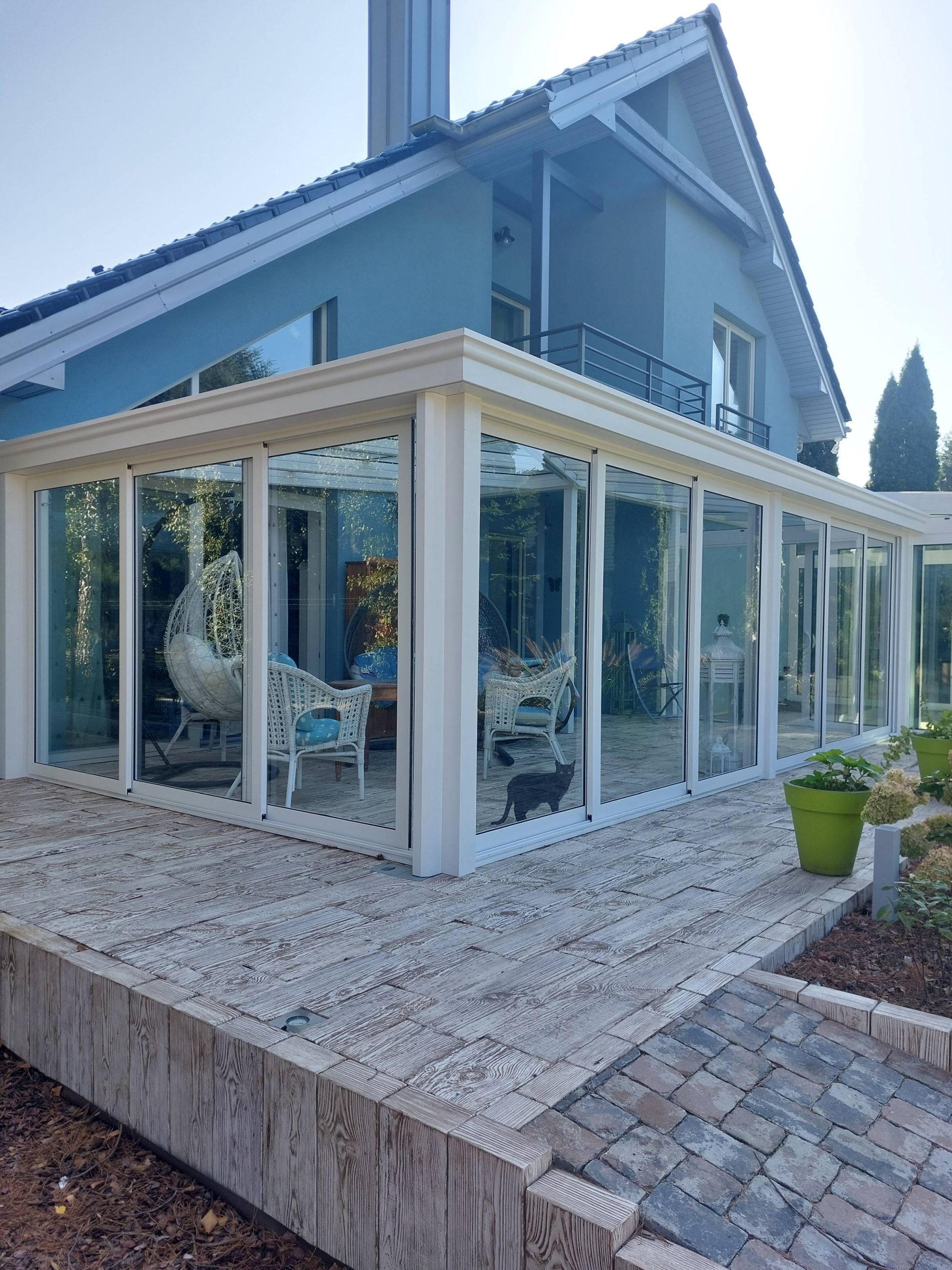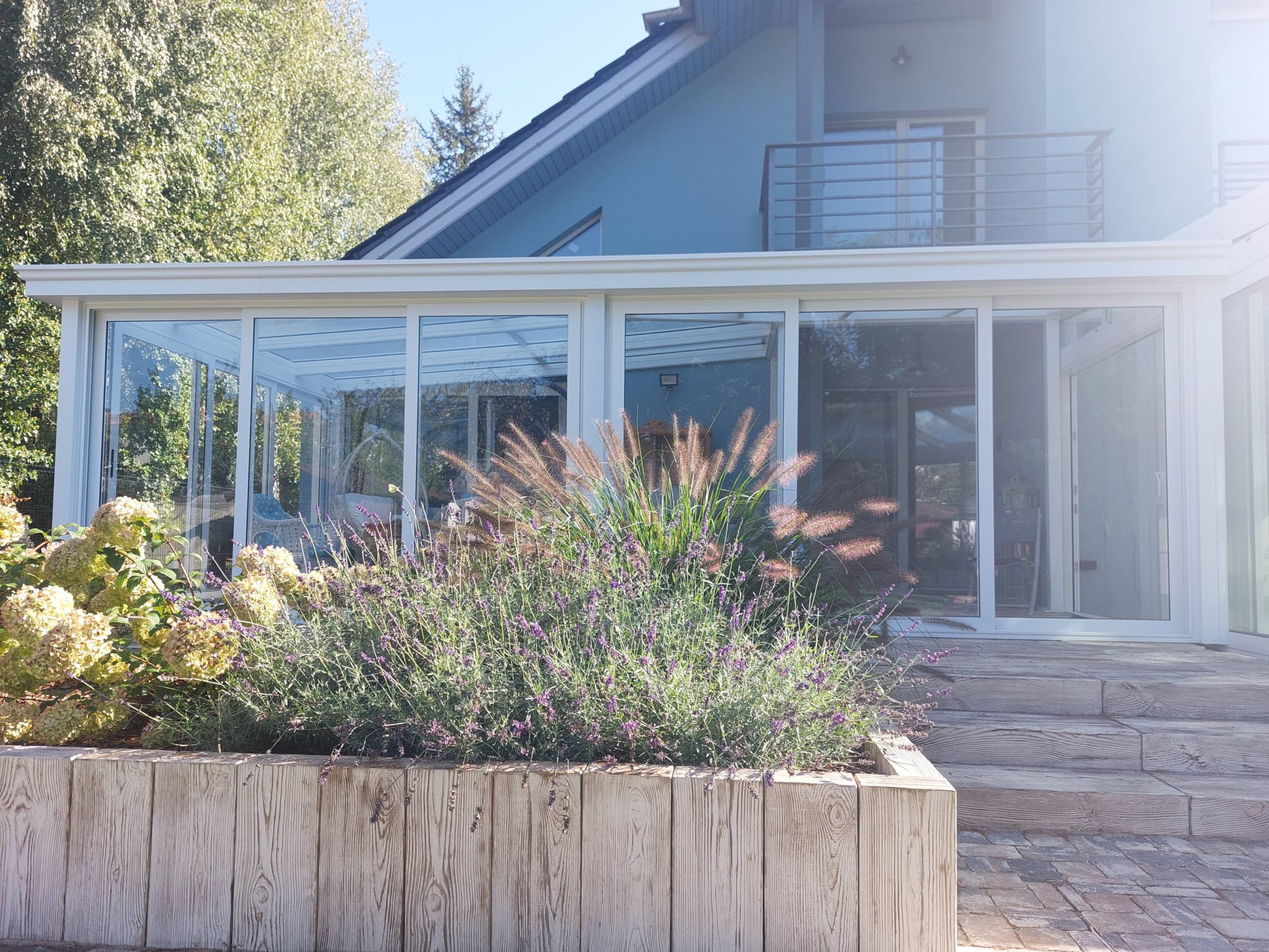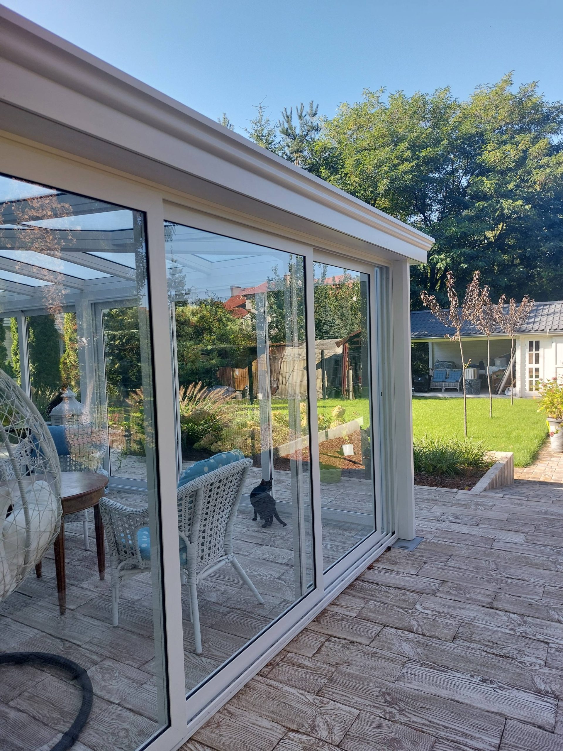 Taras zaprojektowano ze szklaną zabudową.