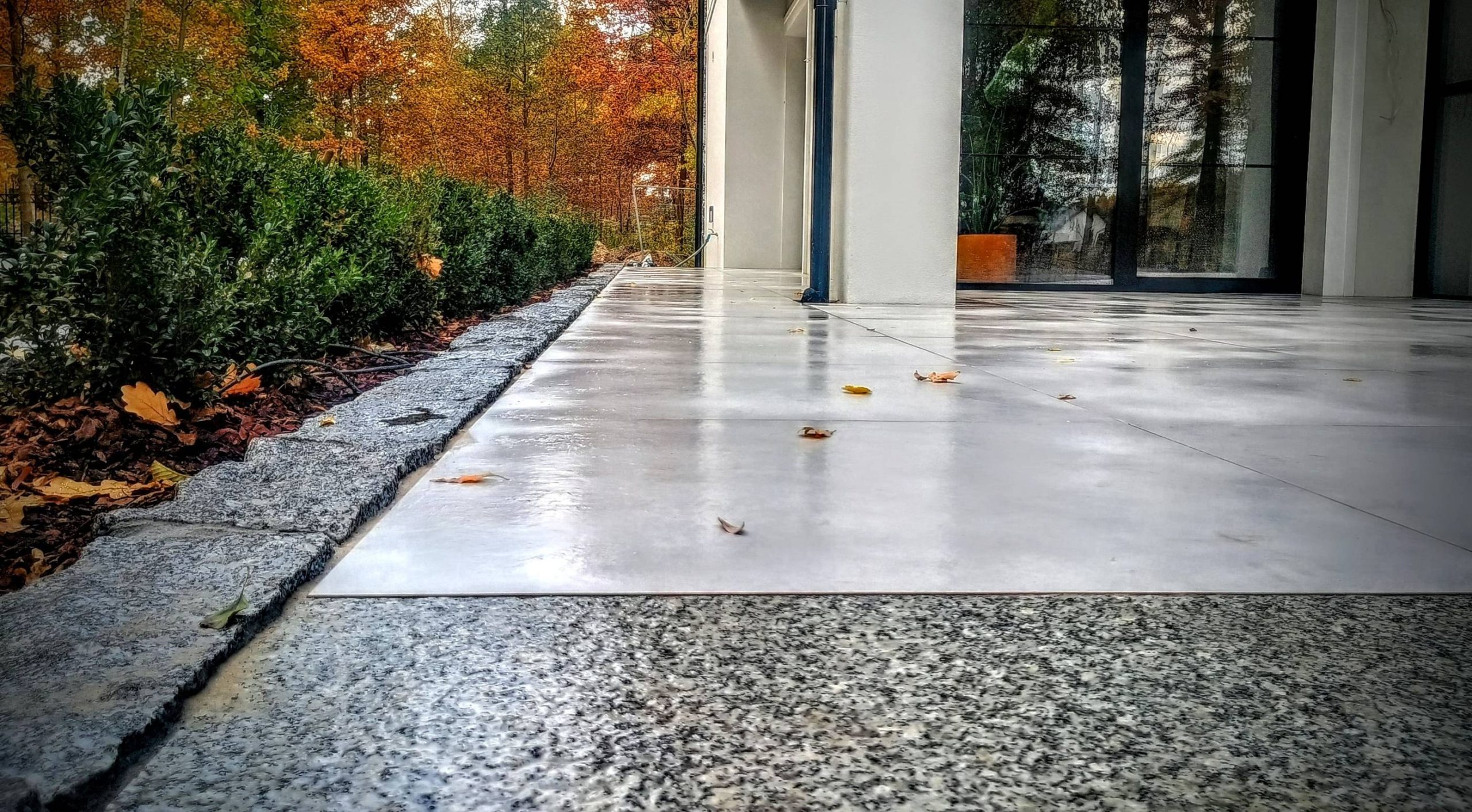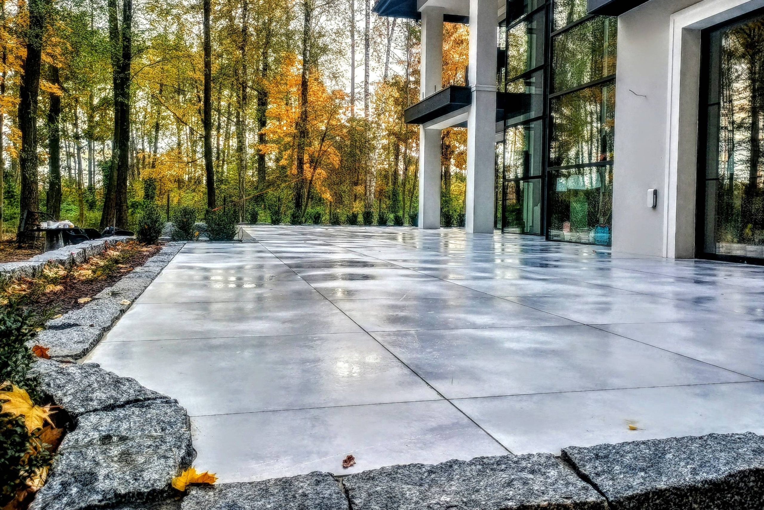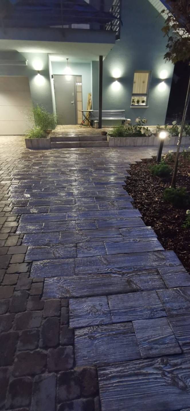 Strefę wejściową zaprojektowano z płyt betonowych połączonych z drobniejszą kostką.
