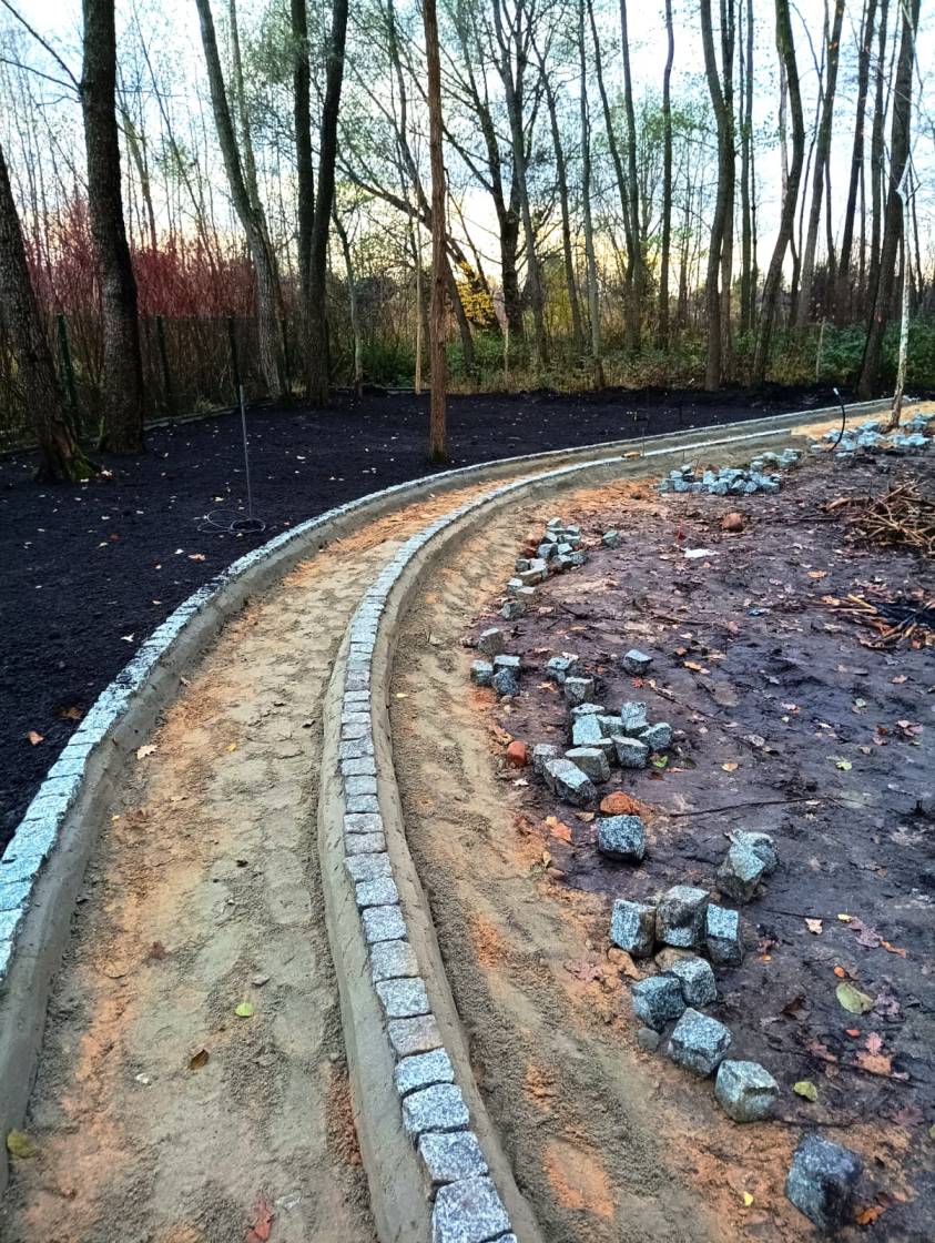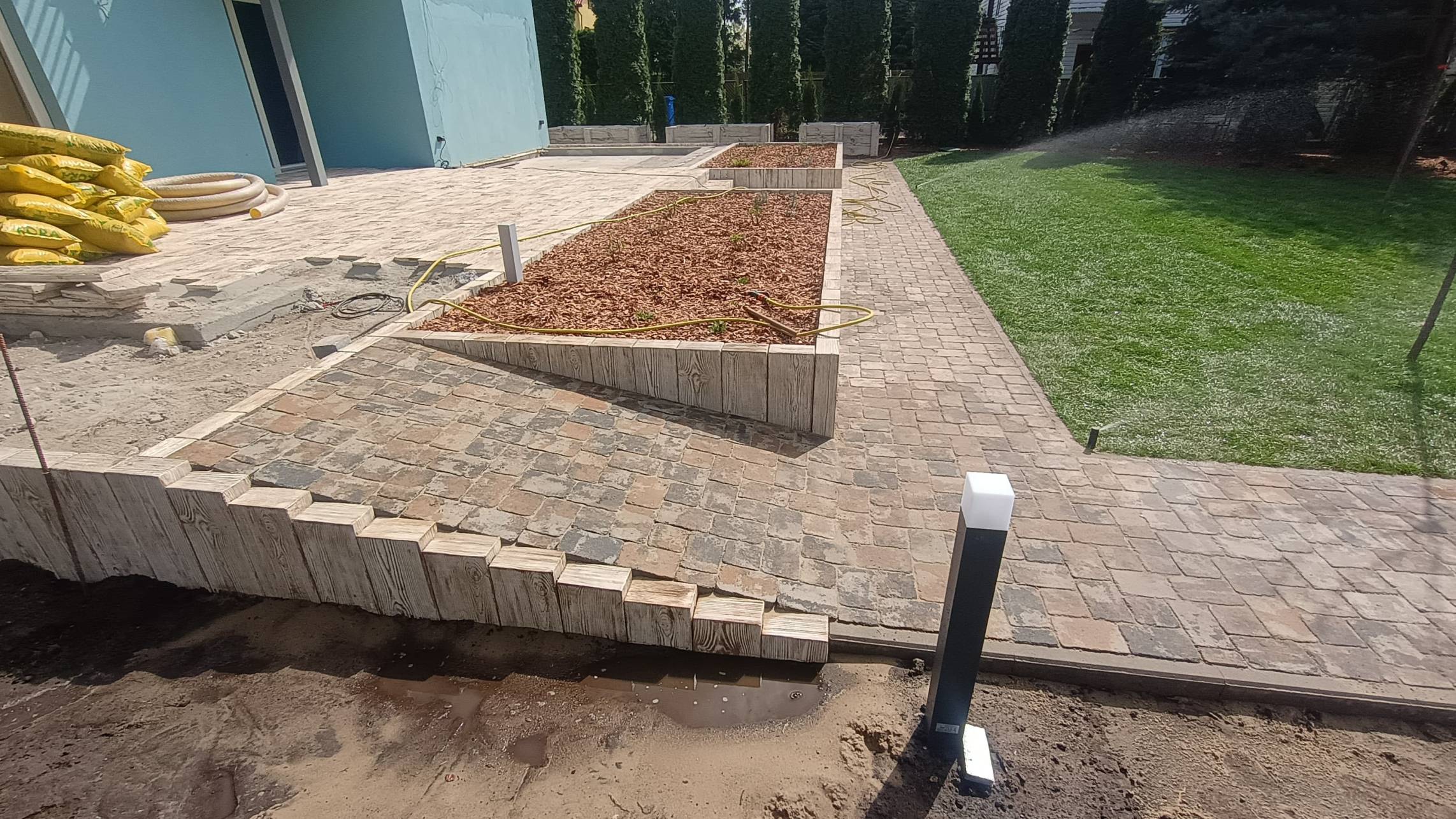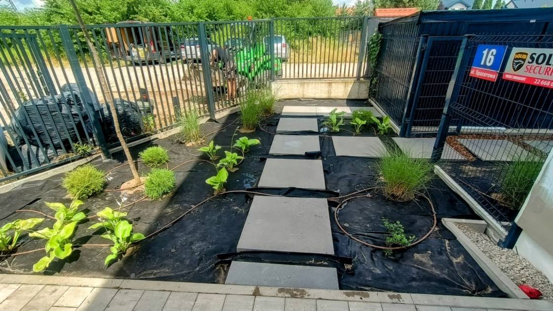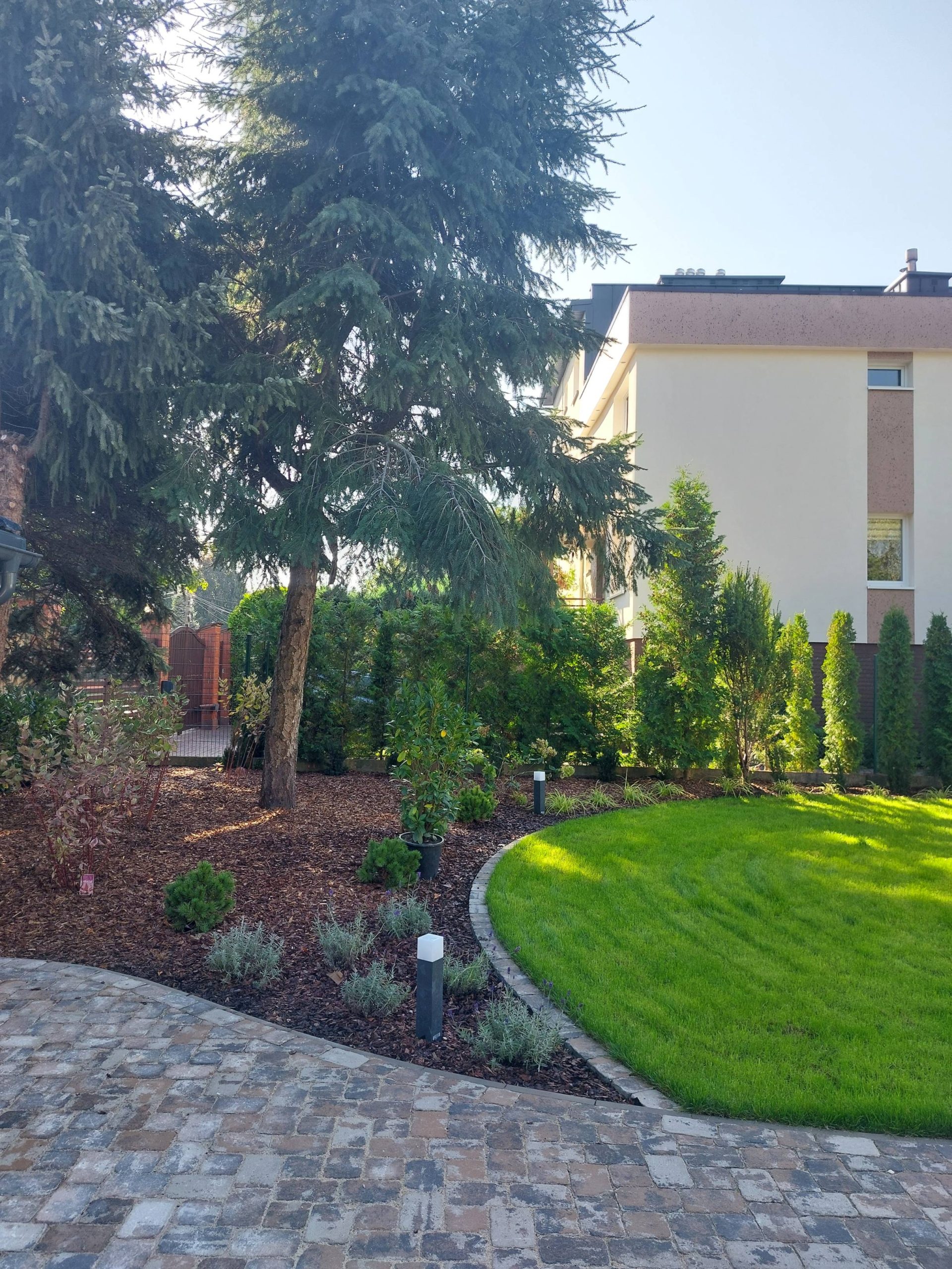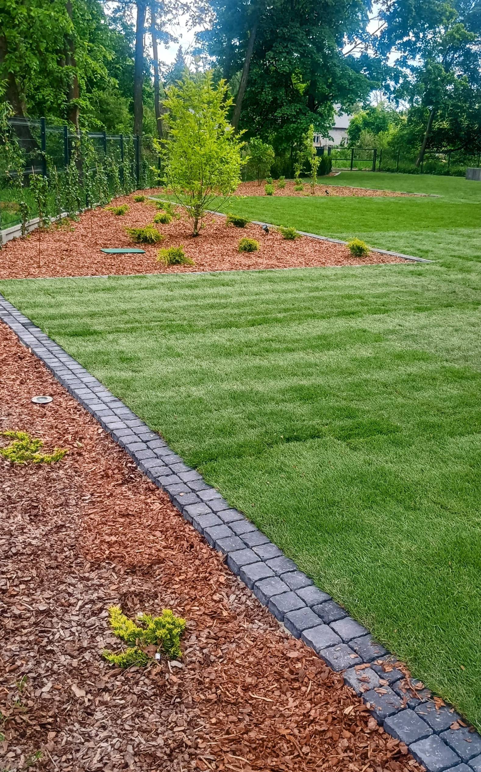 Obrzeża oddzielające trawnik od rabat wykonano z dwóch pasów kostki identycznej jak na podjeździe.