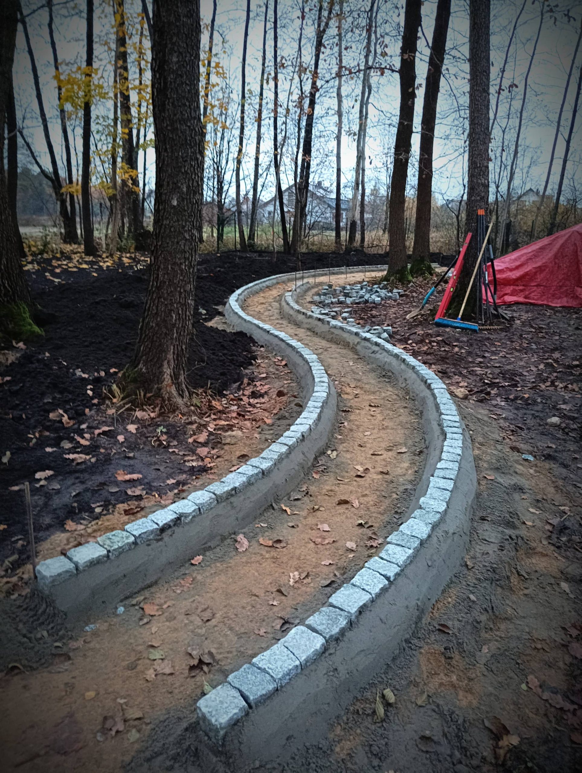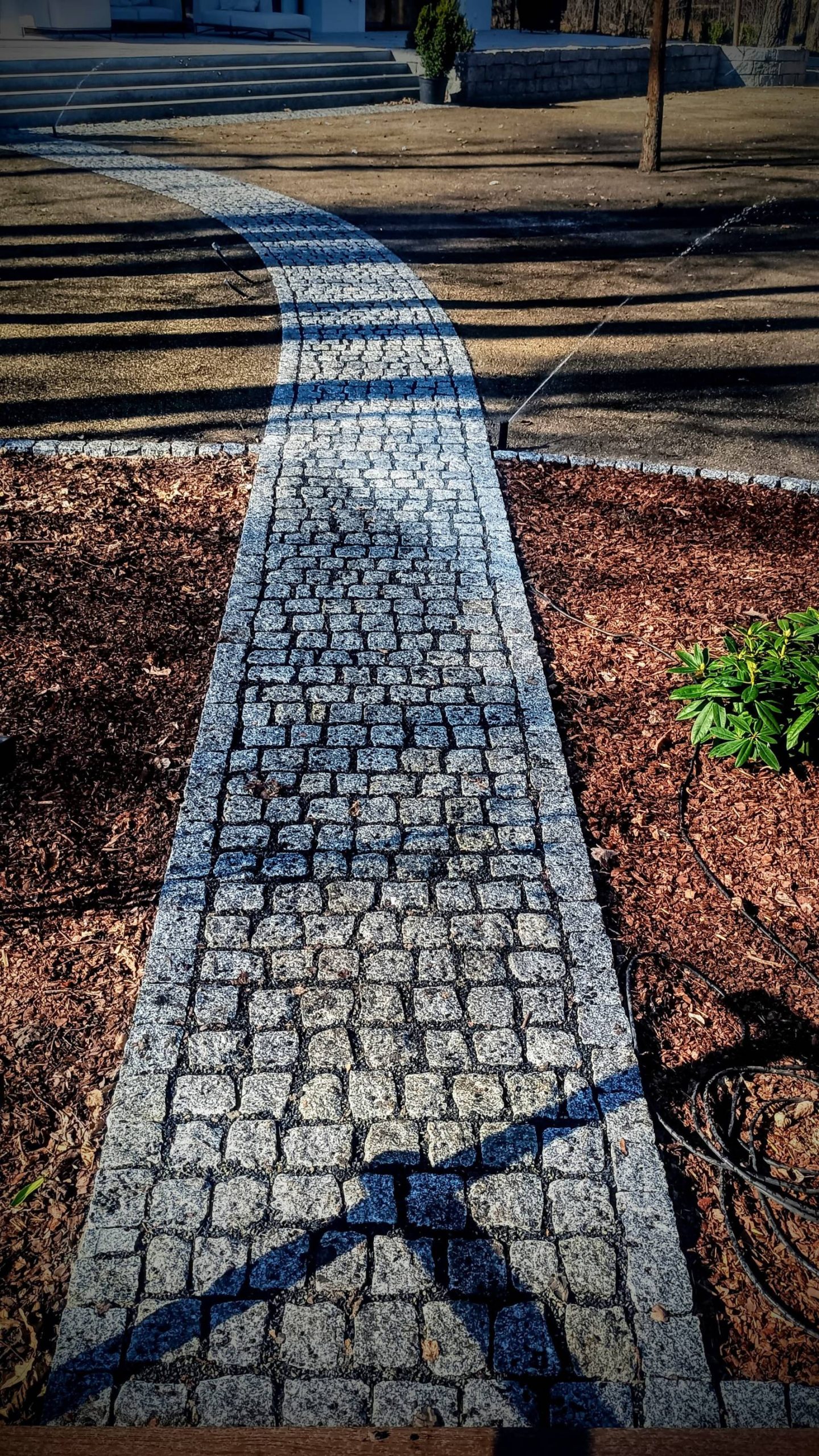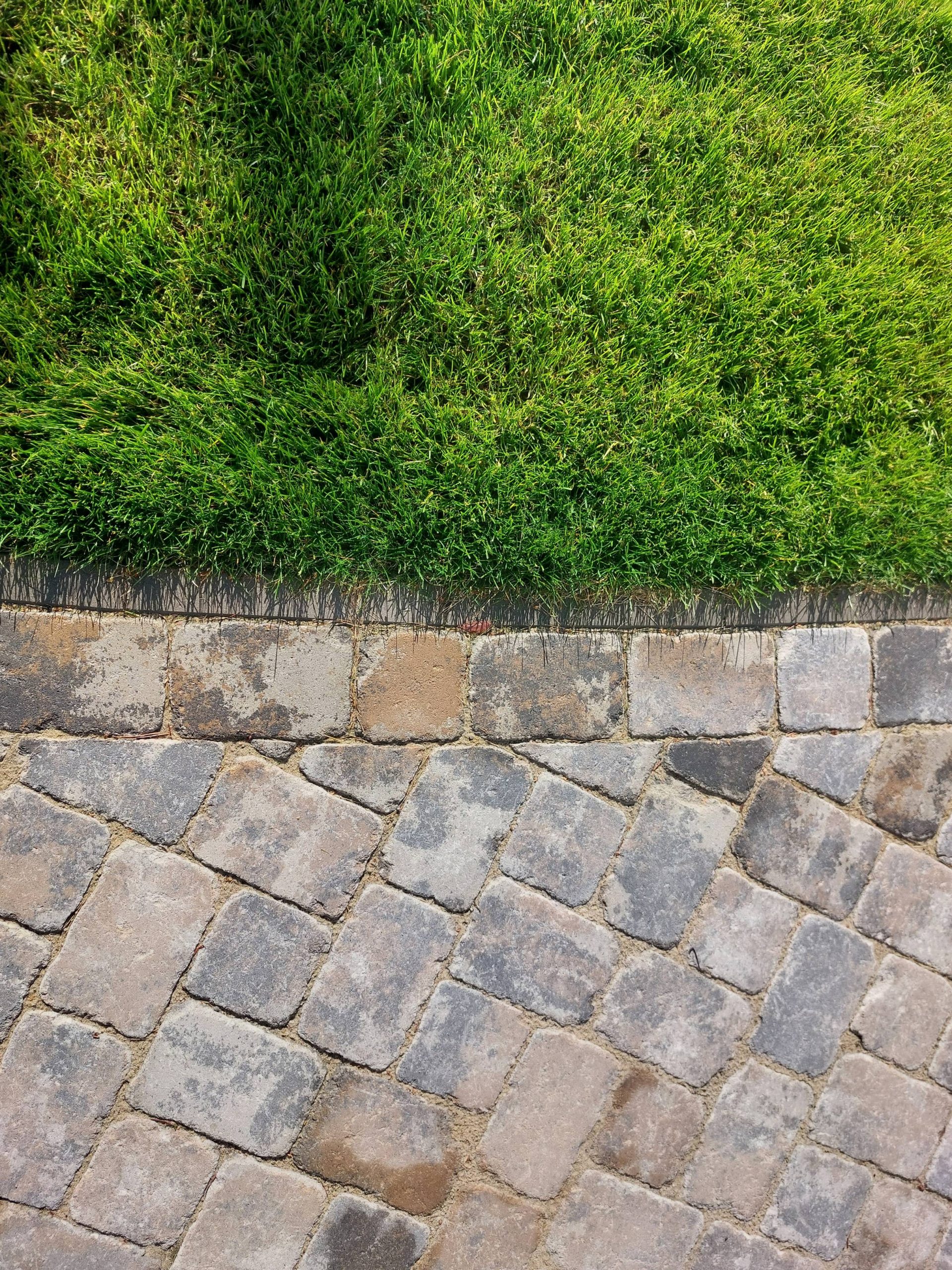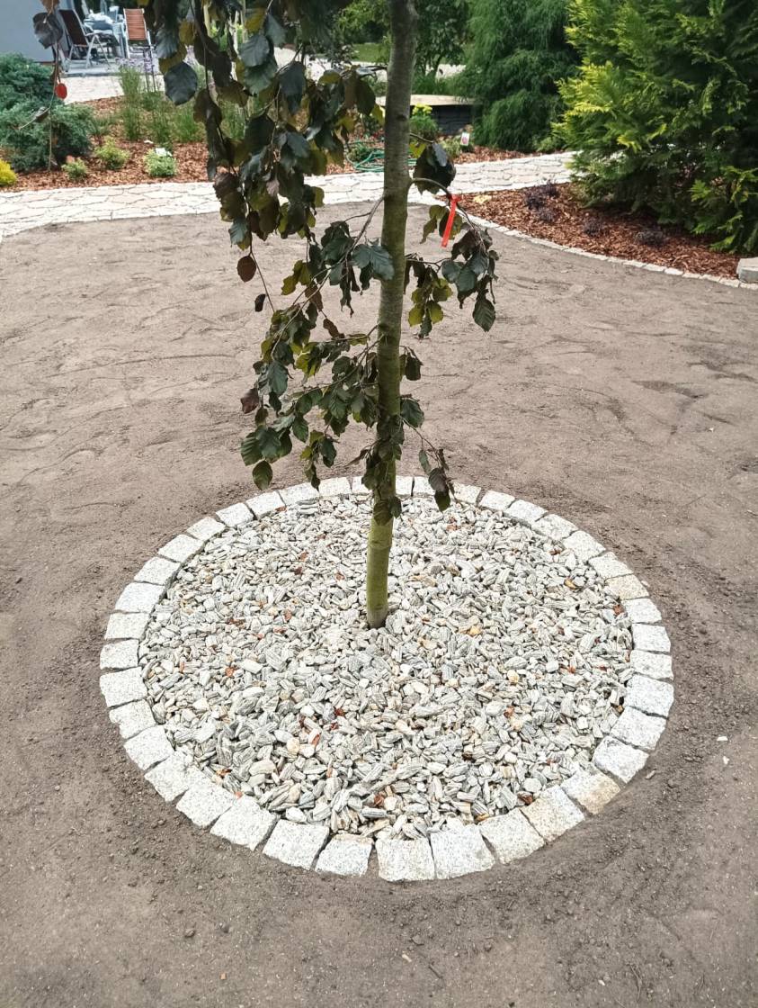 Obrzeża oddzielające trawnik od rabat wykonano z dwóch pasów kostki identycznej jak na podjeździe.
