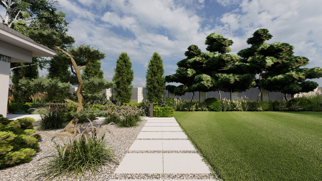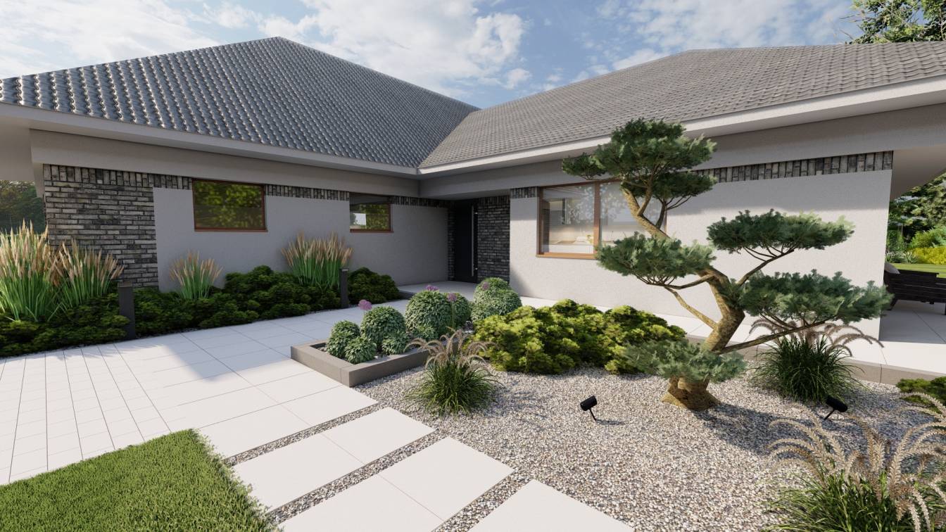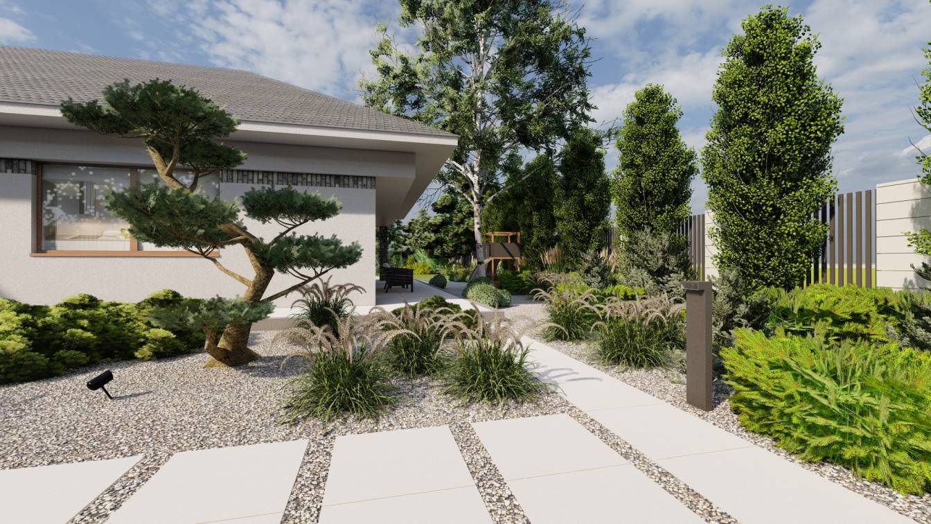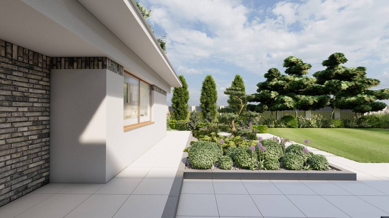 Na froncie znajduje się szeroka rabata z bonsai z sosny, uzupełniona niskimi iglakami.
