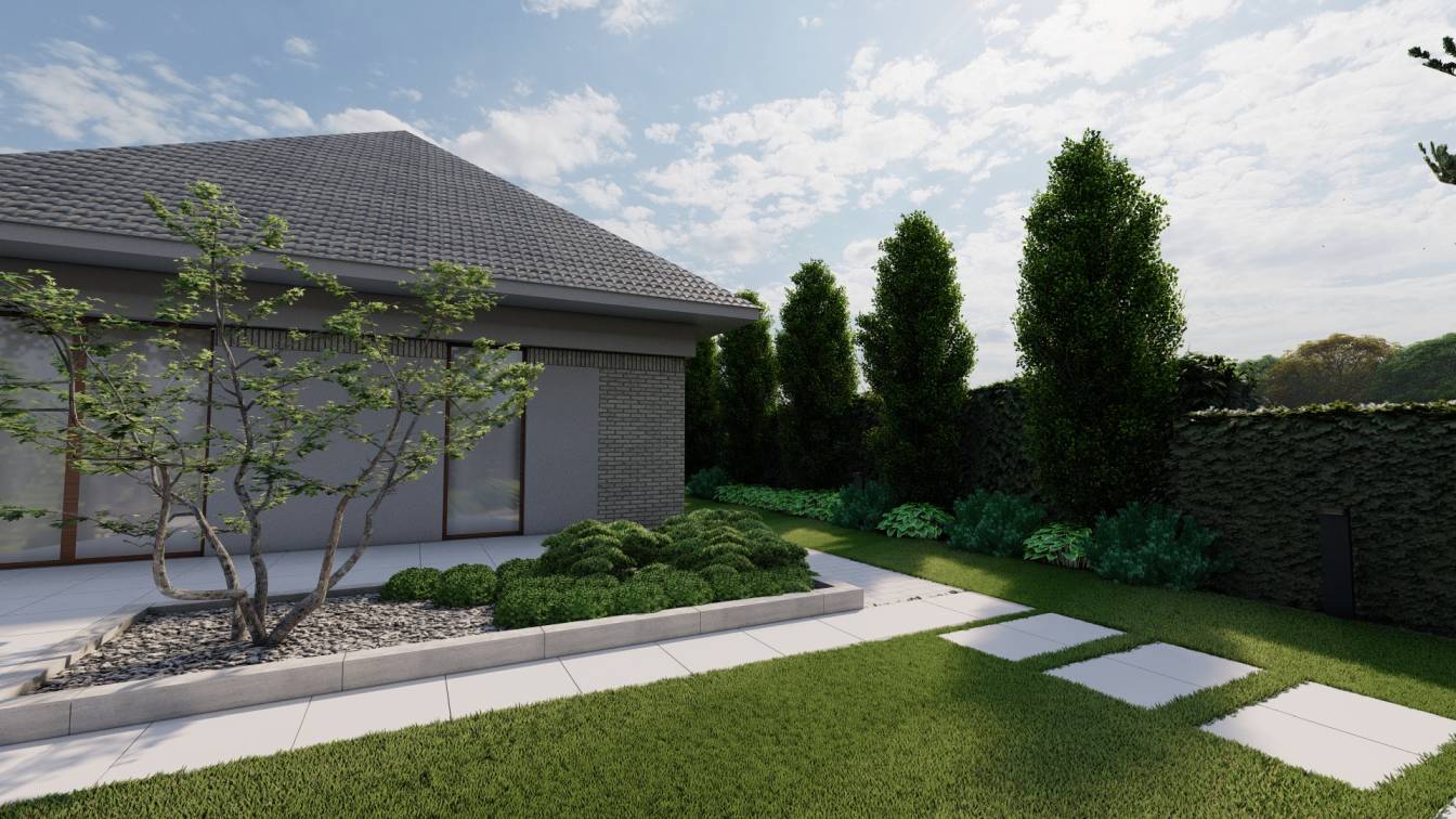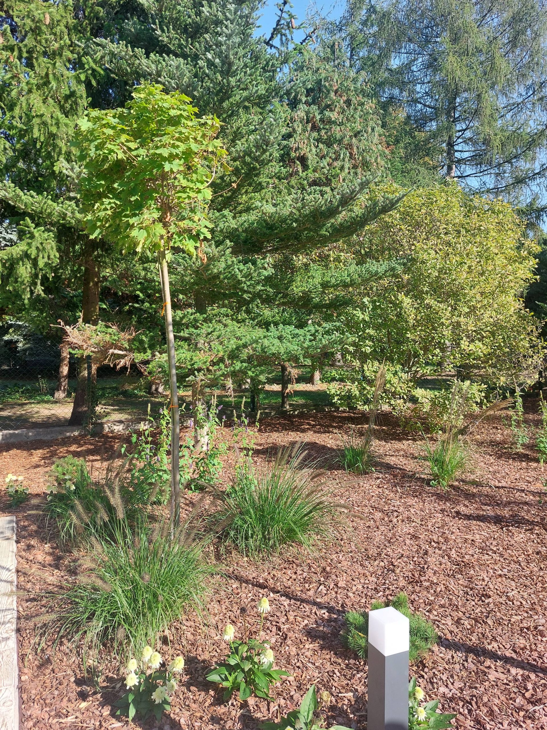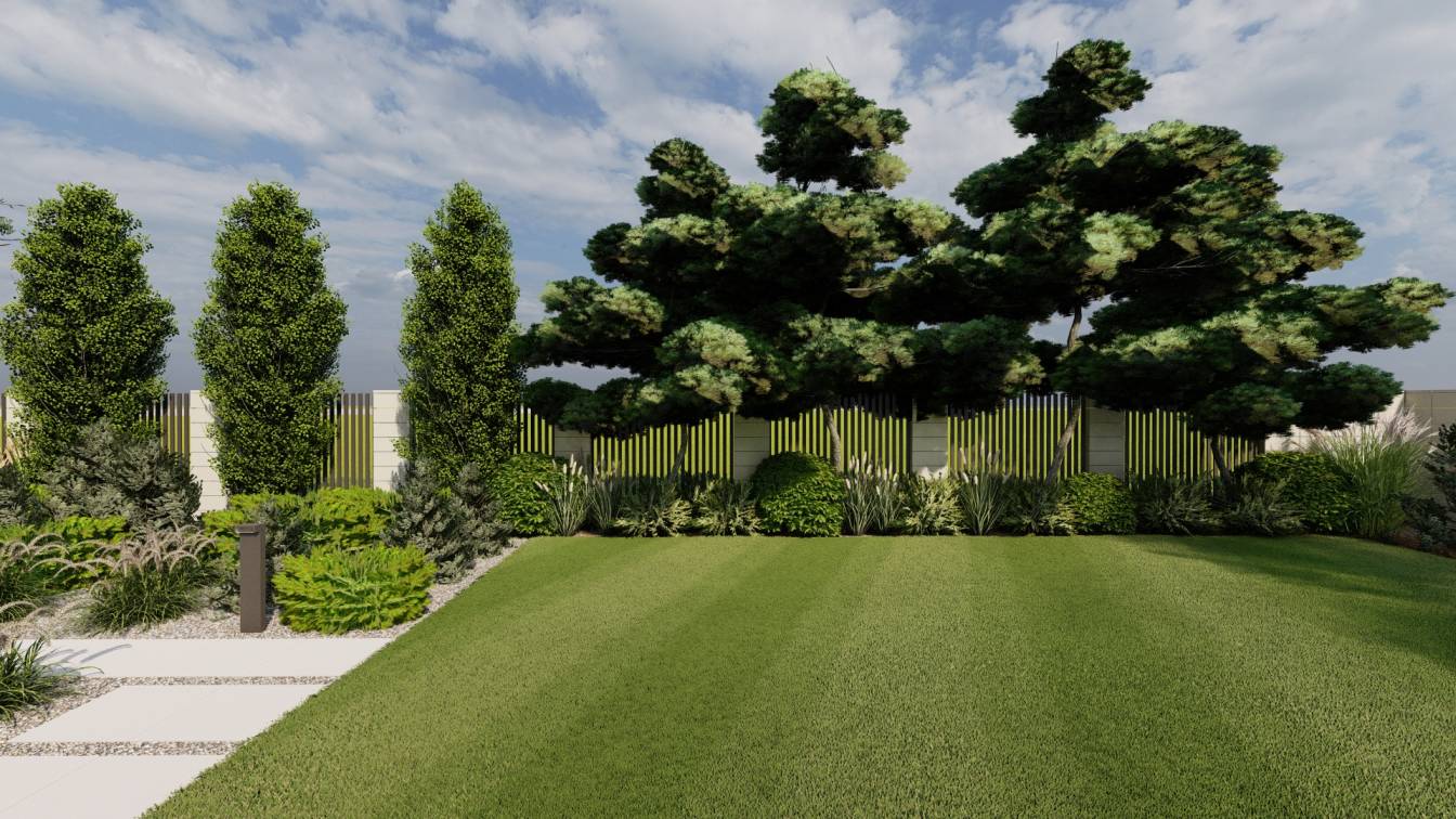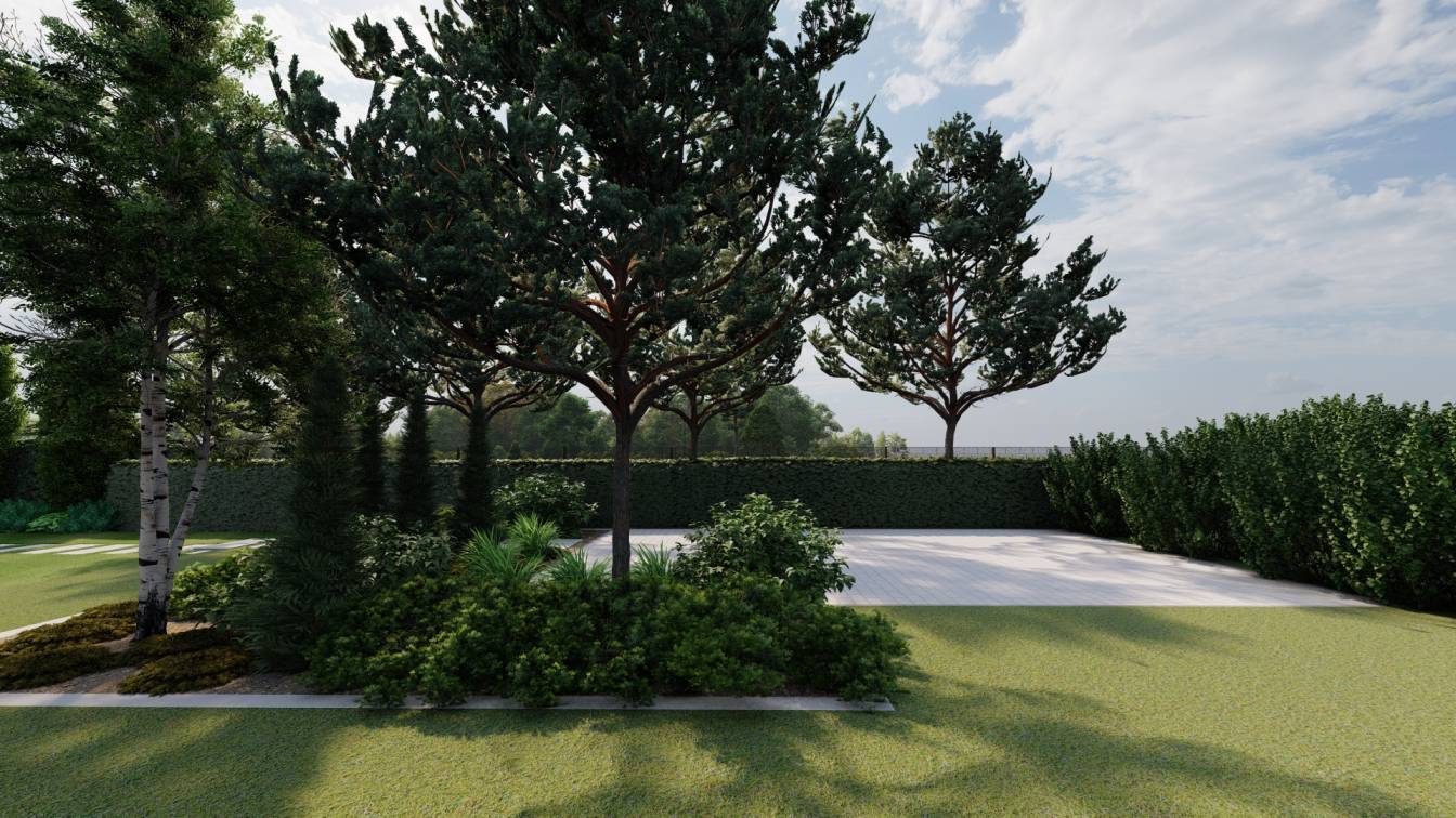 Na froncie znajduje się szeroka rabata z bonsai z sosny, uzupełniona niskimi iglakami.