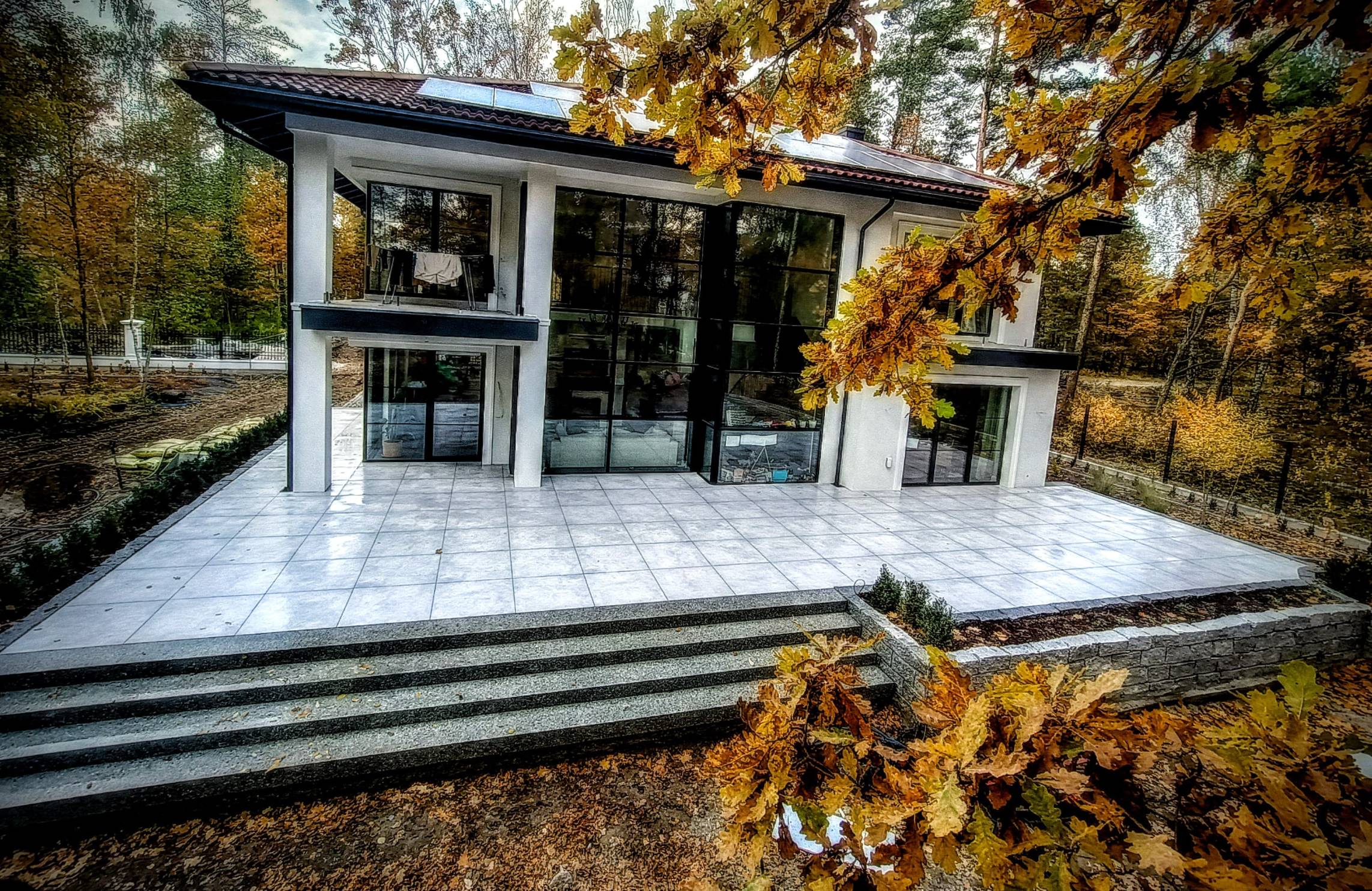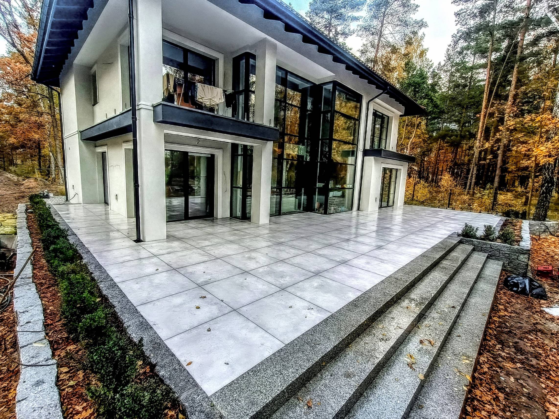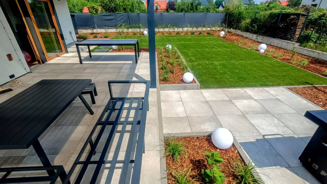 Taras wyłożono czarnymi płytami 60x60 cm.