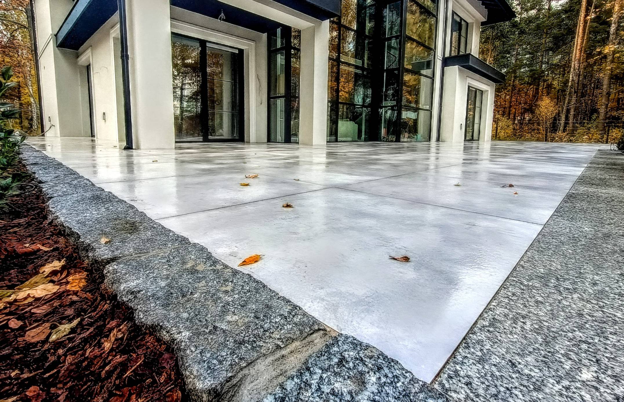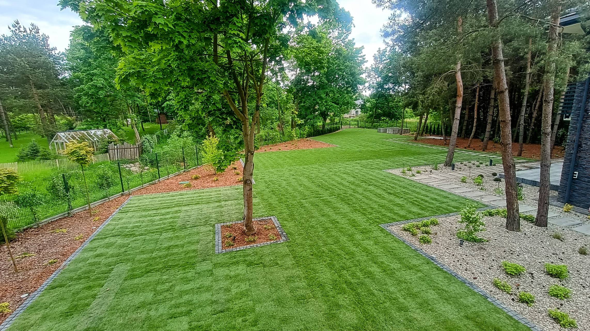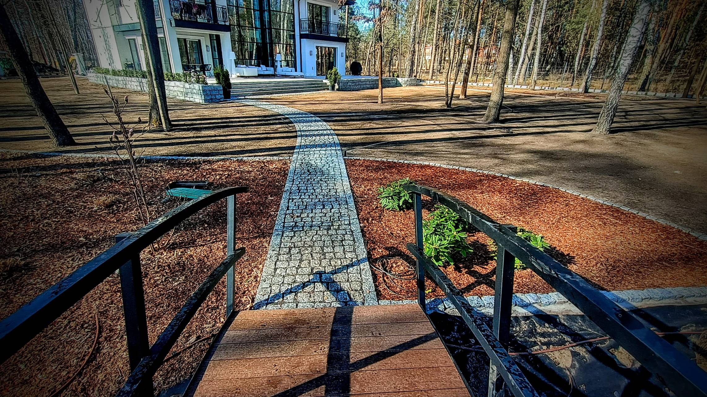Nowoczesny ogród przy dużej willi położonej w środku lasu.