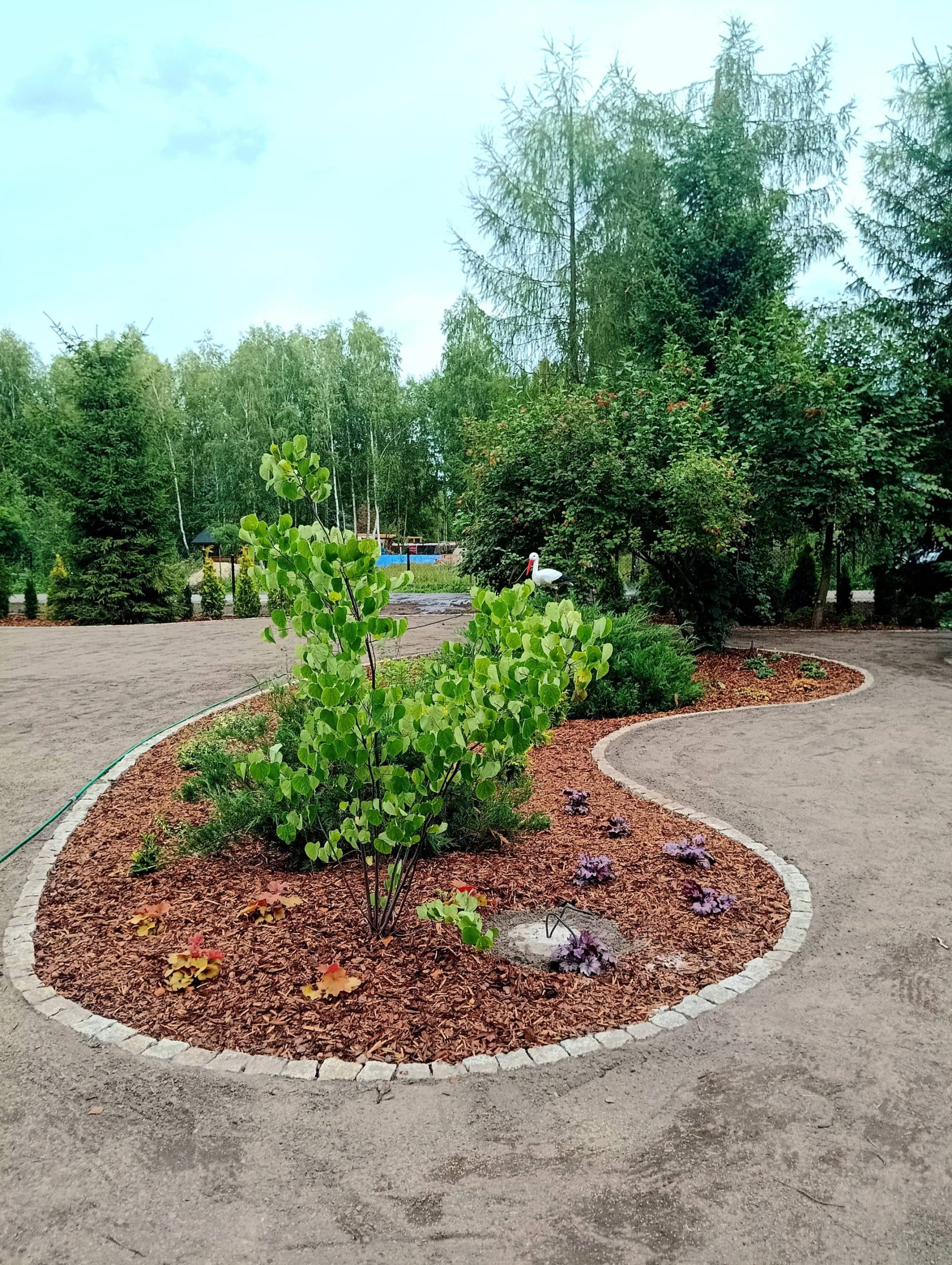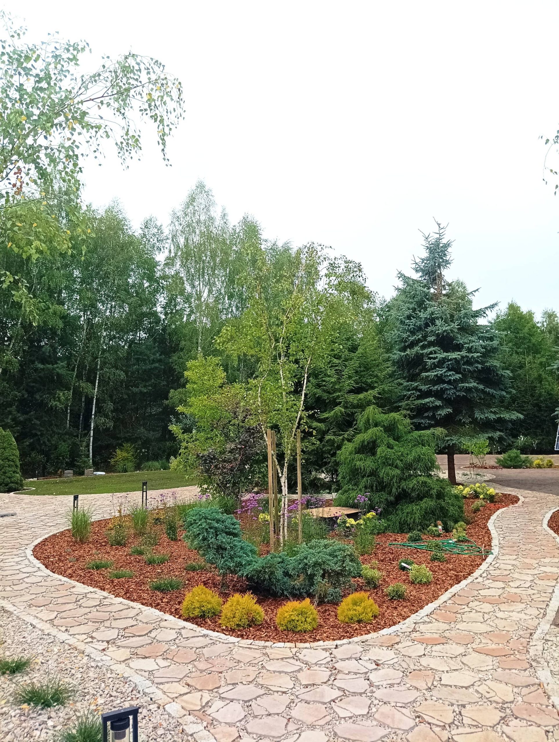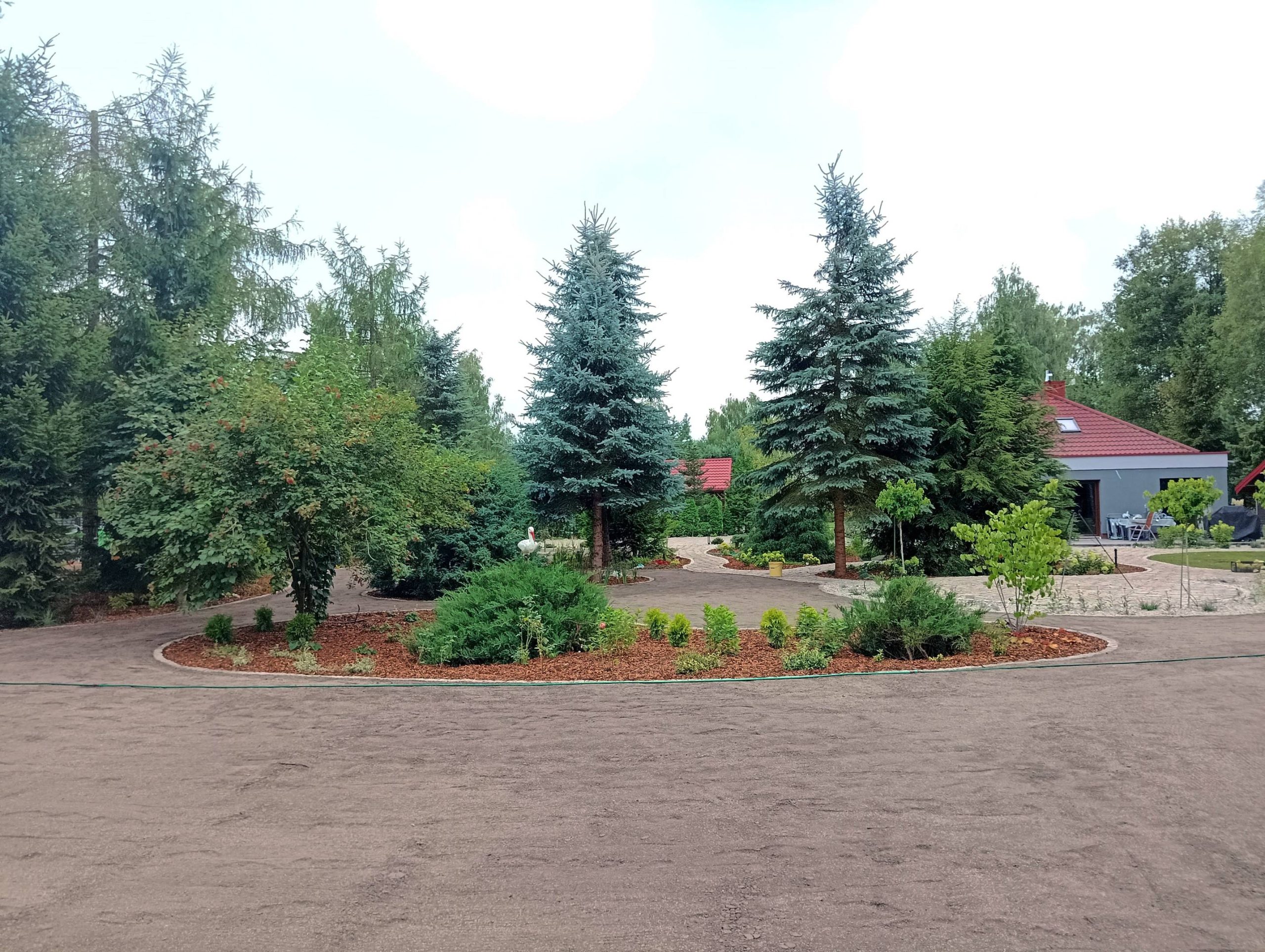 Kolista rabata na rondzie umożliwia przejazd w prawo do garażu albo na wprost, w stronę dalszej, zalesionej części działki.