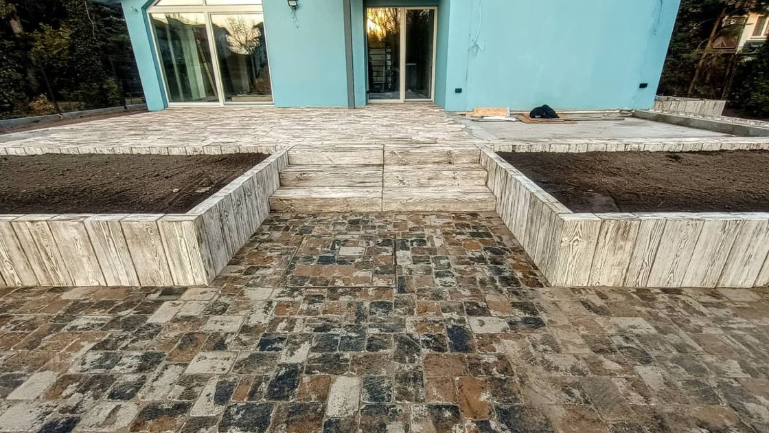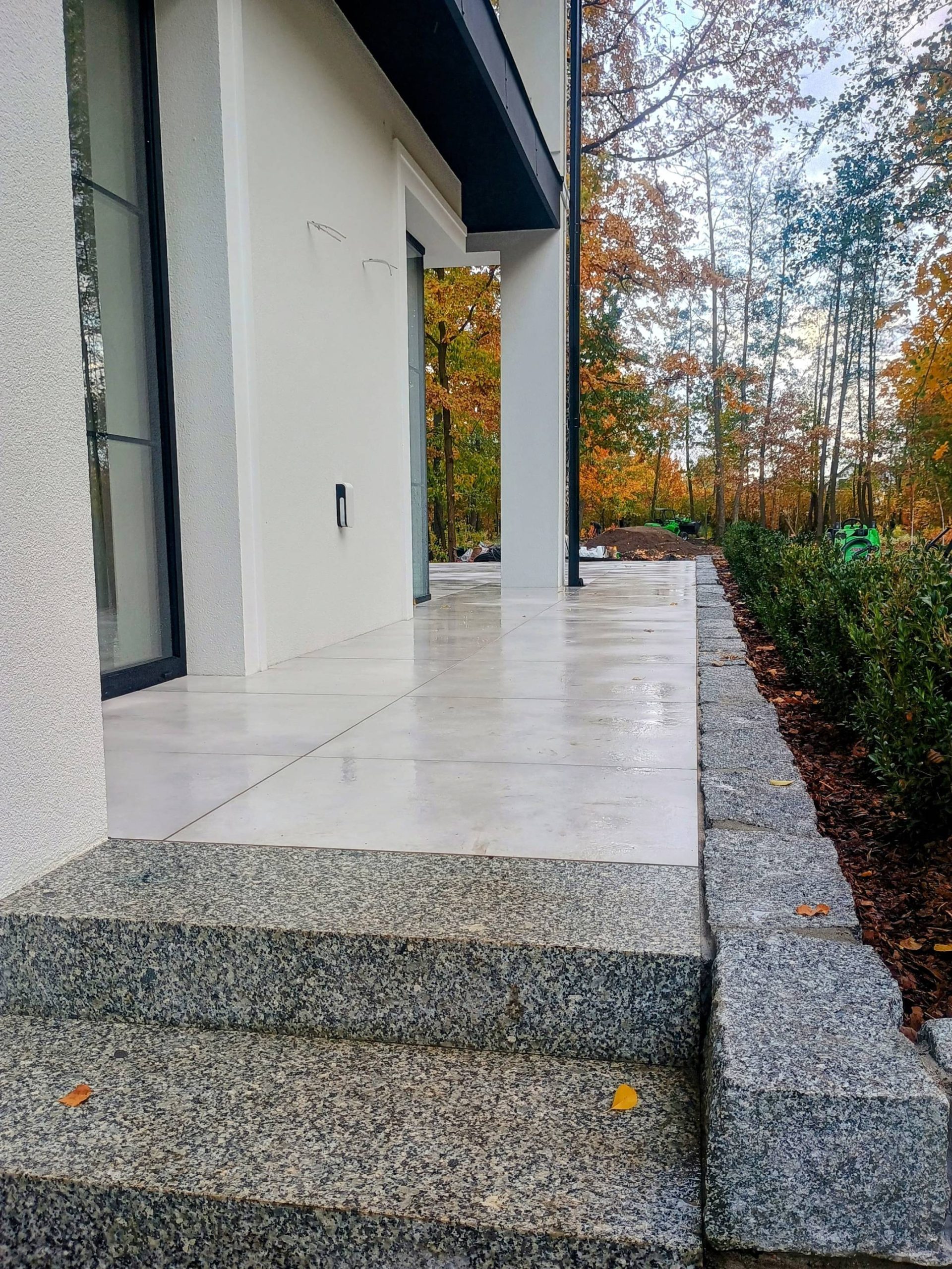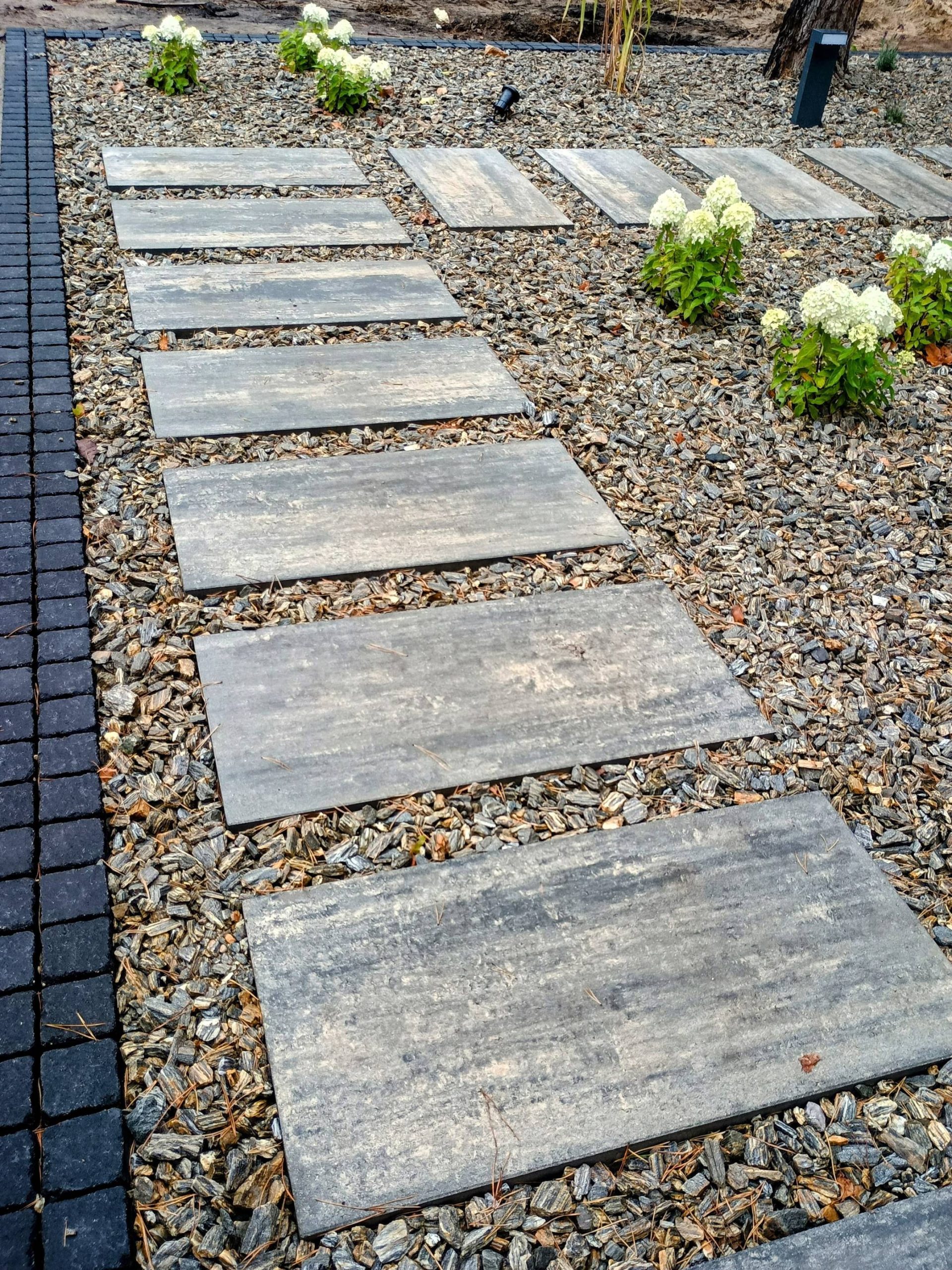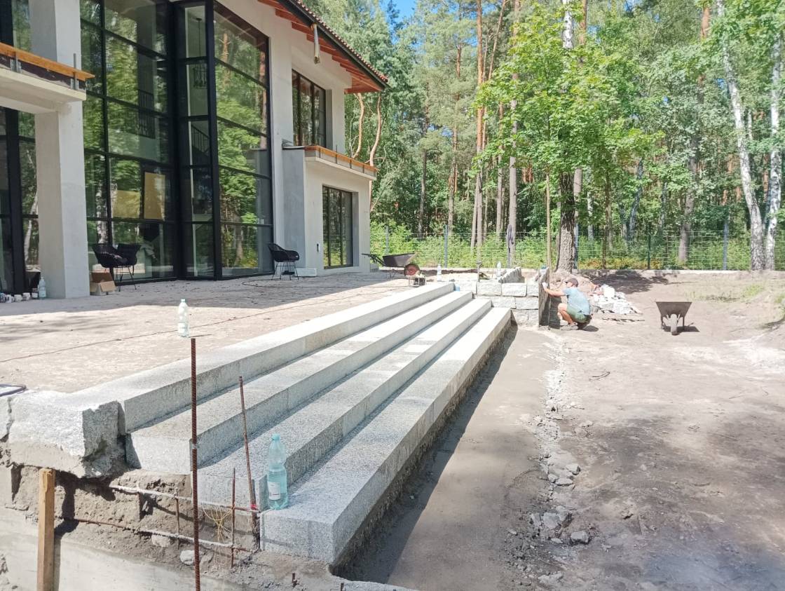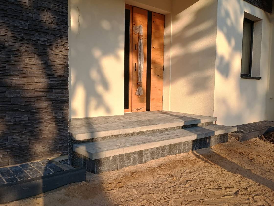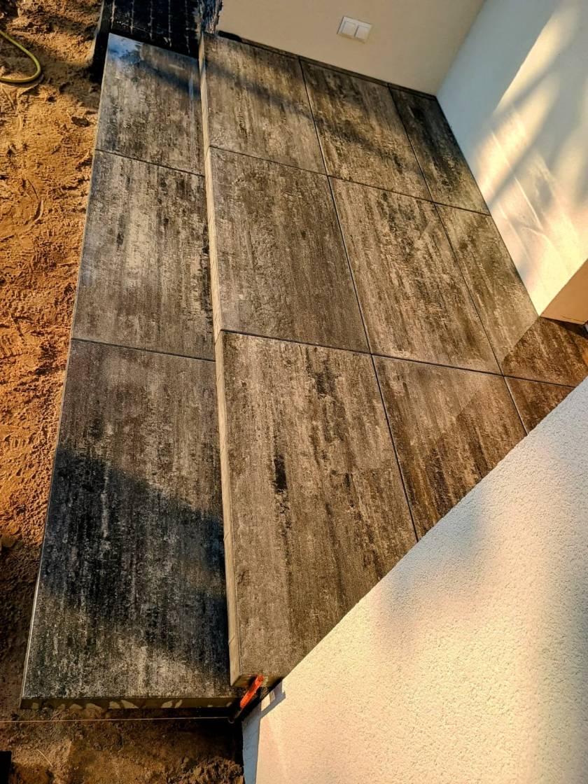 Dojścia z pojedynczych stopni wykonano z większych formatów 80x80 cm.