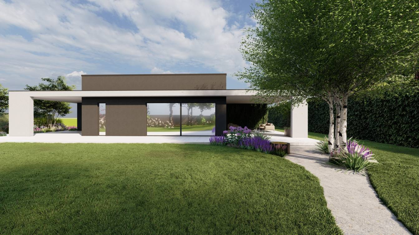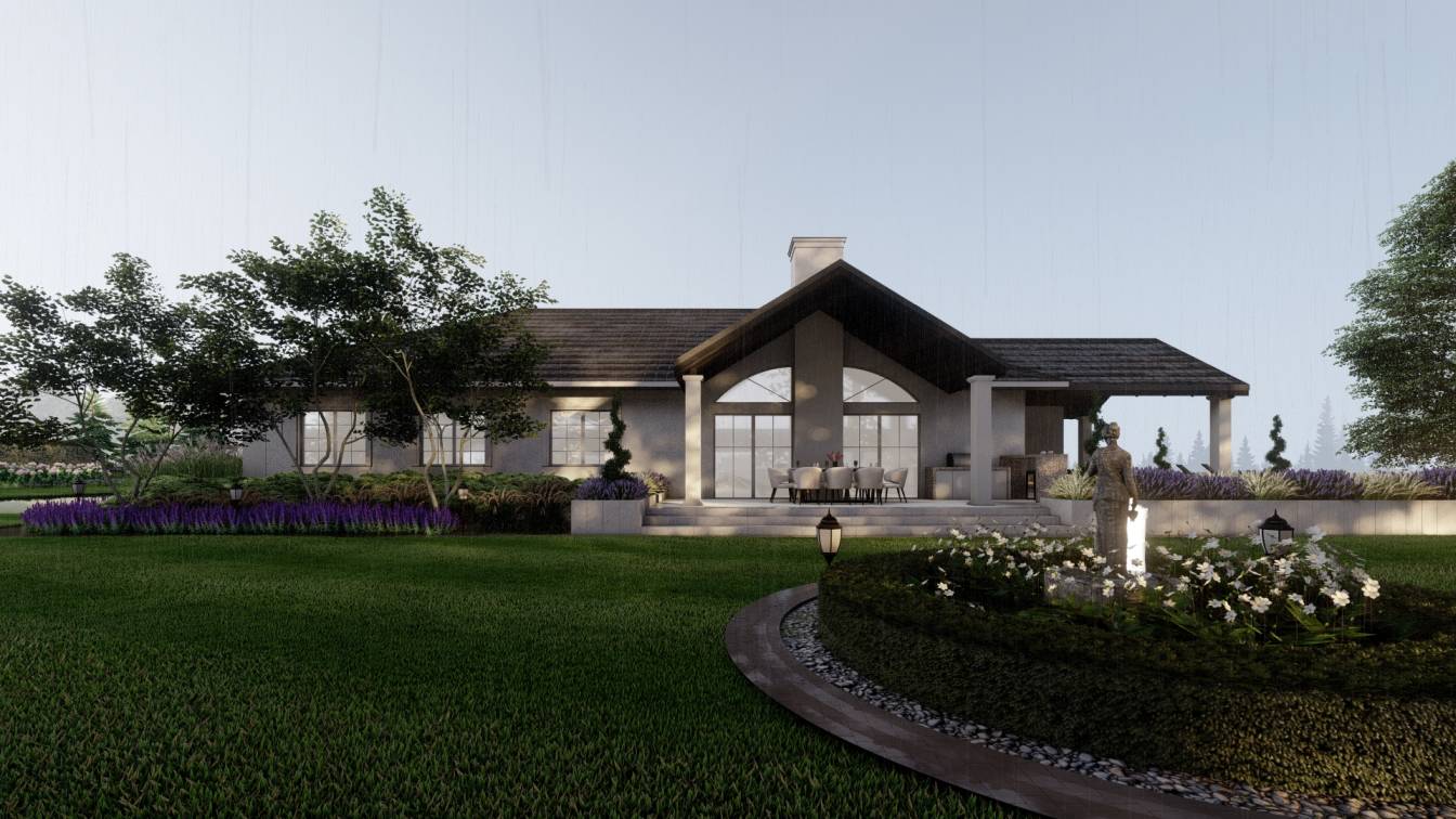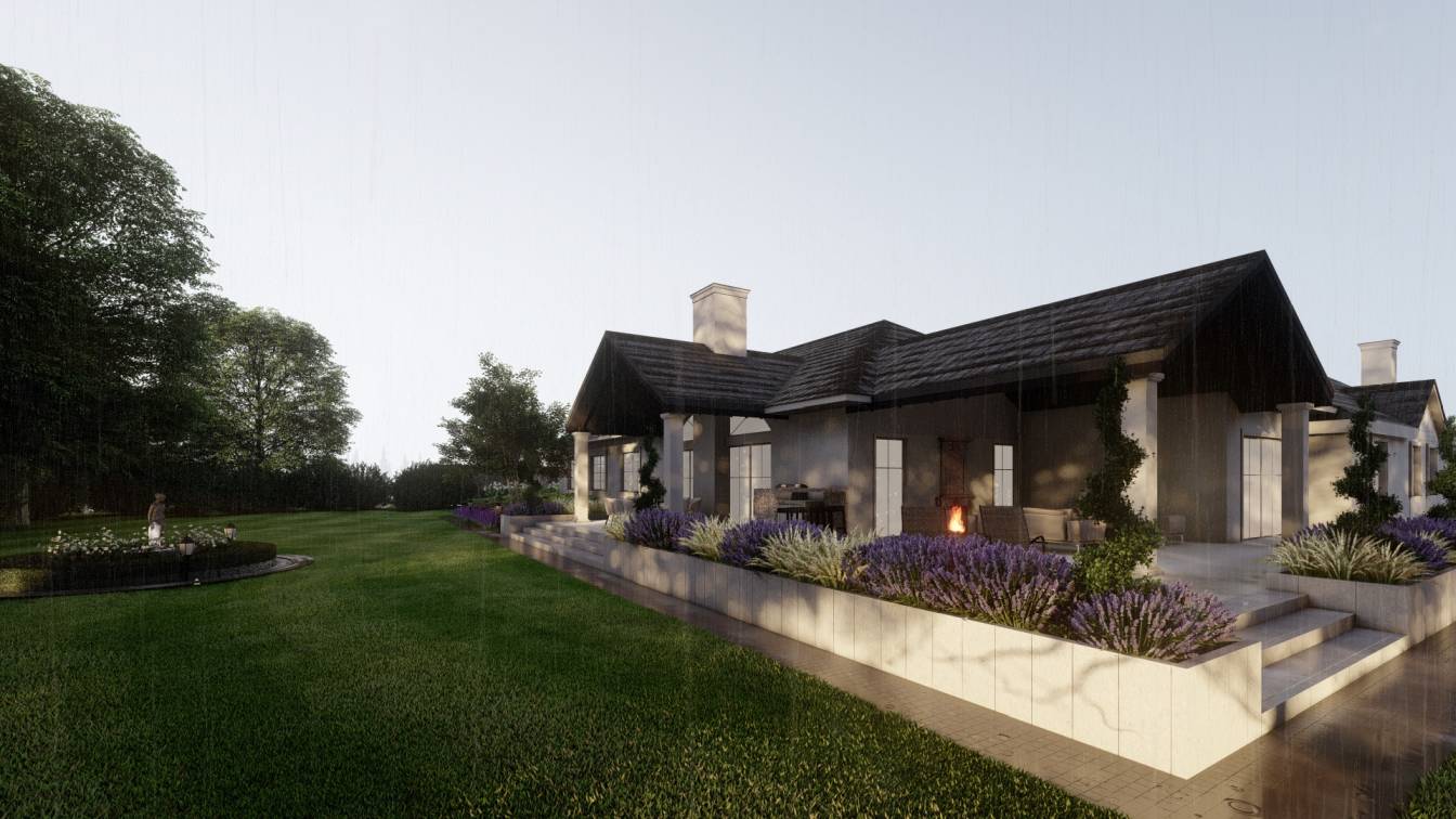 Projekt łączy nowoczesność z klasyką zarówno w aranżacji wnętrza, jak i w kompozycji ogrodu.