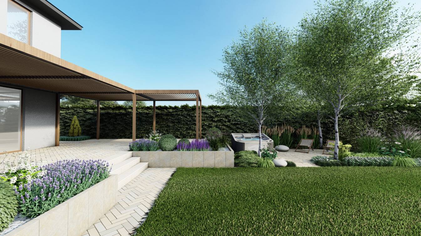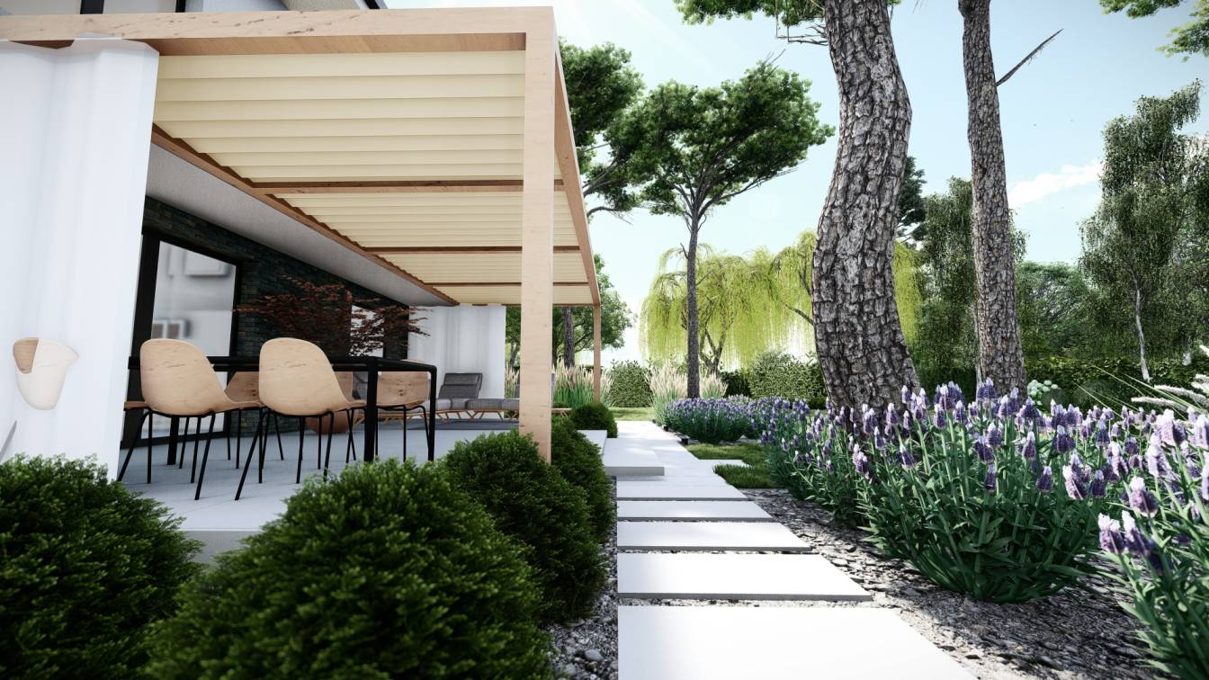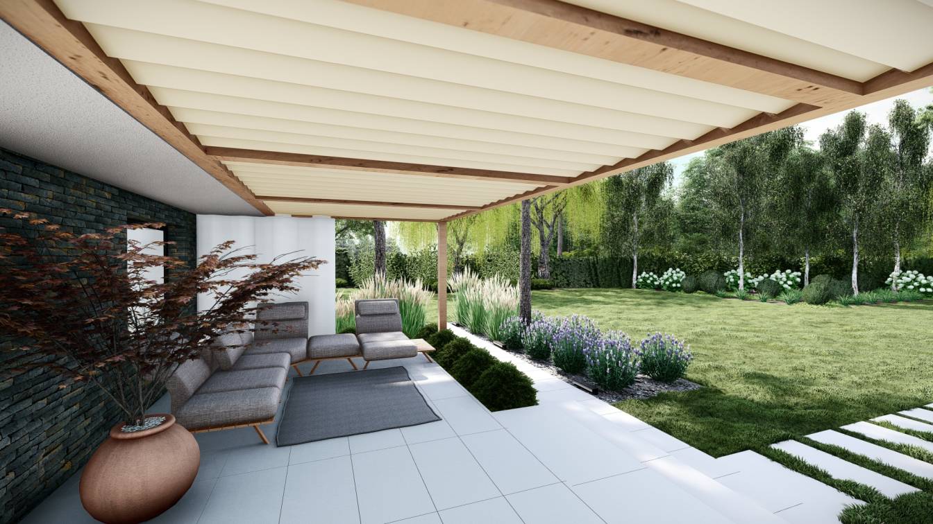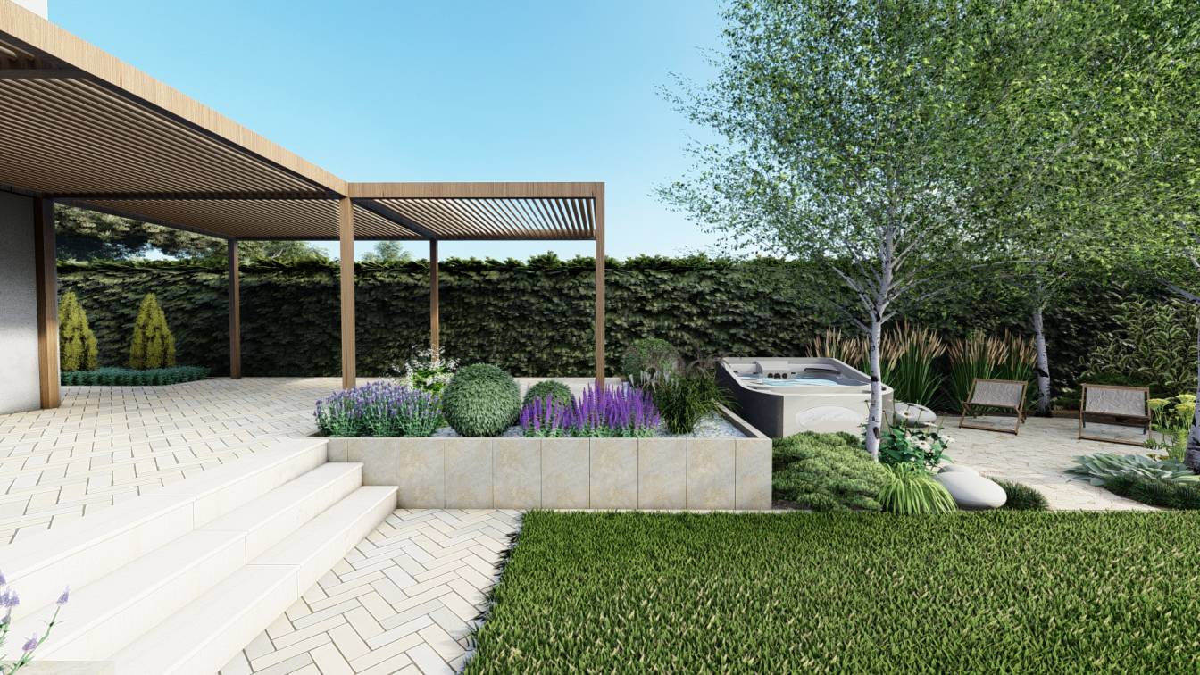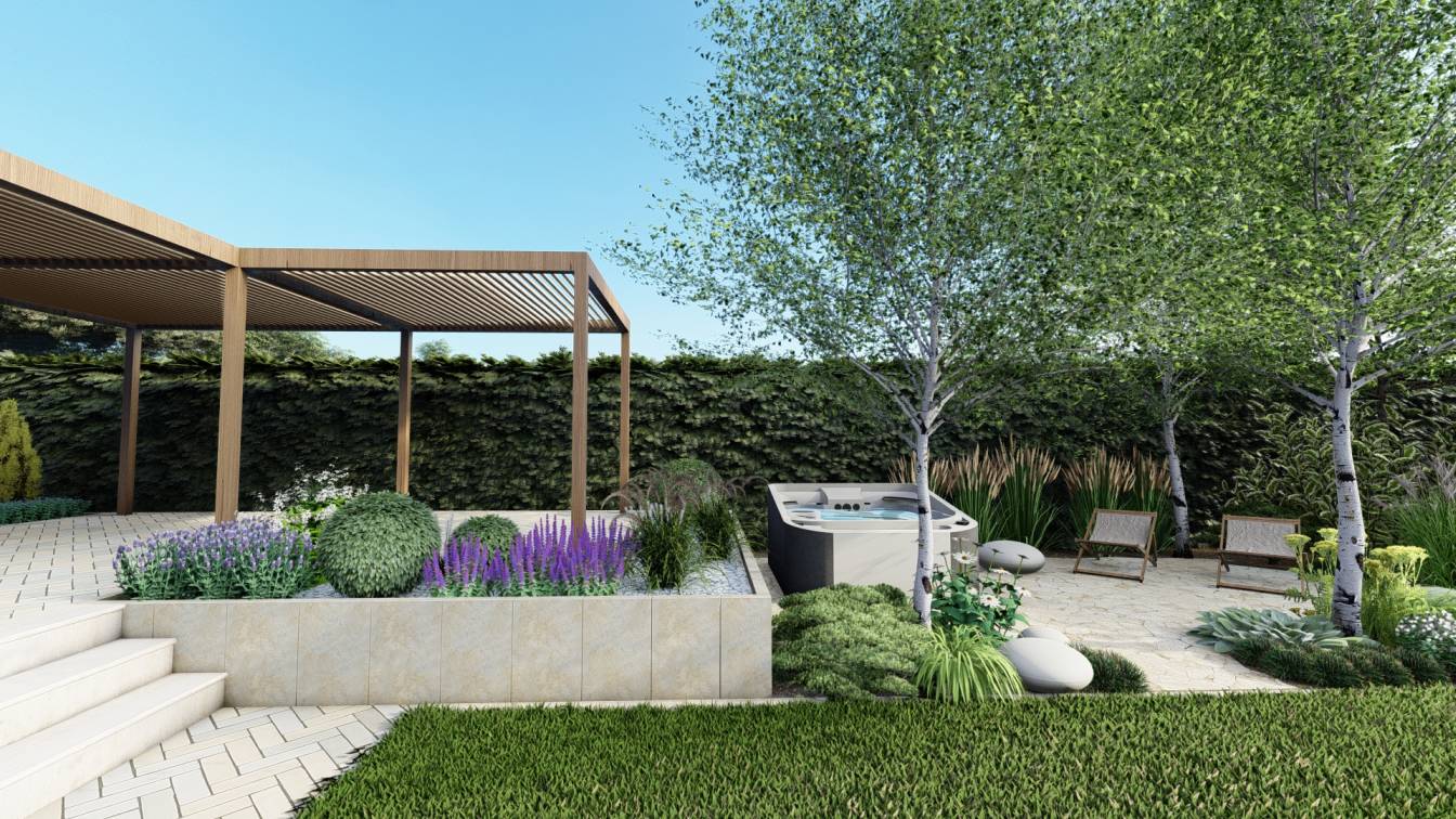 Zaplanowano też miejsce na pergolę, pod którą można ustawić jacuzzi lub grill oraz meble do biesiadowania.