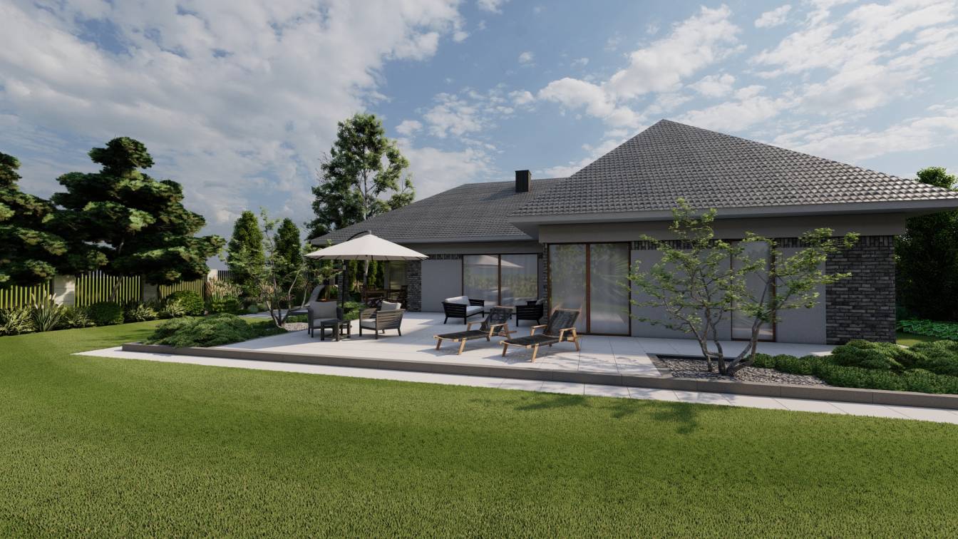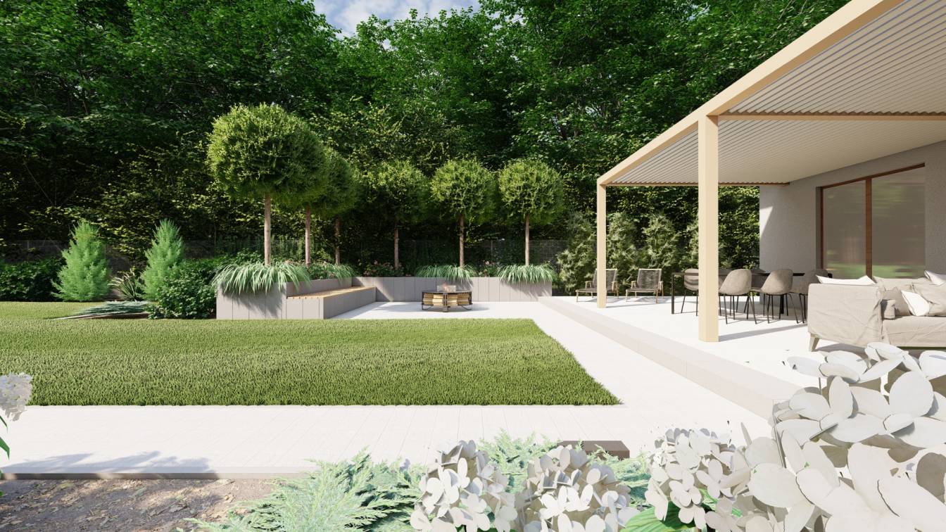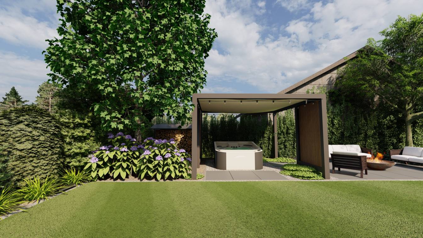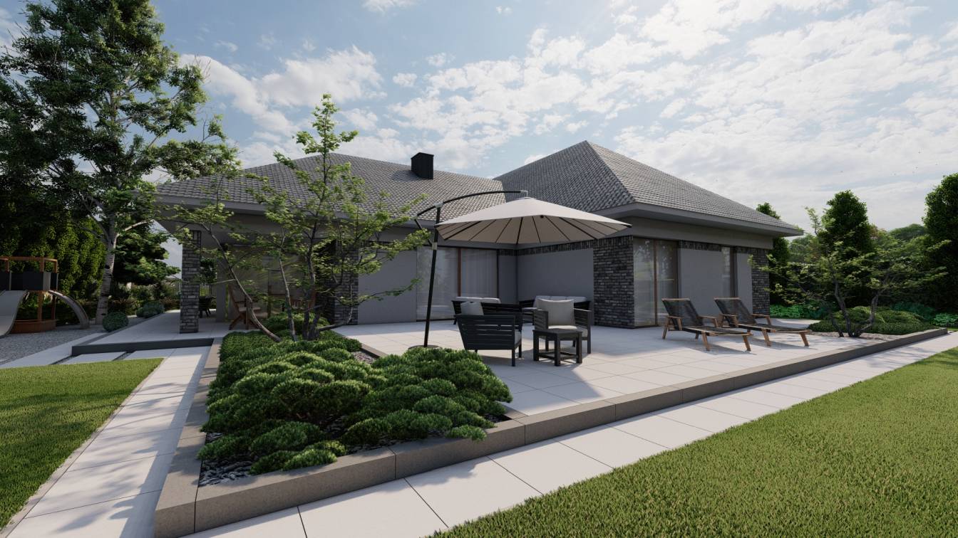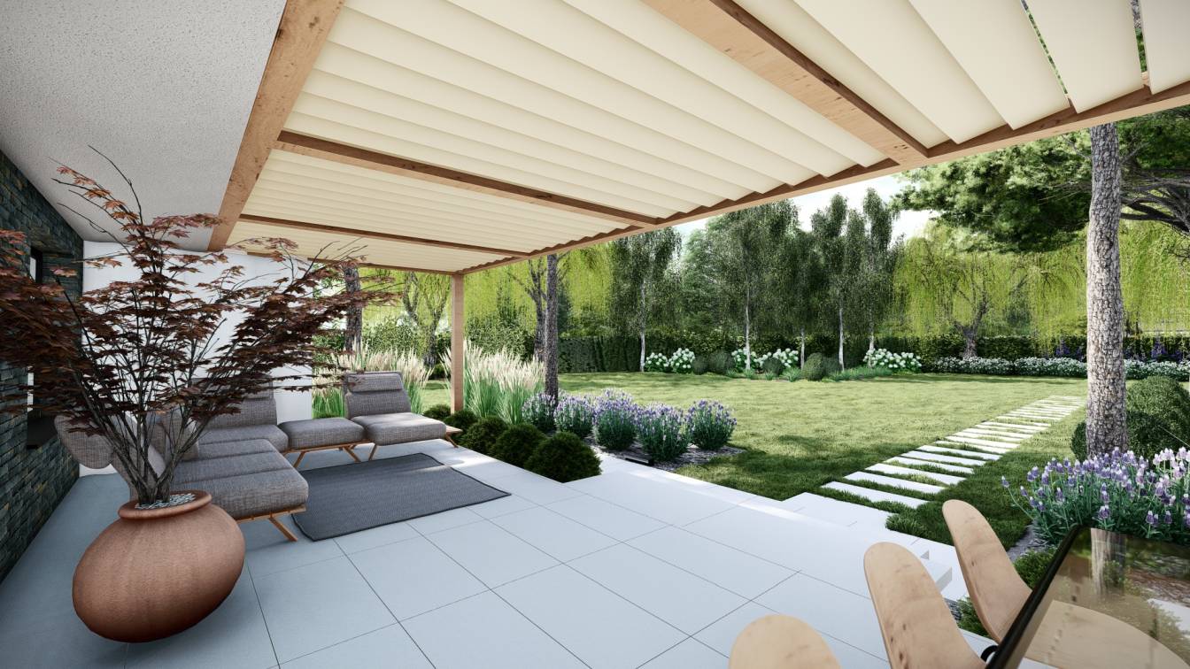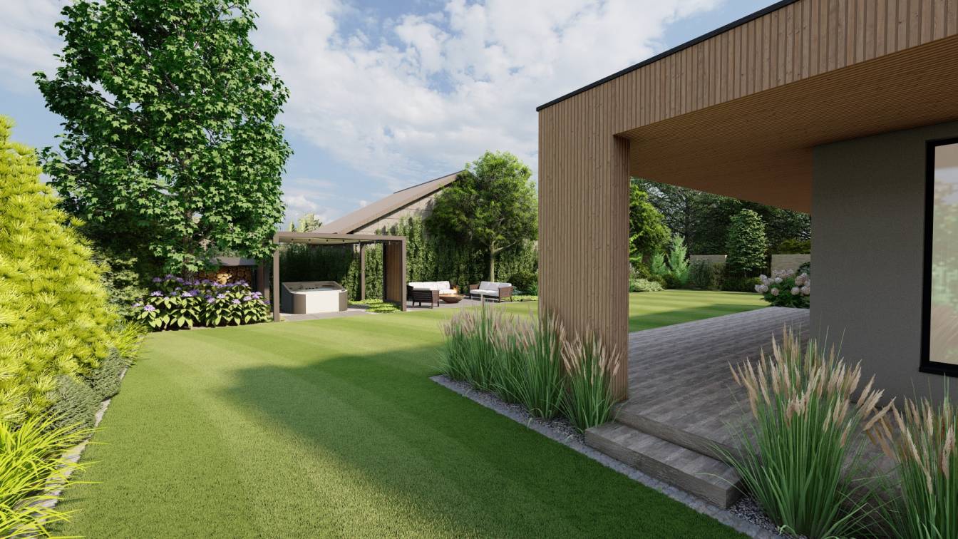Zaplanowano też miejsce na pergolę, pod którą można ustawić jacuzzi lub grill oraz meble do biesiadowania.
