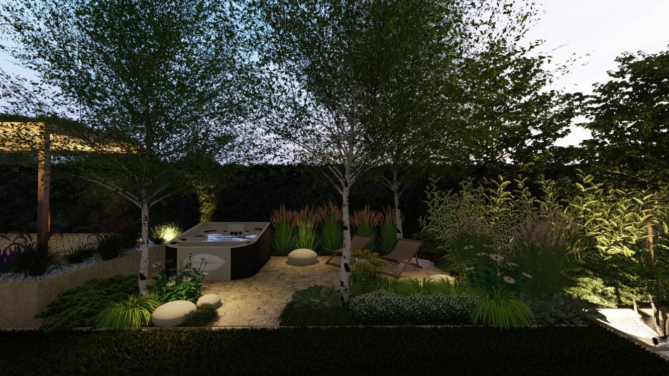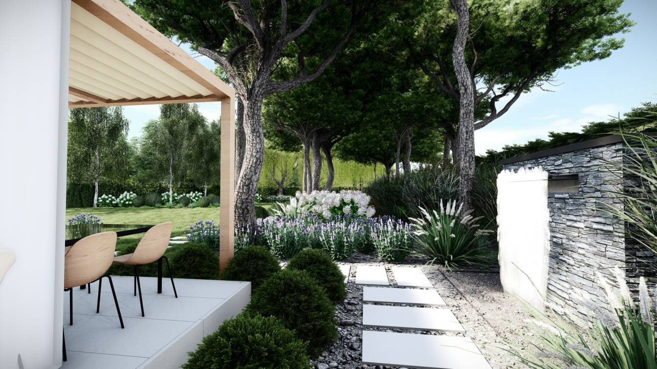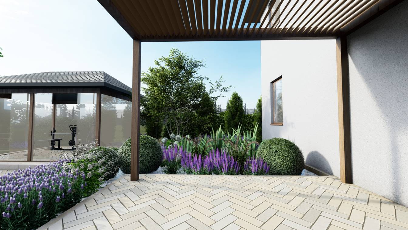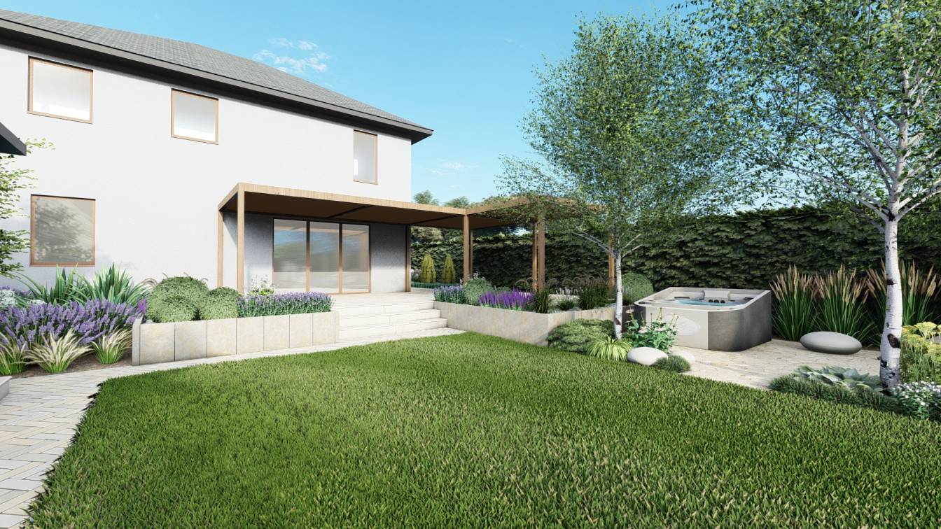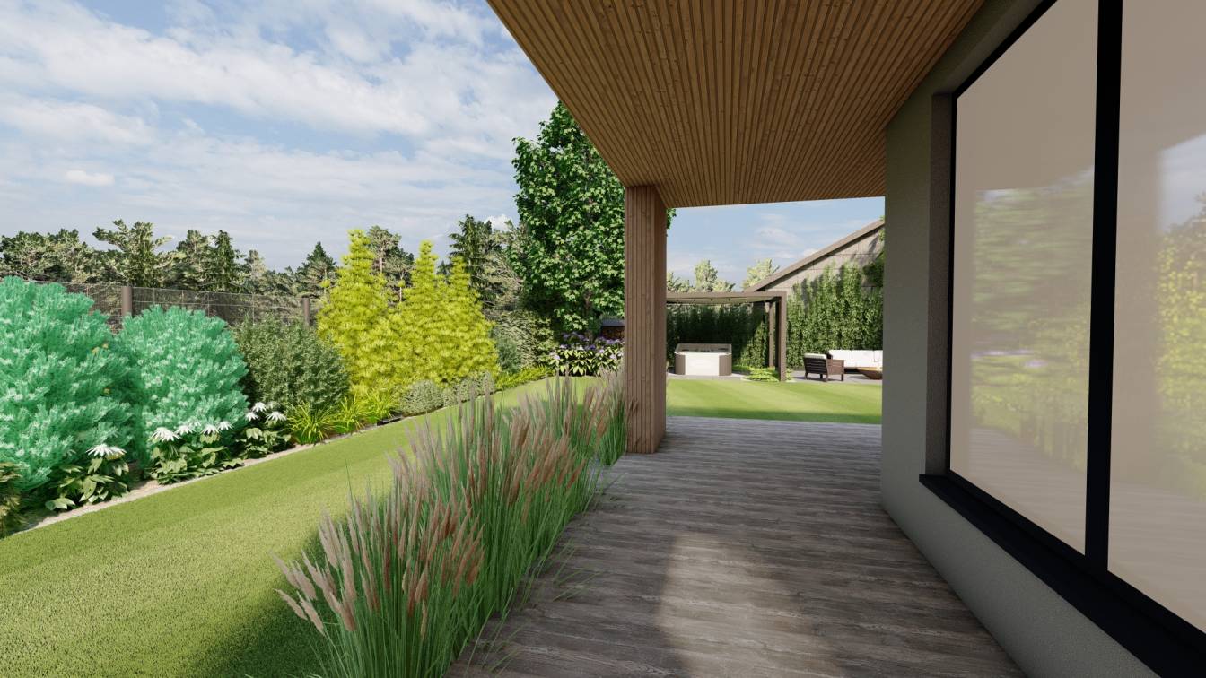 Zaplanowano też miejsce na pergolę, pod którą można ustawić jacuzzi lub grill oraz meble do biesiadowania.