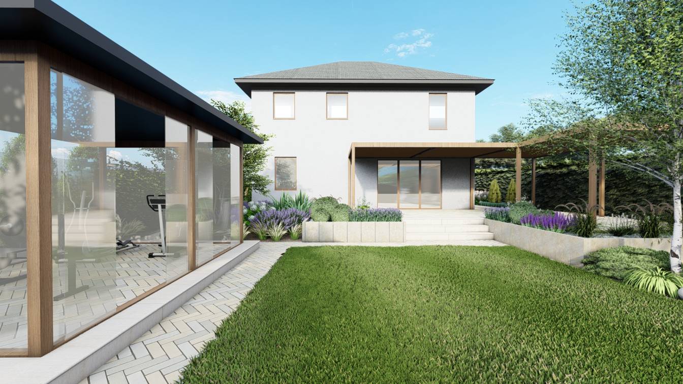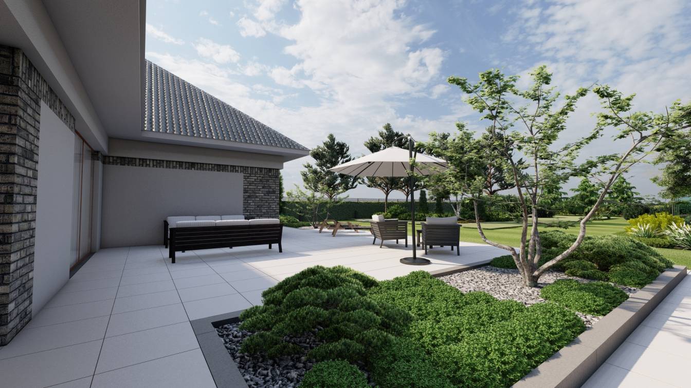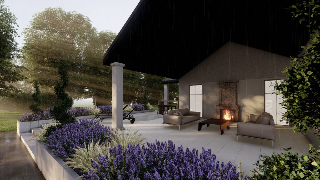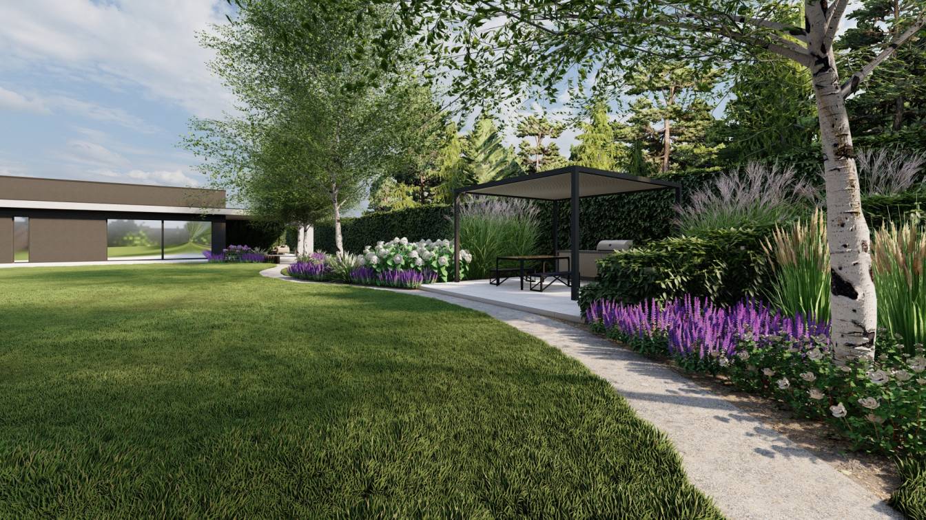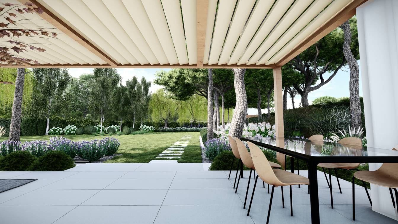 Zaplanowano też miejsce na pergolę, pod którą można ustawić jacuzzi lub grill oraz meble do biesiadowania.