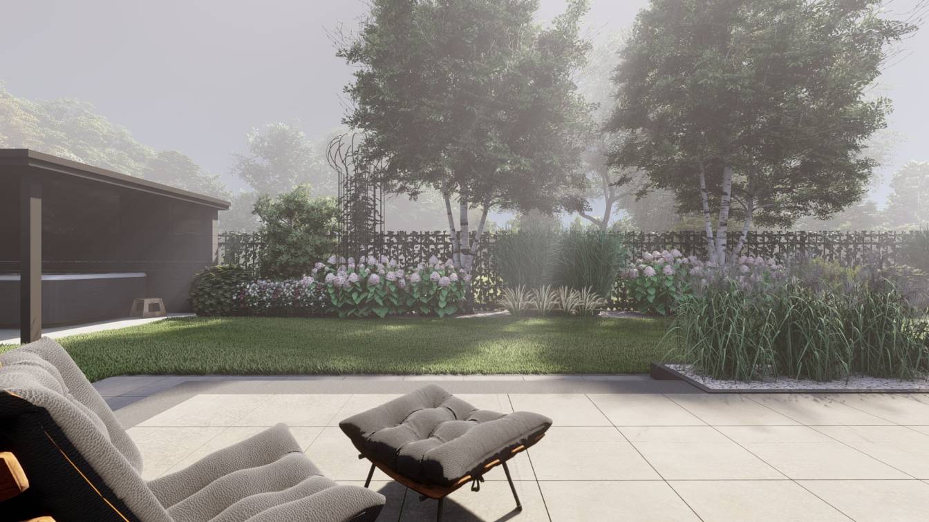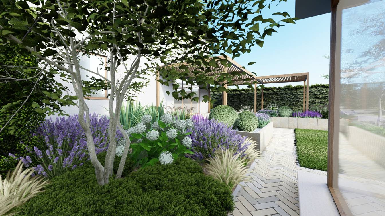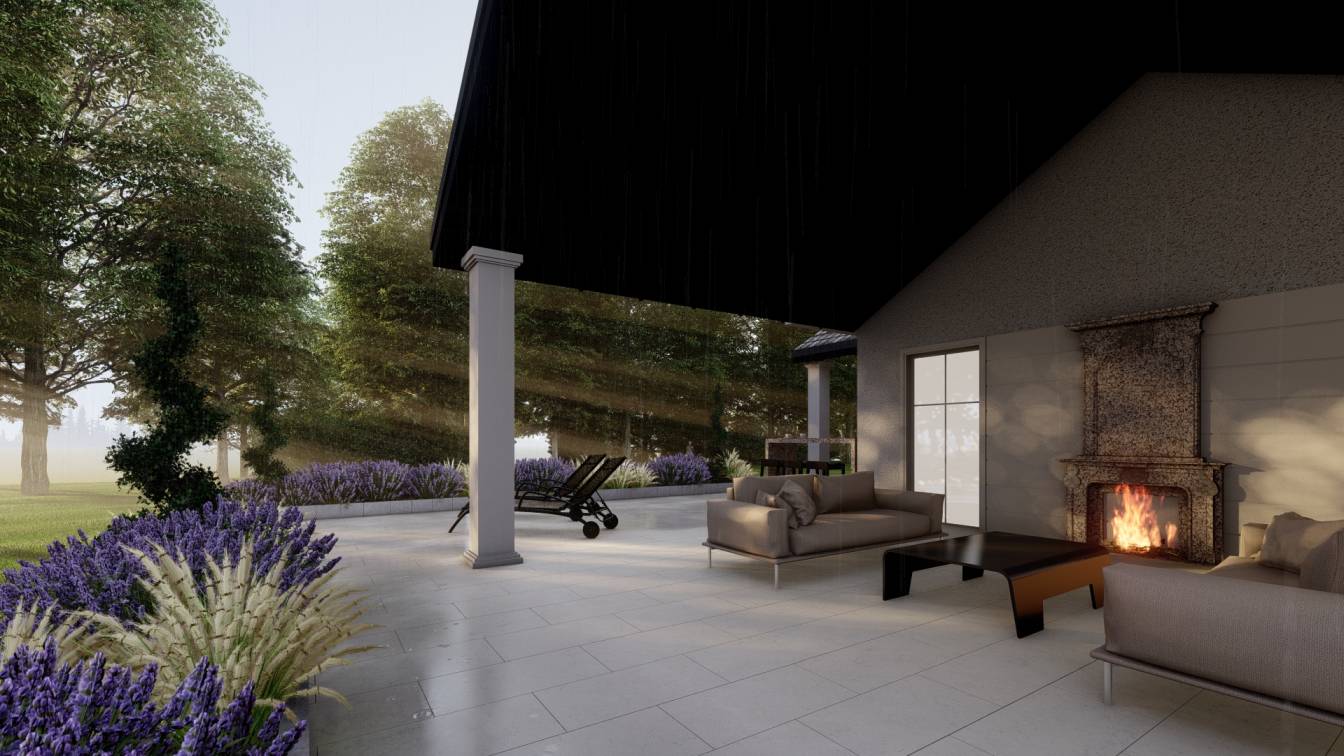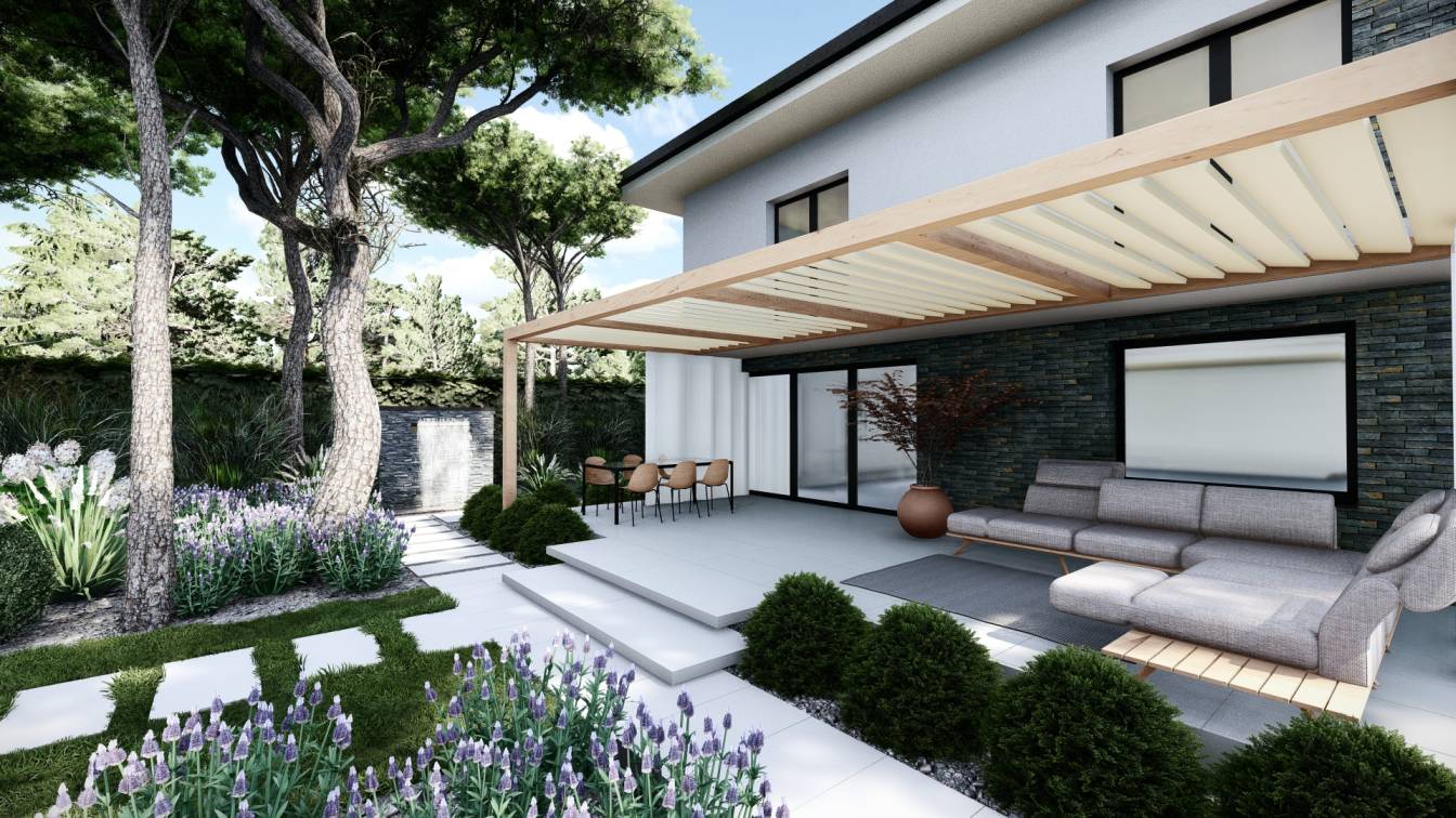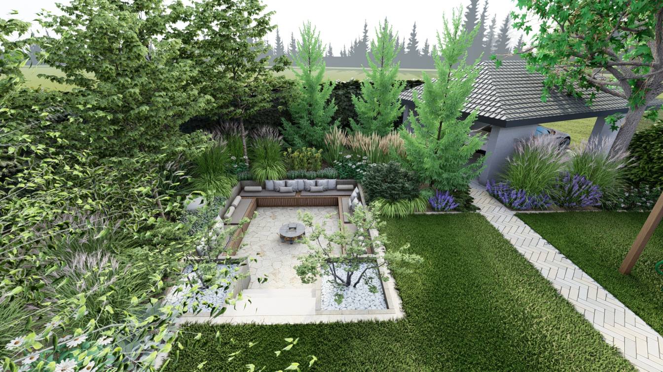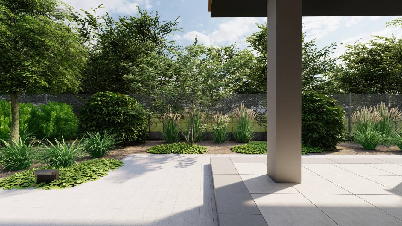 Zaplanowano też miejsce na pergolę, pod którą można ustawić jacuzzi lub grill oraz meble do biesiadowania.