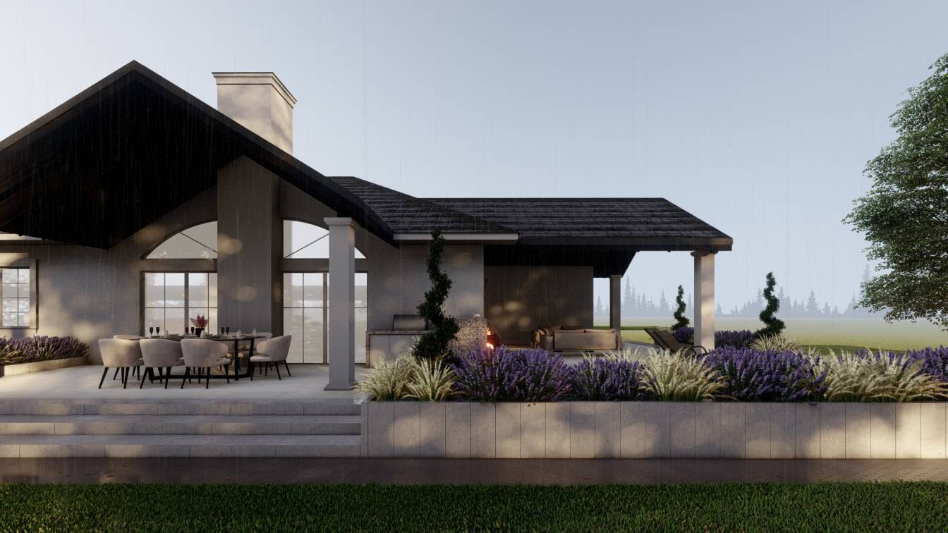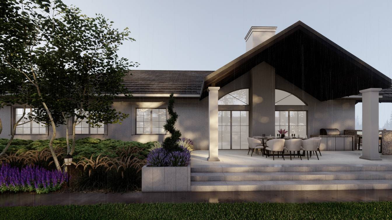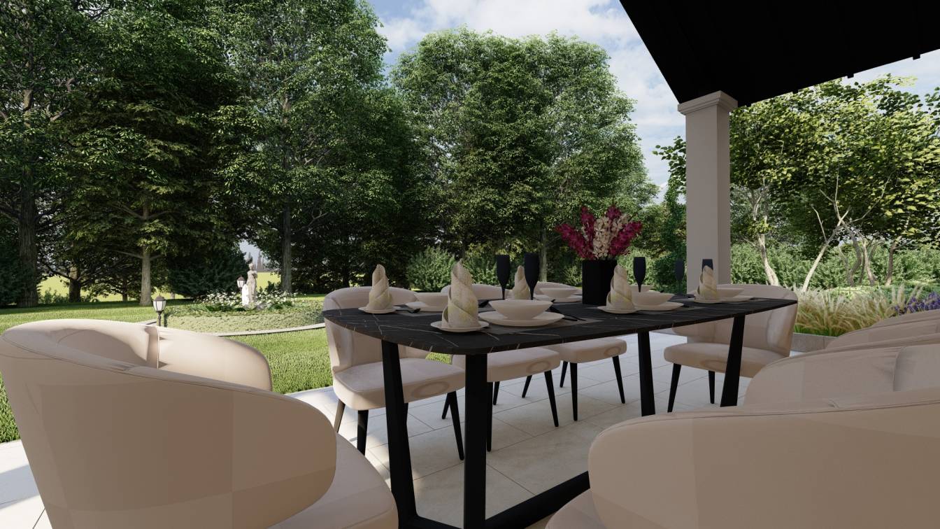Zaplanowano zabudowaną kuchnię zewnętrzną oraz strefę wypoczynku z meblami ogrodowymi.