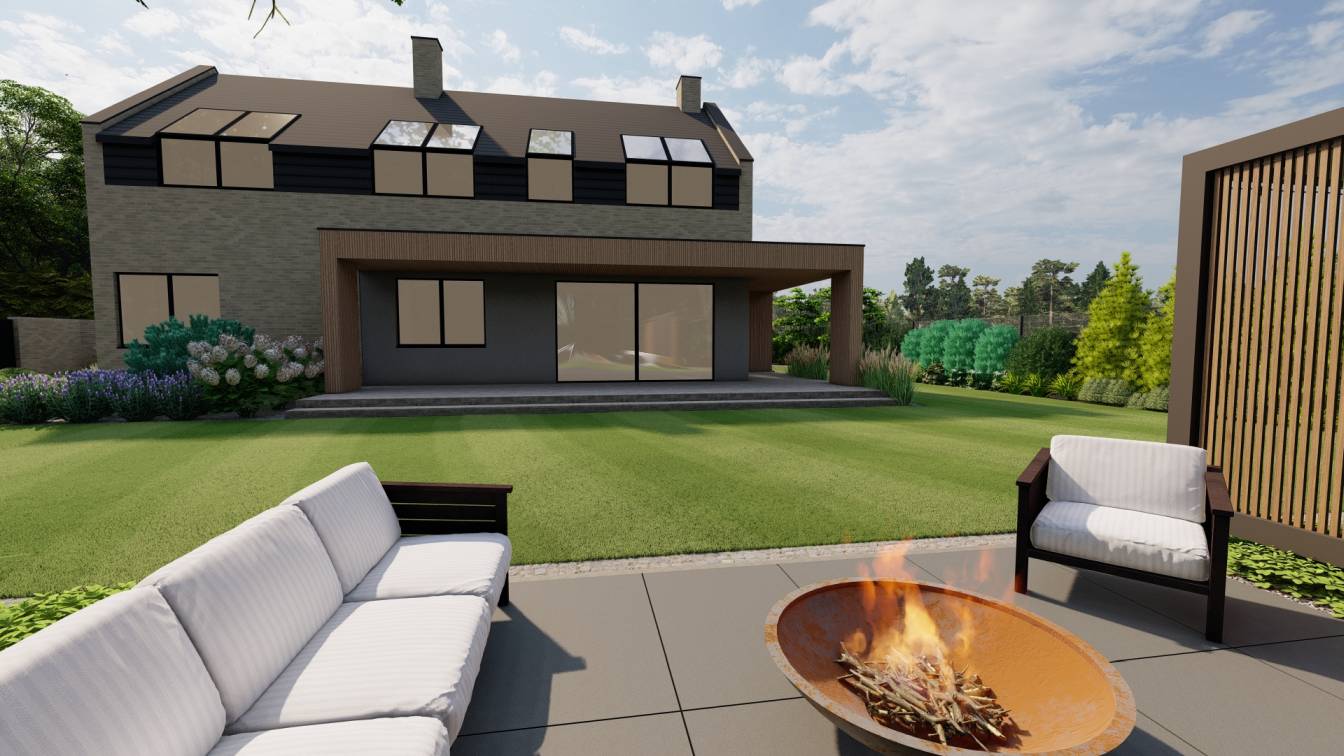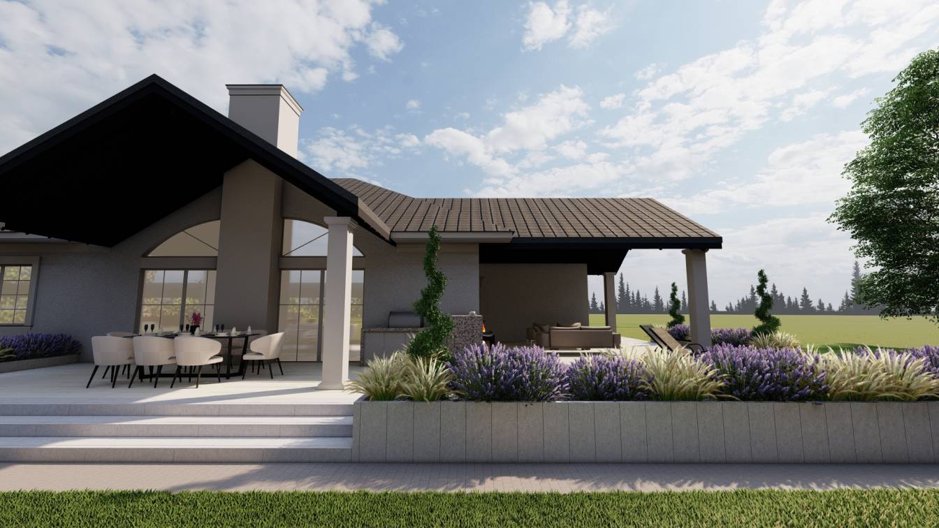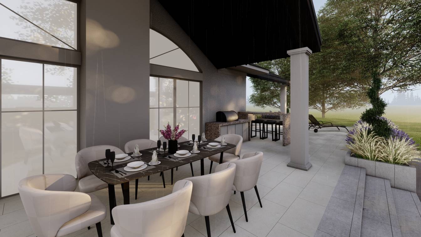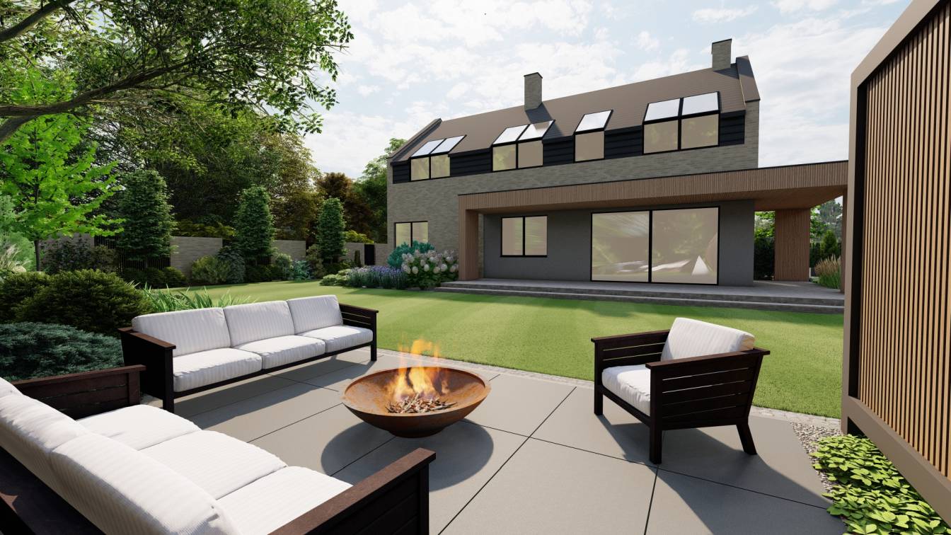 Zaplanowano zabudowaną kuchnię zewnętrzną oraz strefę wypoczynku z meblami ogrodowymi.
