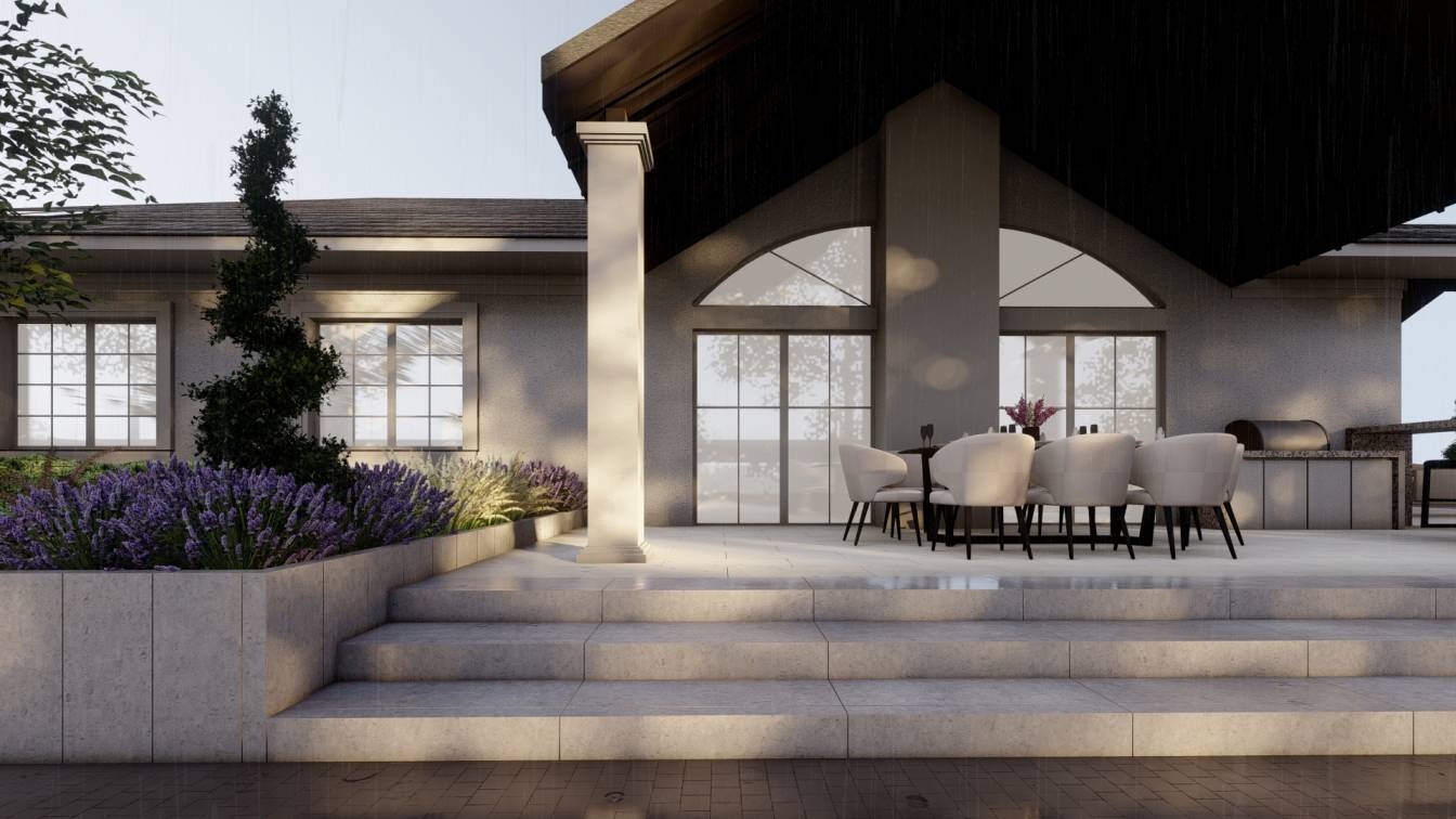 Trawertyn wybrano jako wykończenie schodów, nawierzchni ścieżek oraz tarasu.