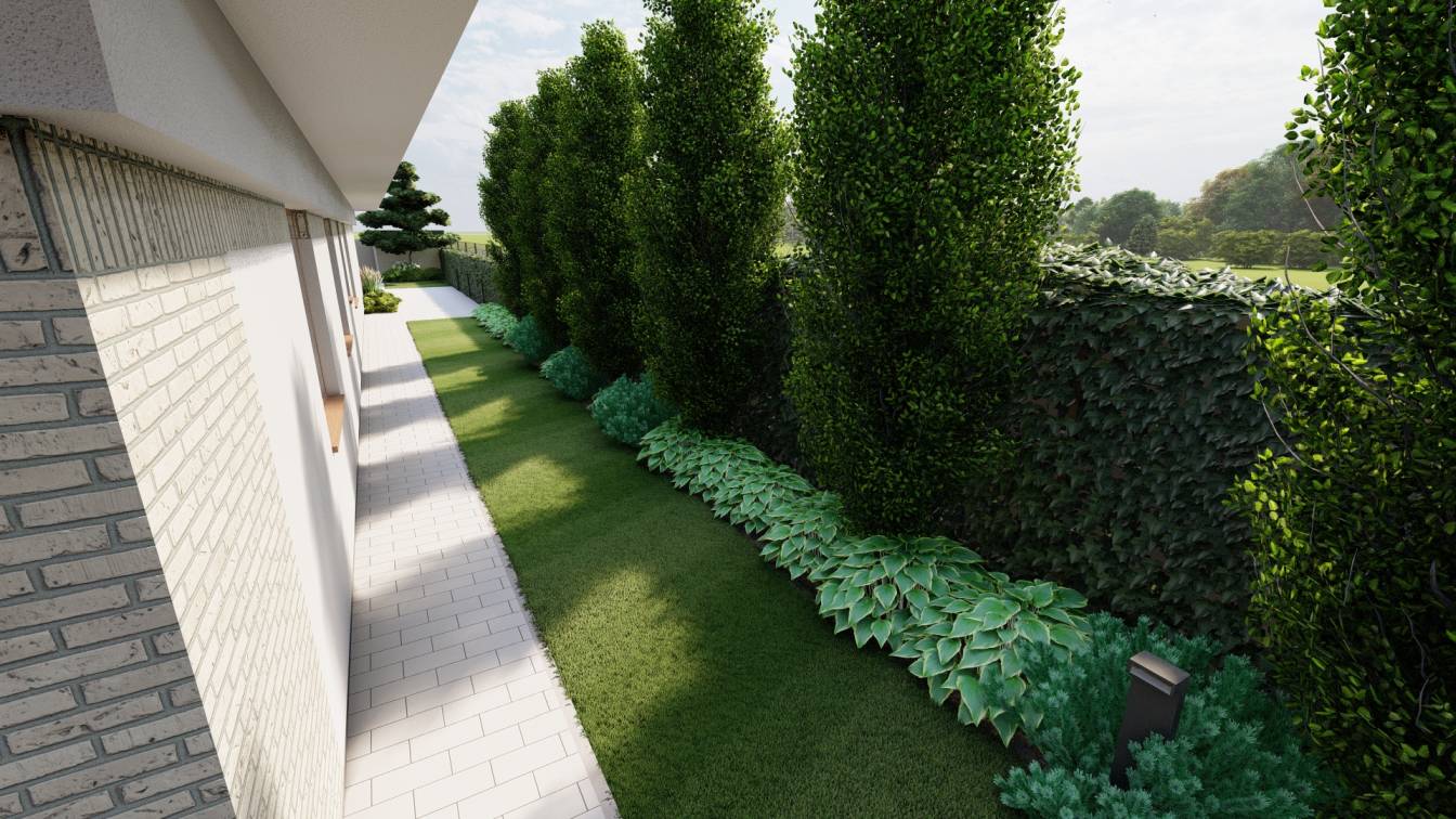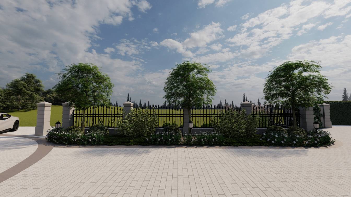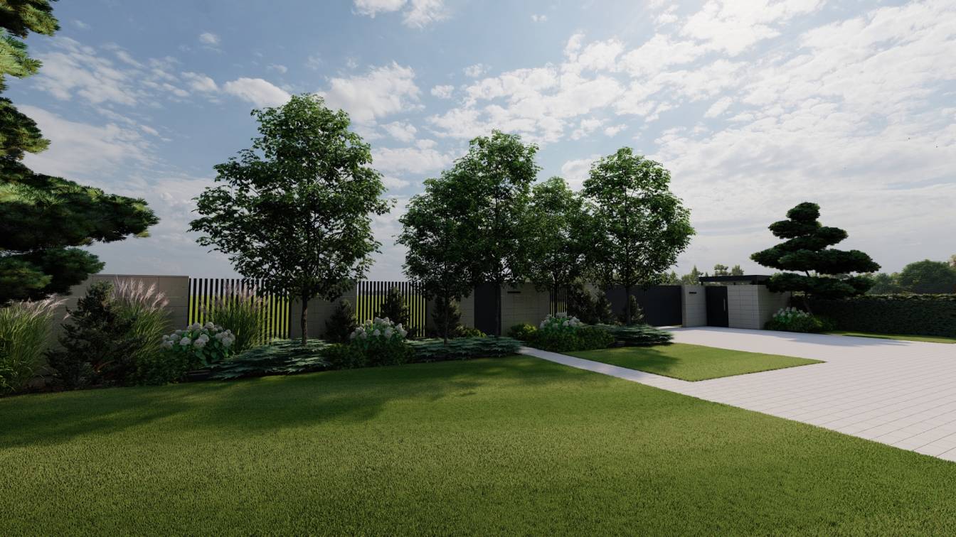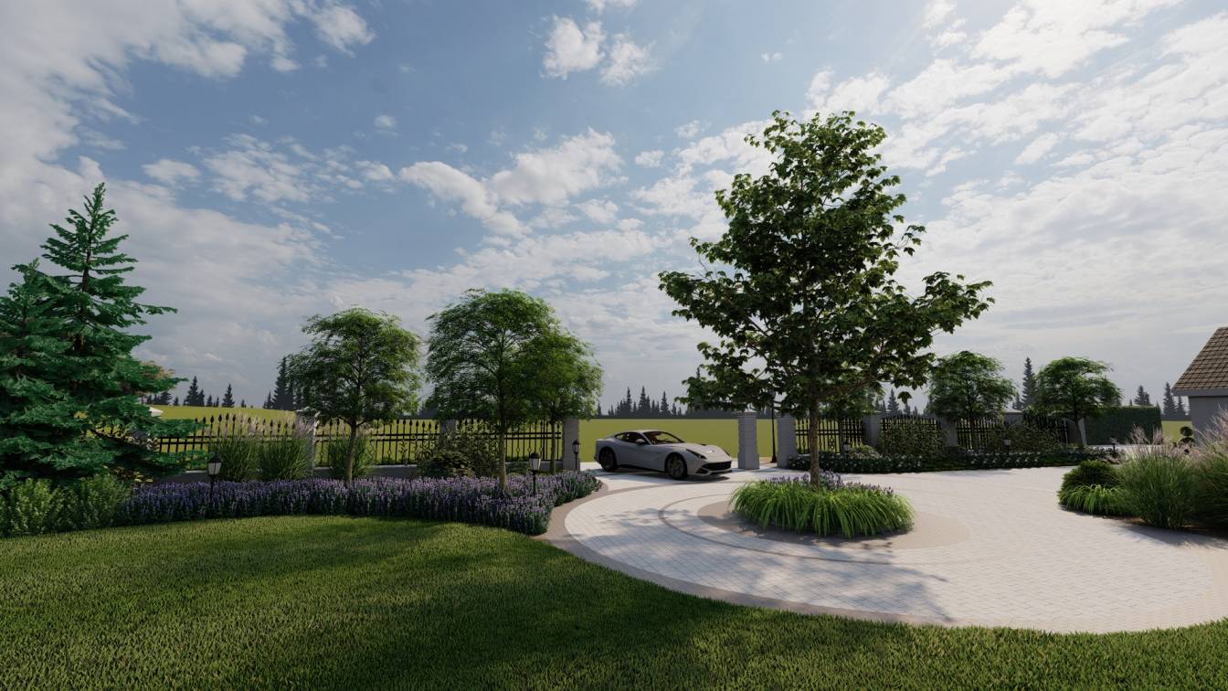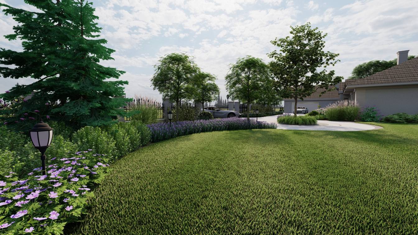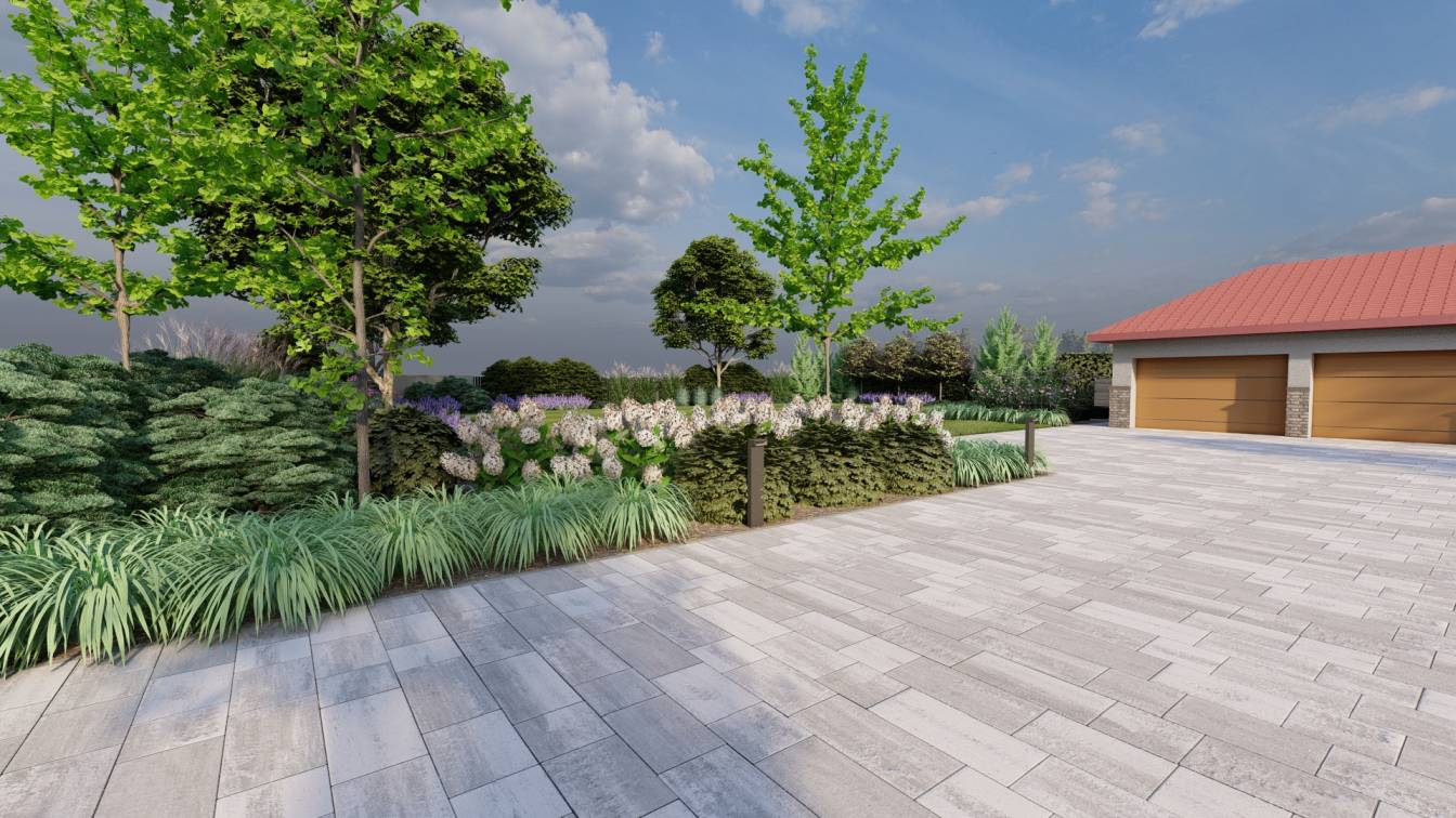 Podział przestrzeni na bardzo duży podjazd, trawnik oraz sektory rabat wydzielone wzdłuż ogrodzenia.