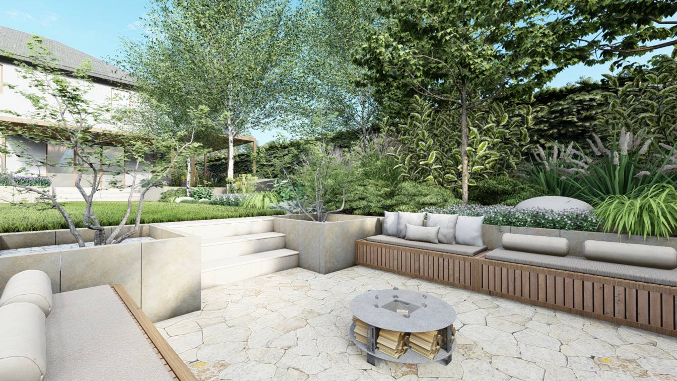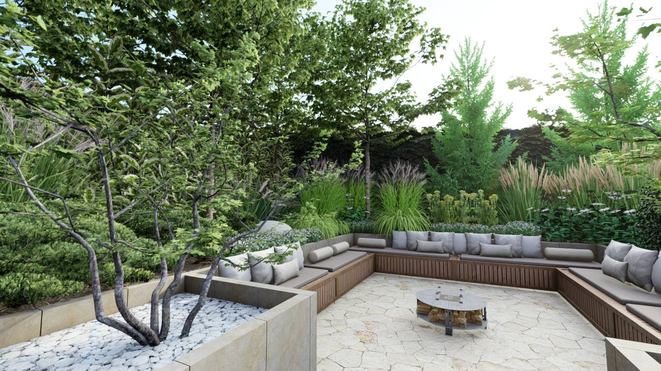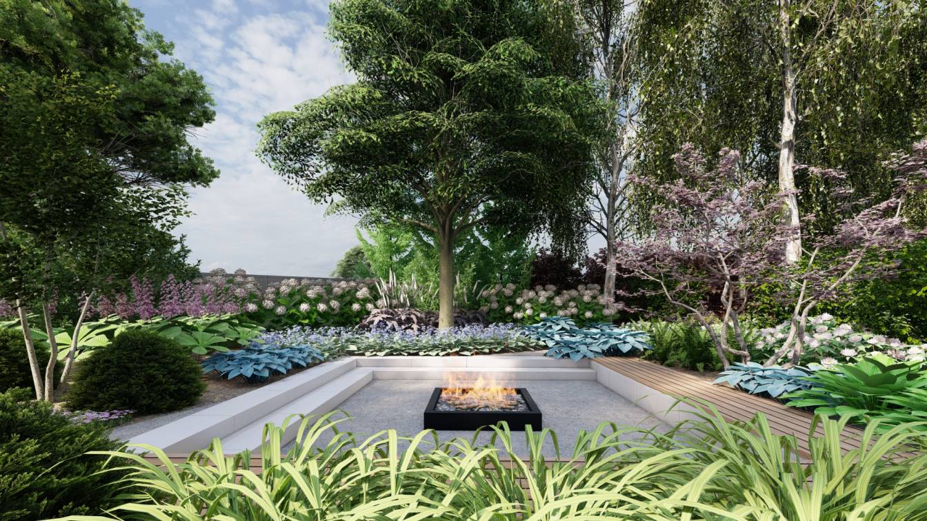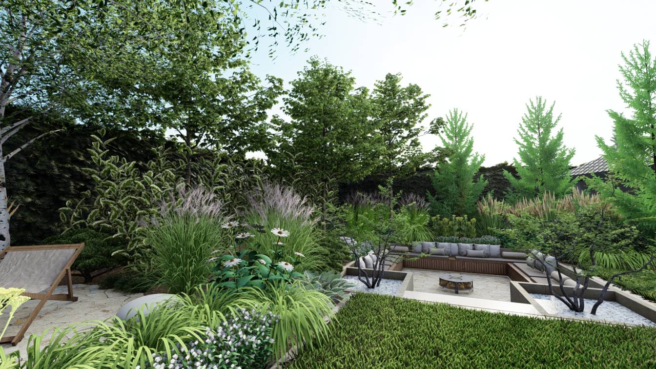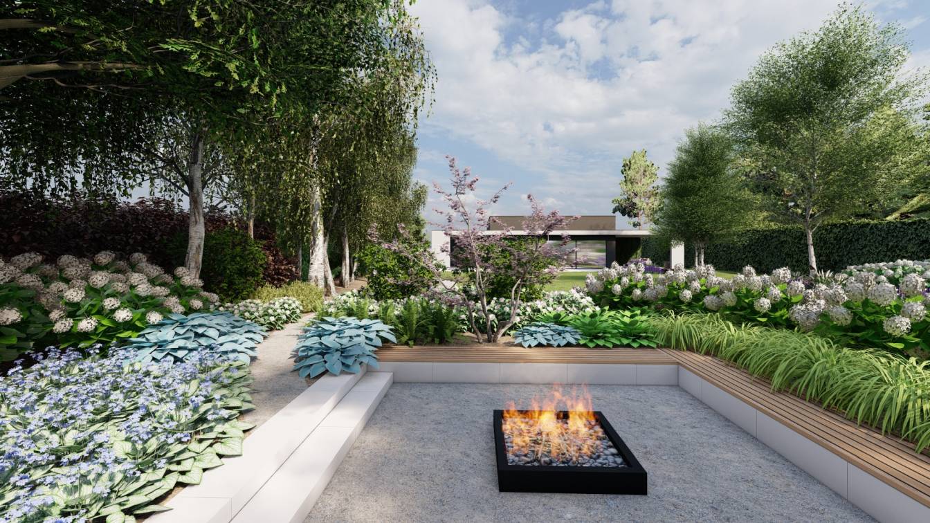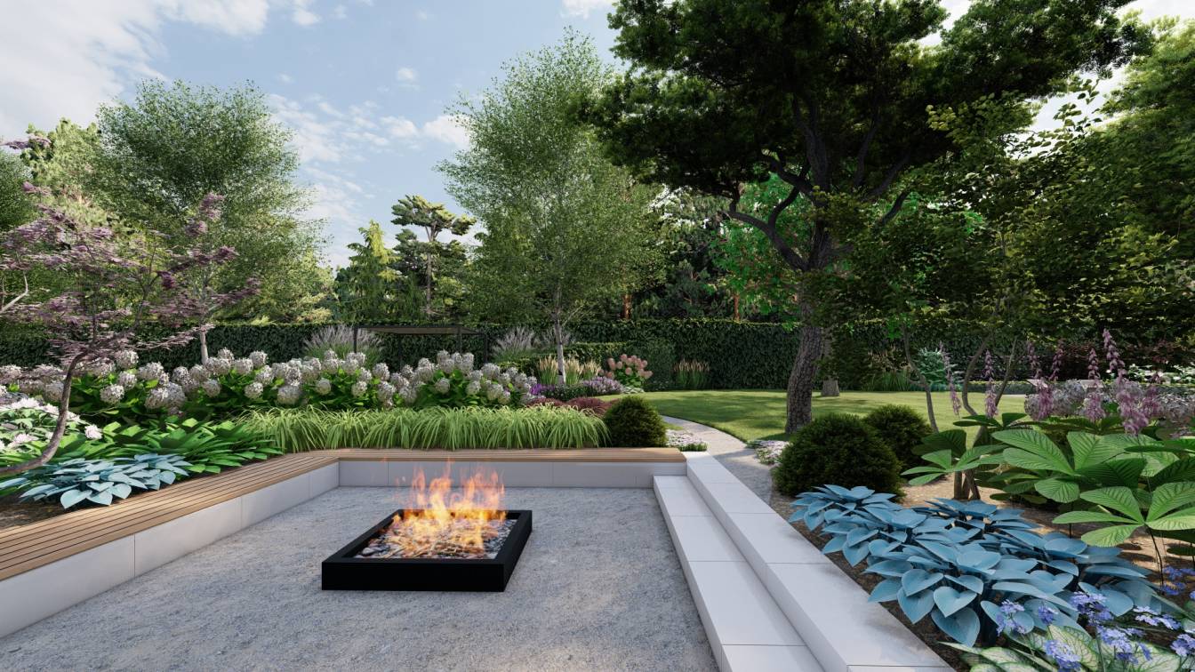 Ogród zaprojektowany przy parterowej willi położonej w lesie.