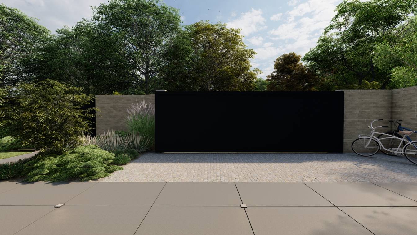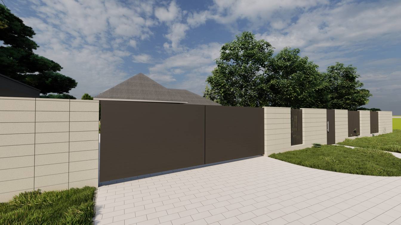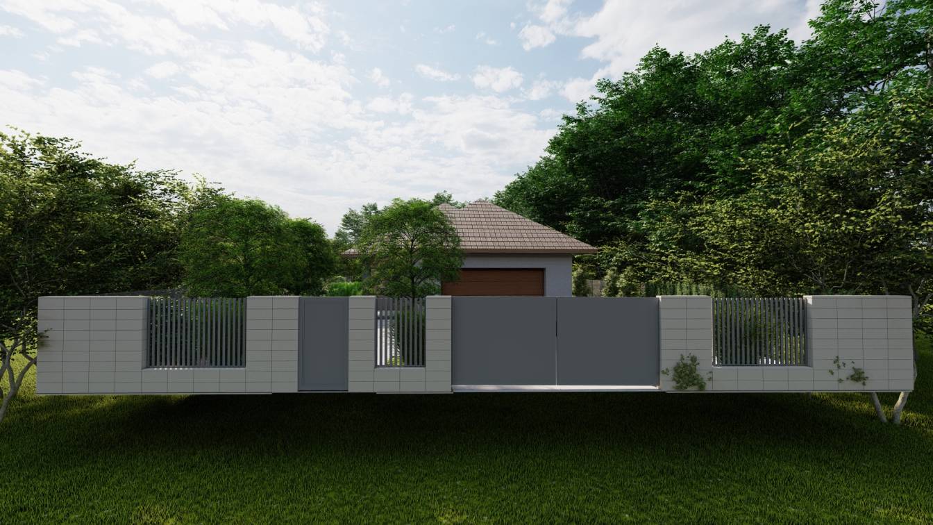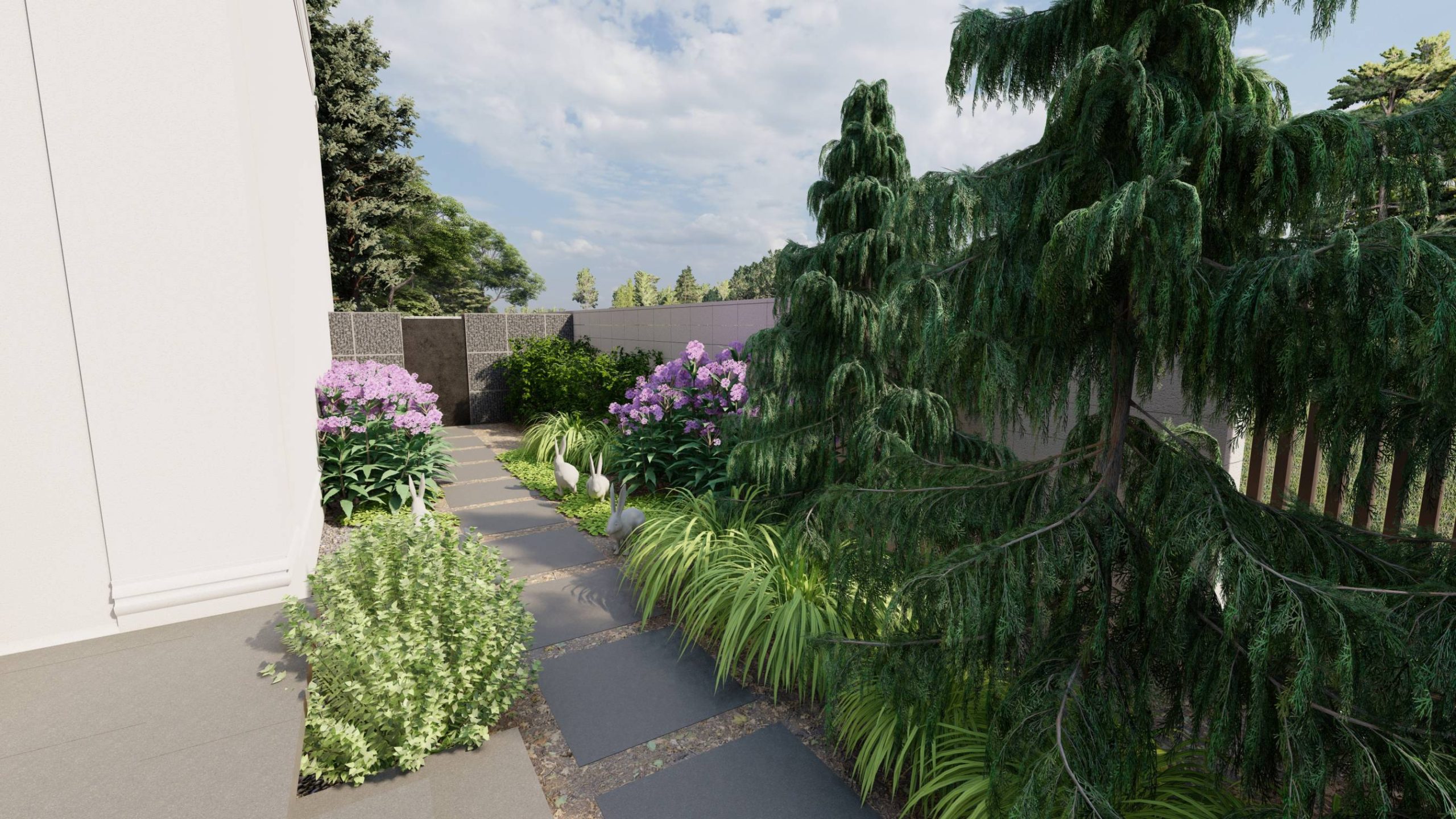 Życzeniem klientów było zamknięcie tyłu ogrodu ogrodzeniem gabionowym, z furtką po jednej stronie.