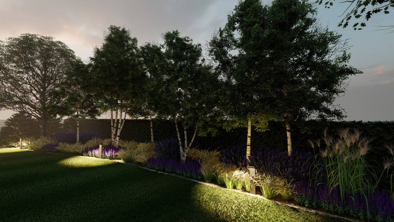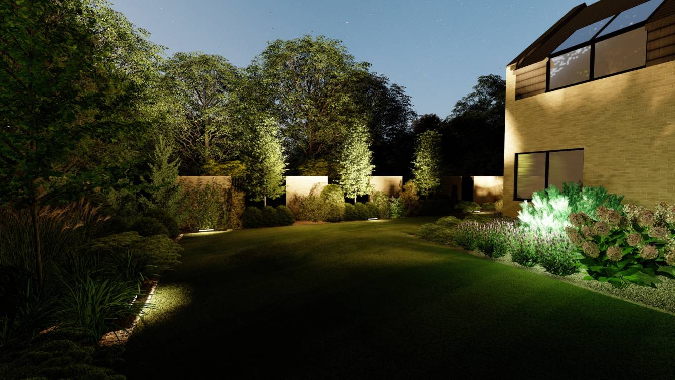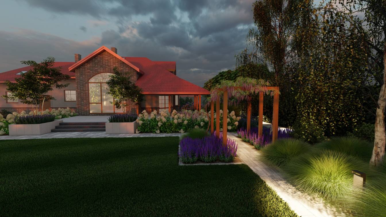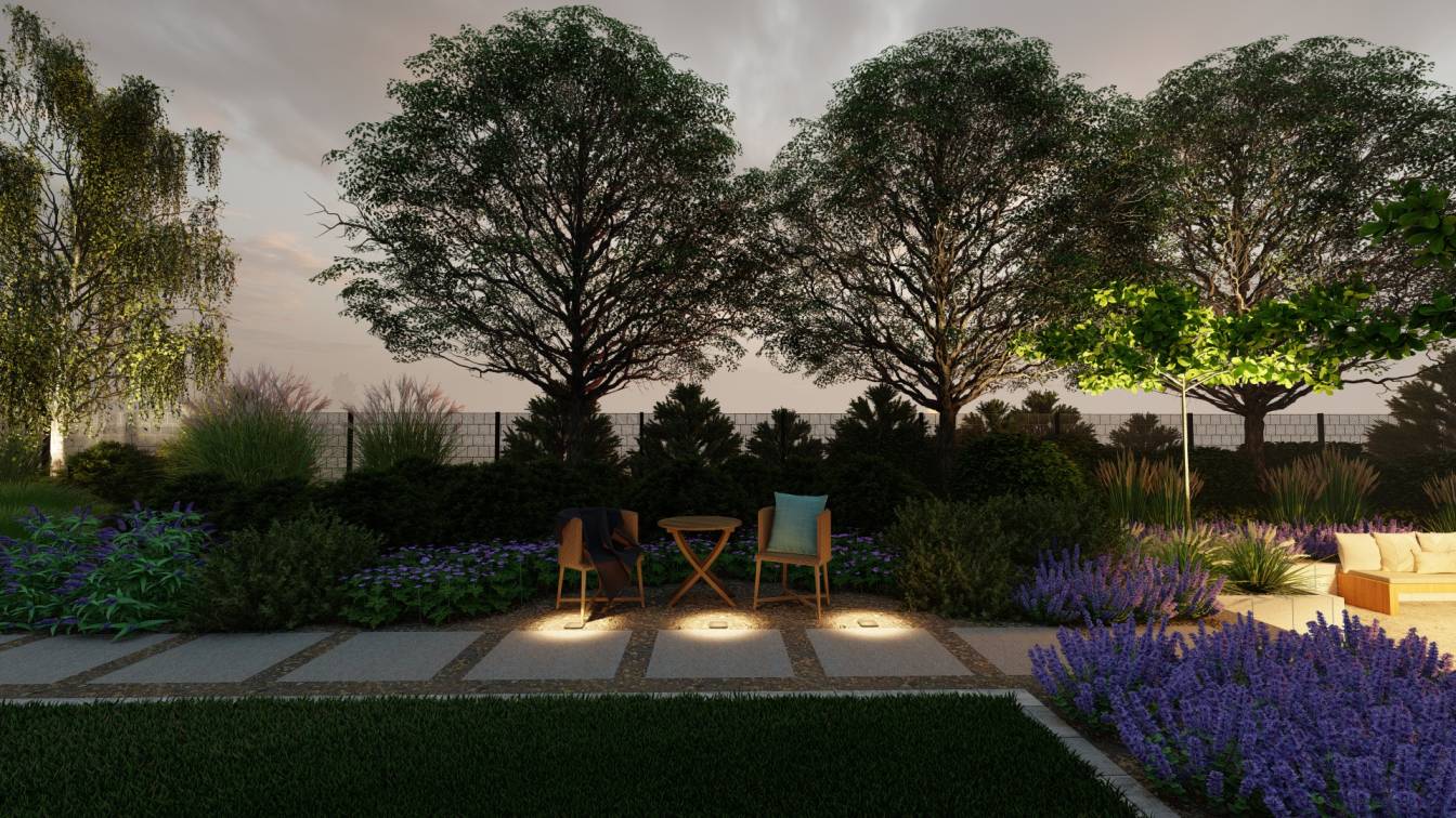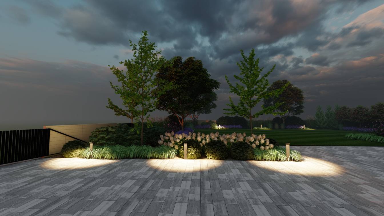 Nocą ogród doświetlają niskie słupki oraz punktowe reflektory, które podkreślają piętrowe nasadzenia.