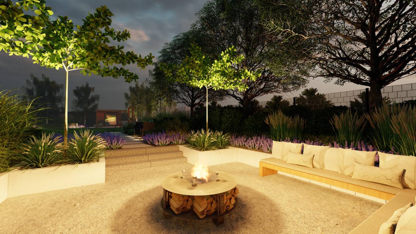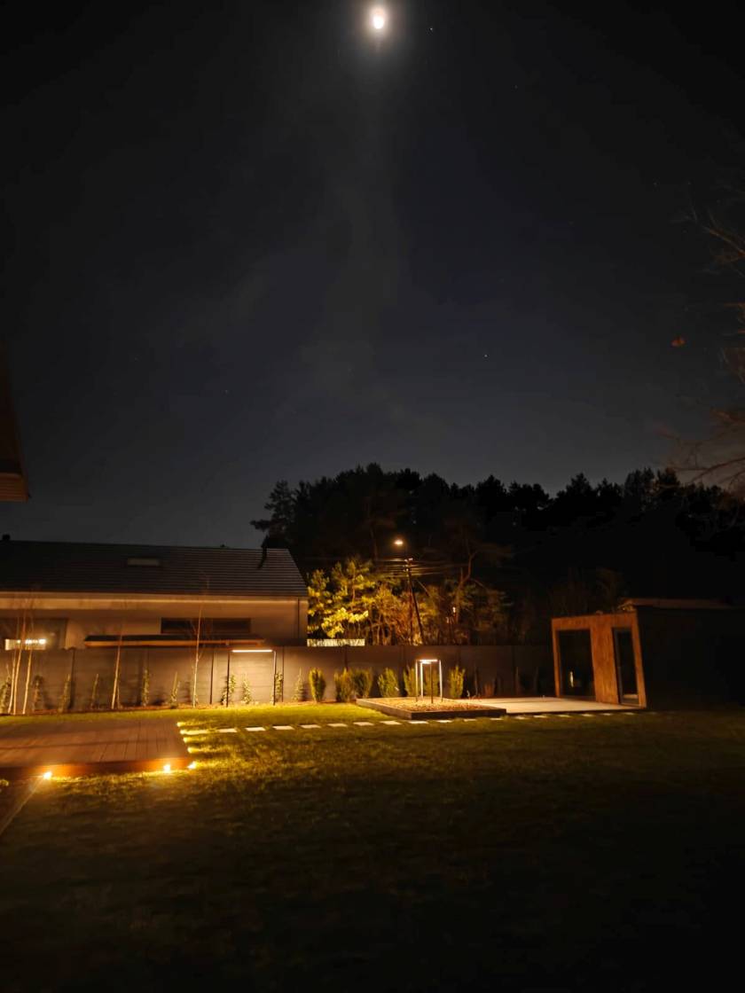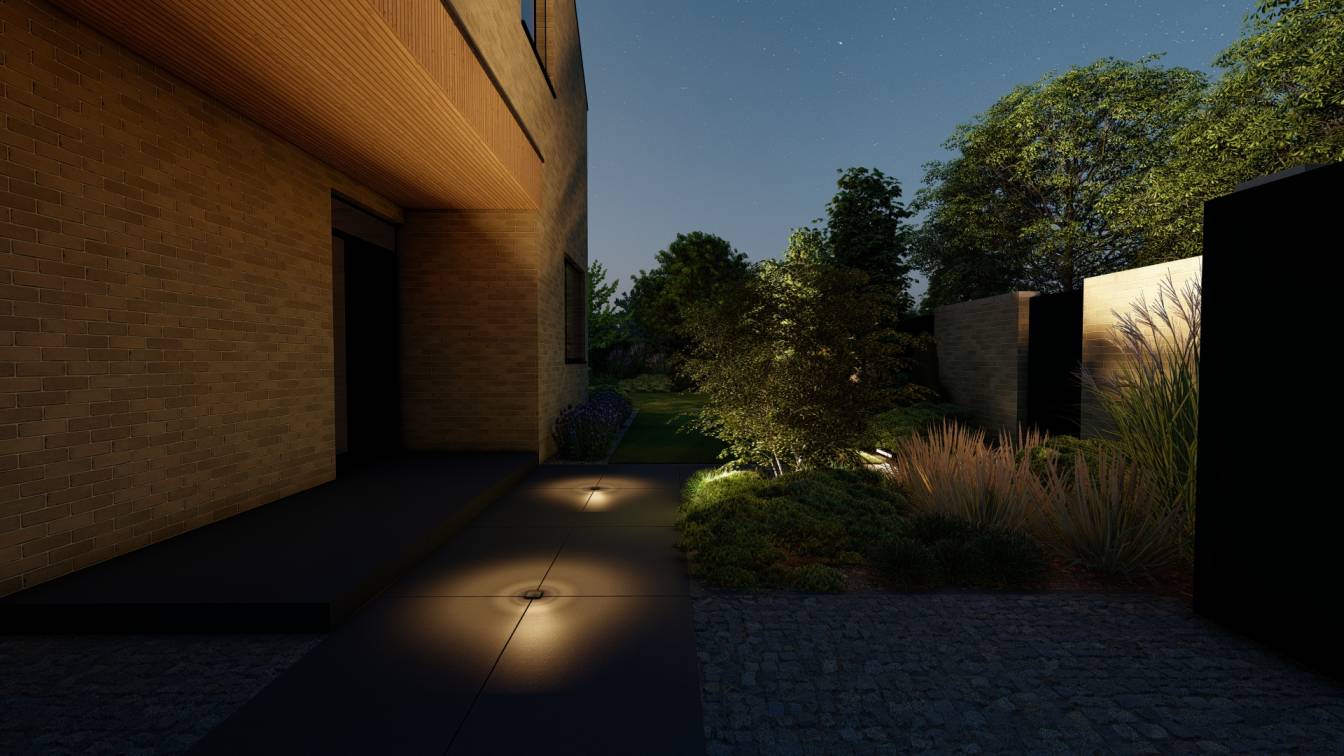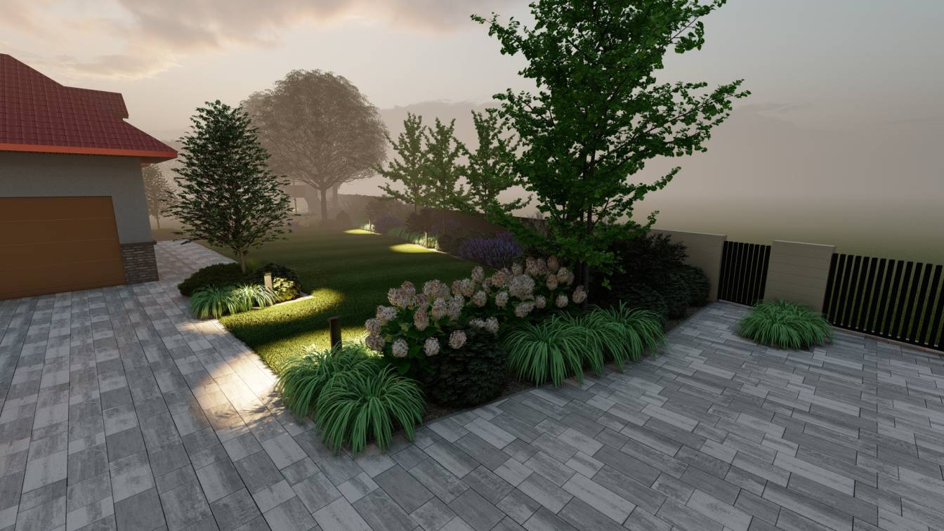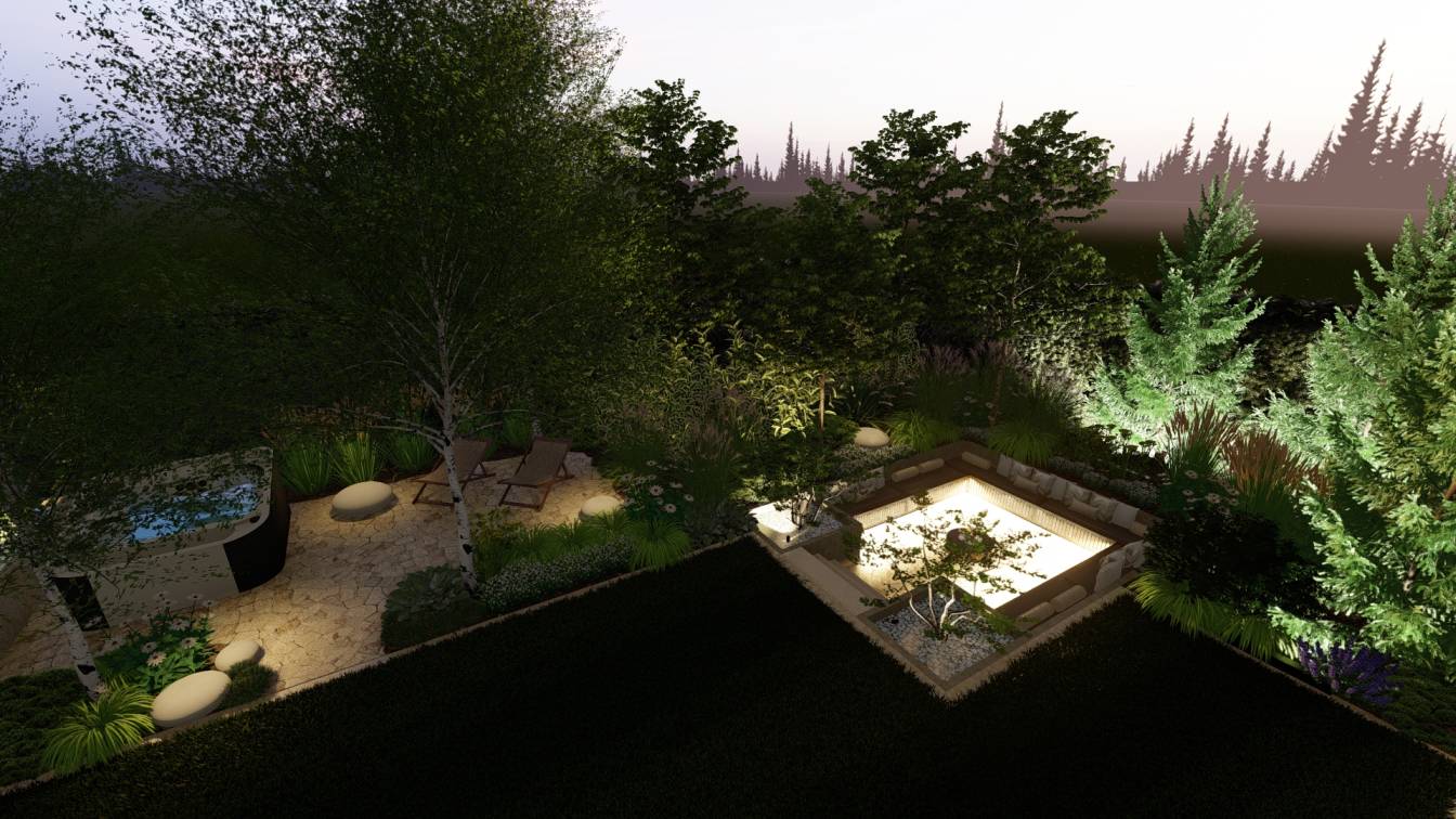 Nocą ogród doświetlają niskie słupki oraz punktowe reflektory, które podkreślają piętrowe nasadzenia.