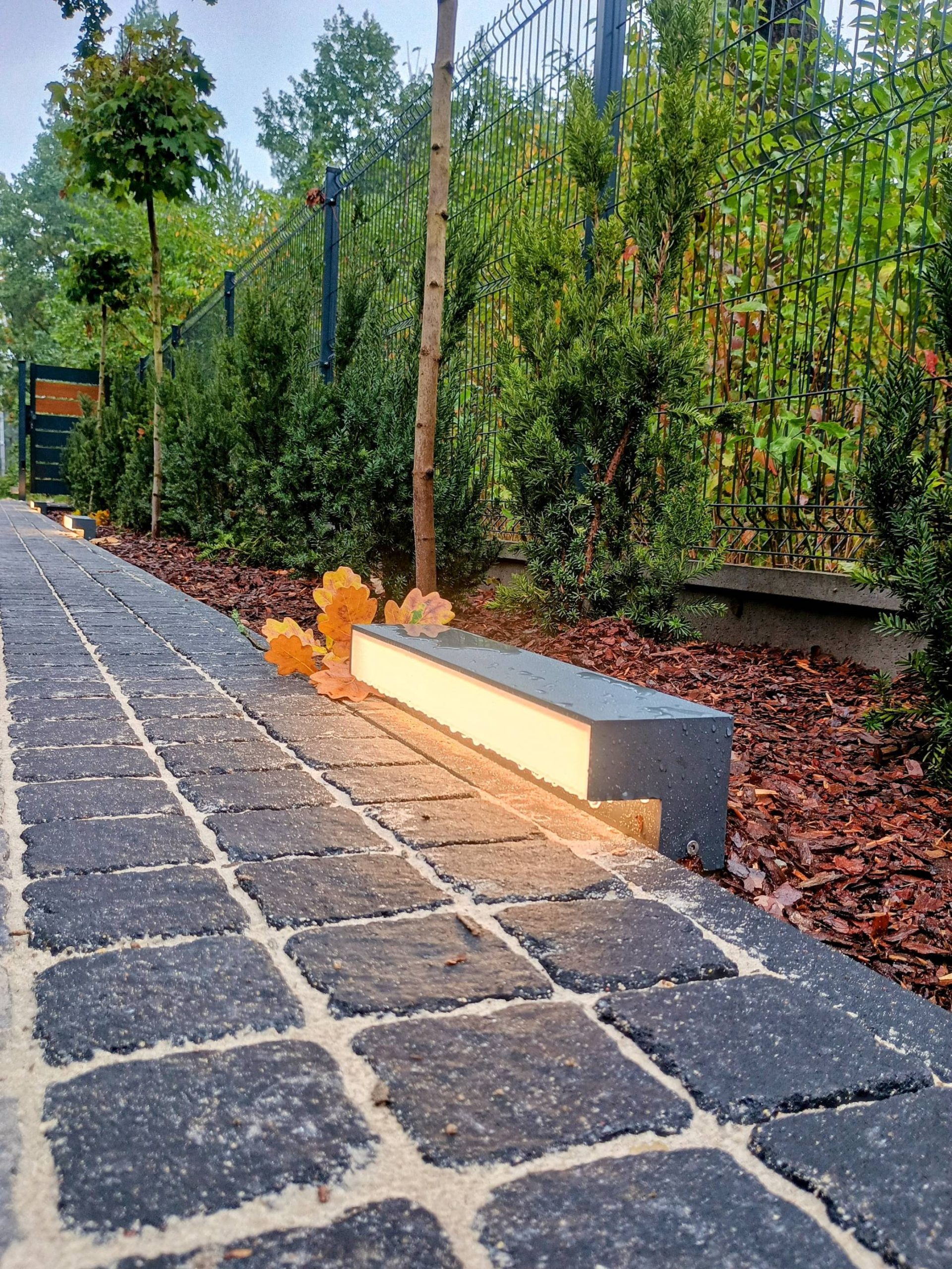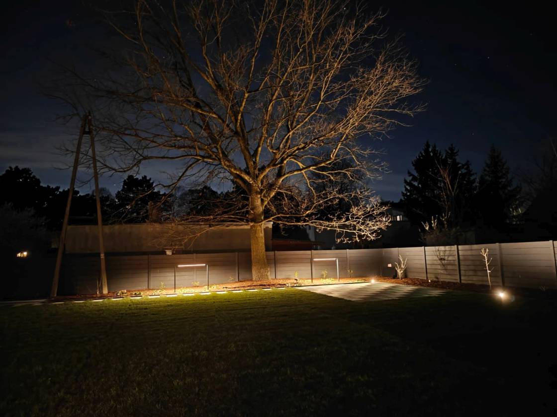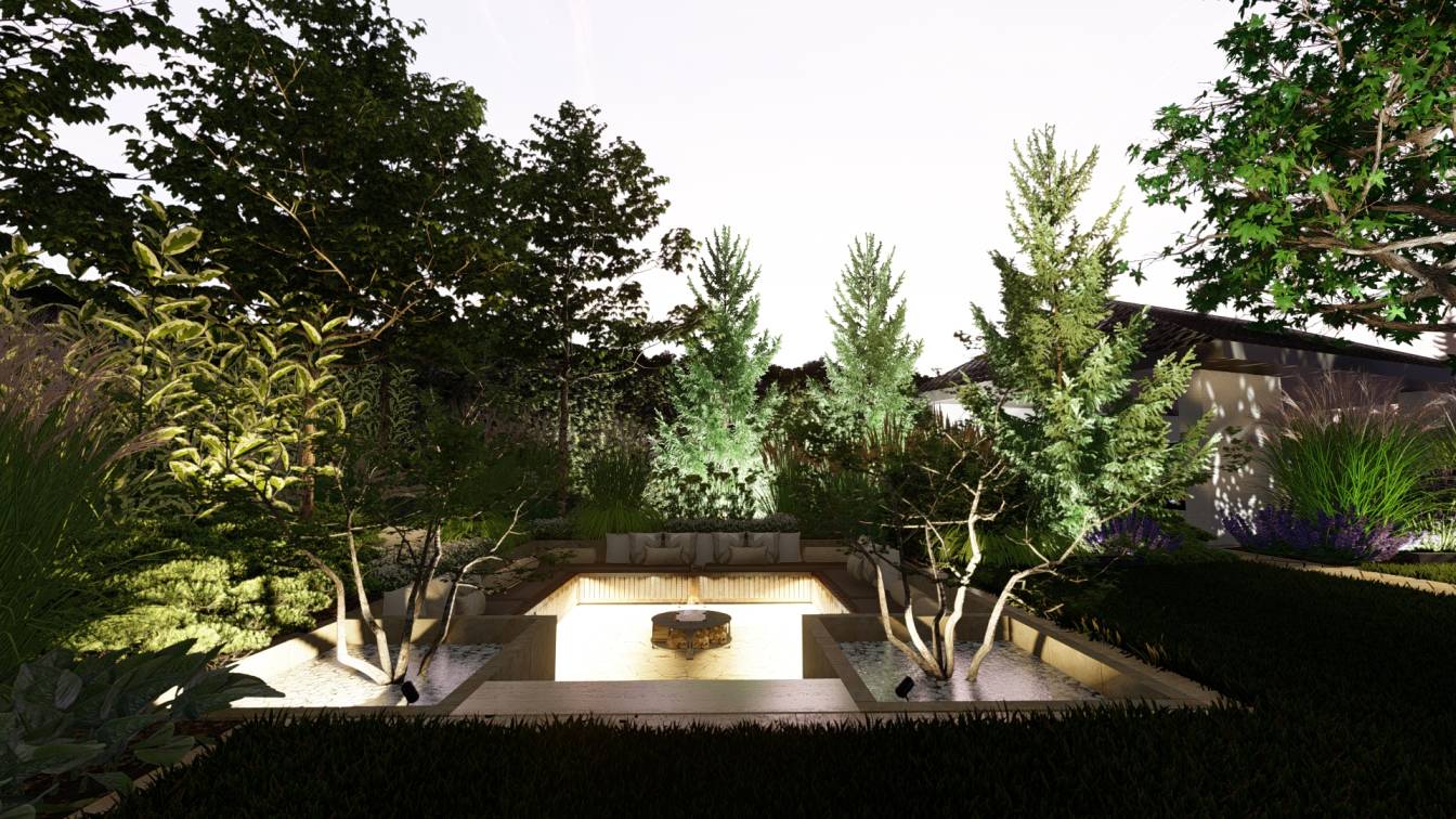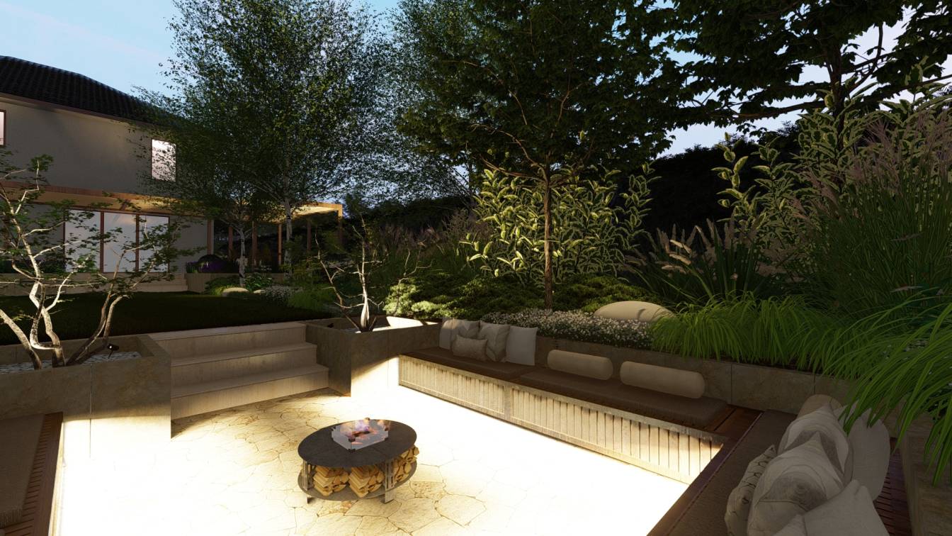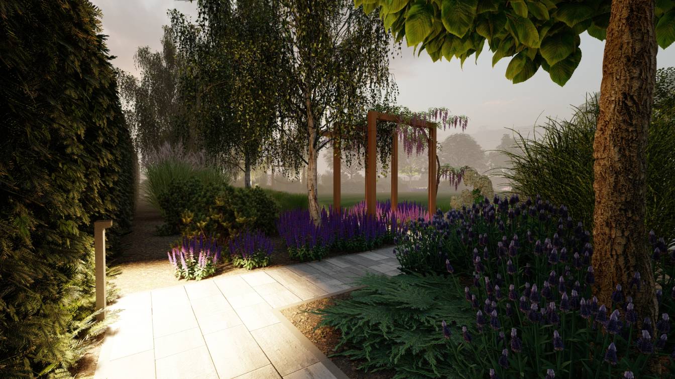 Nocą ogród doświetlają niskie słupki oraz punktowe reflektory, które podkreślają piętrowe nasadzenia.