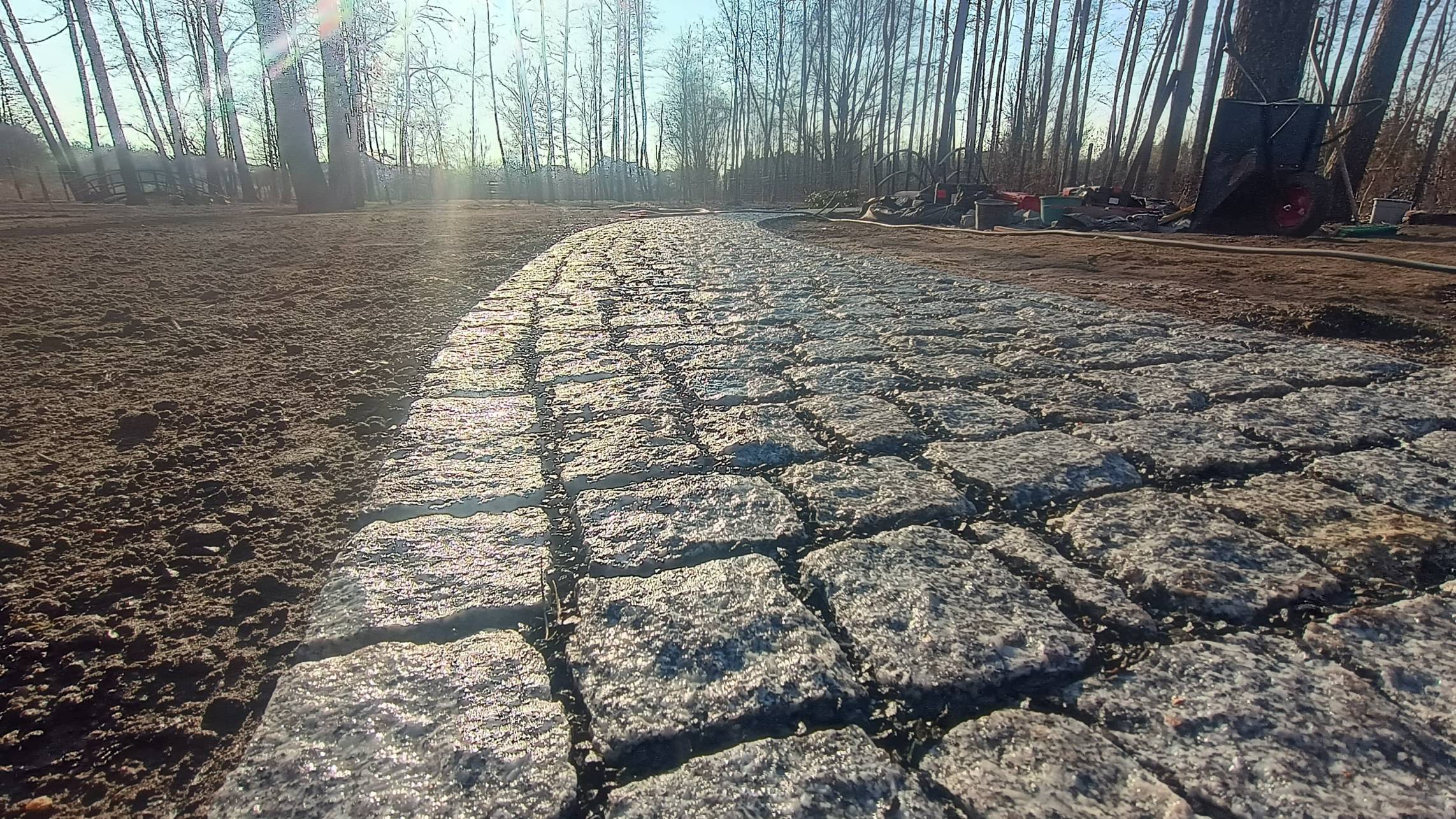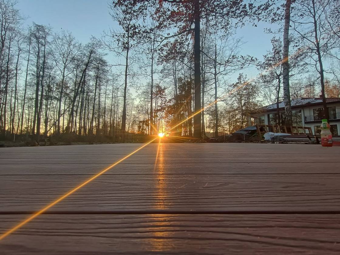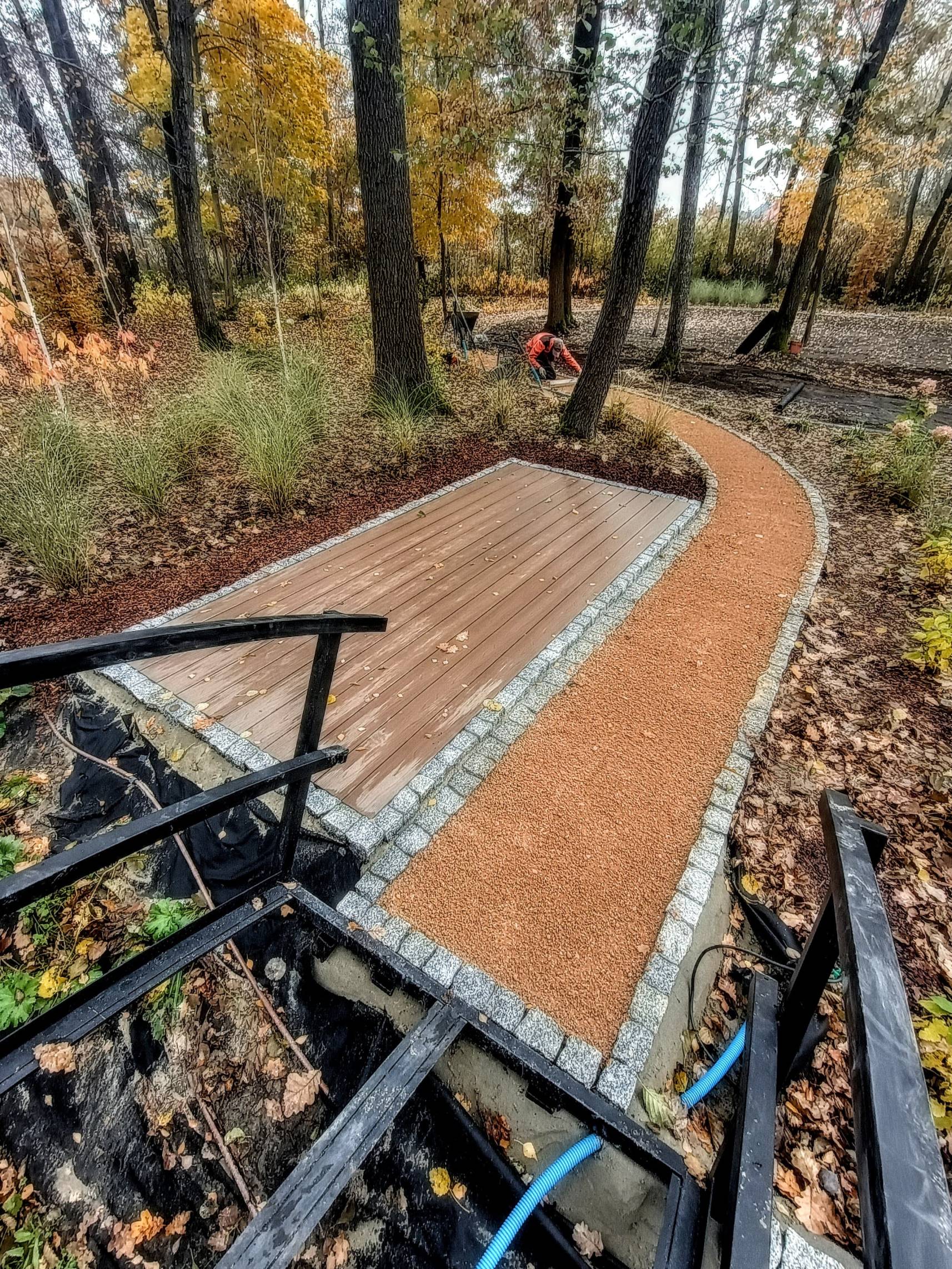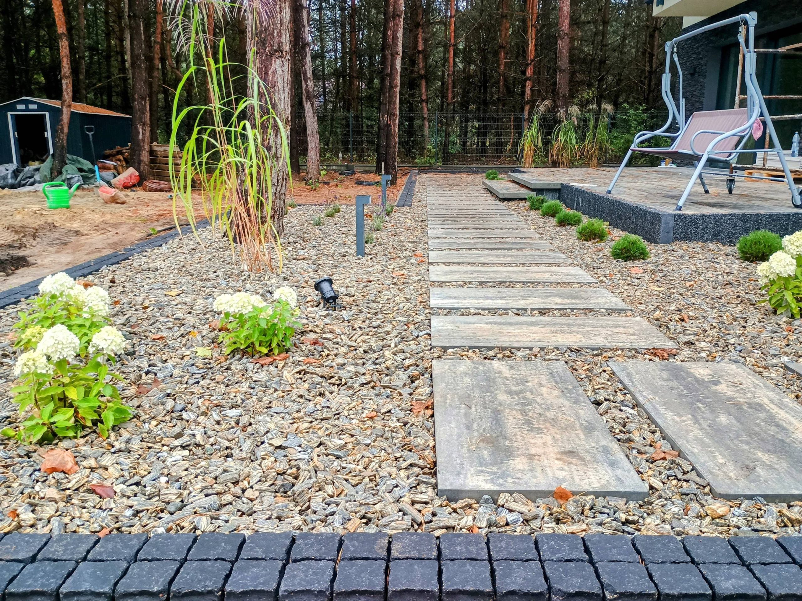 Taras połączono chodnikiem z domkiem saunowym.
