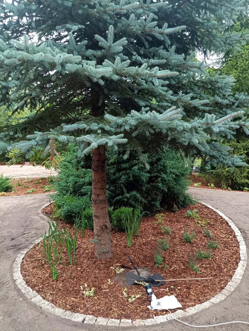 Kompozycję tworzą m.in. klony ‘Globosum’, kosodrzewiny, turzyce, cisy, derenie oraz wiśnia ‘Umbraculifera’.