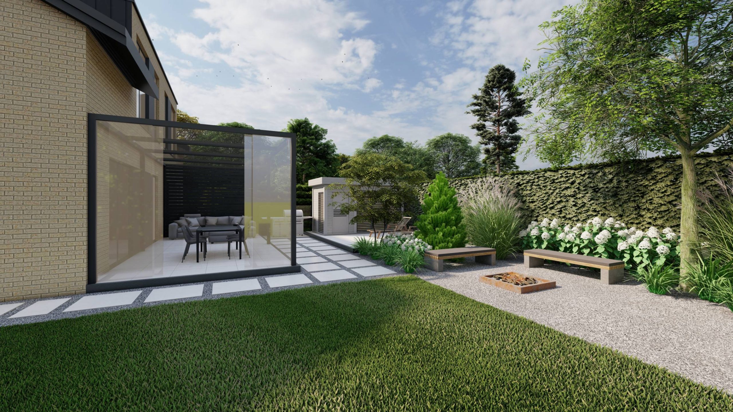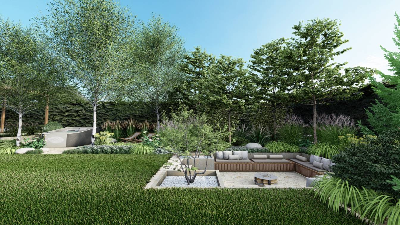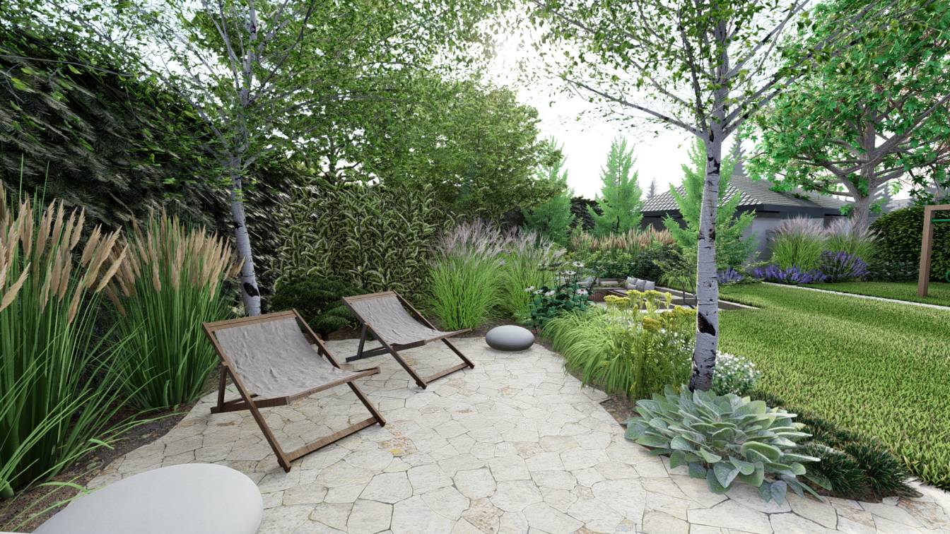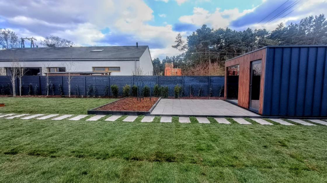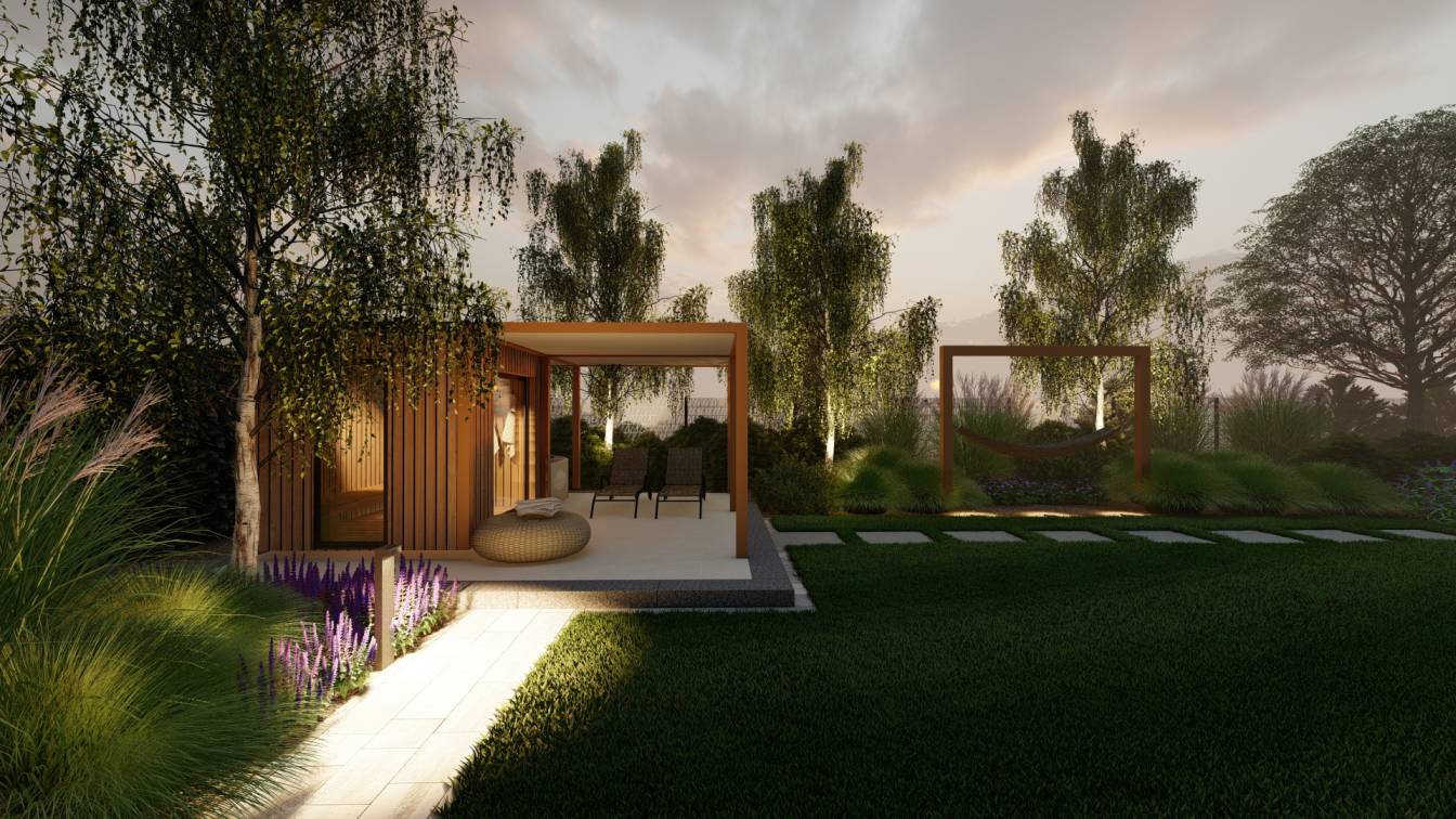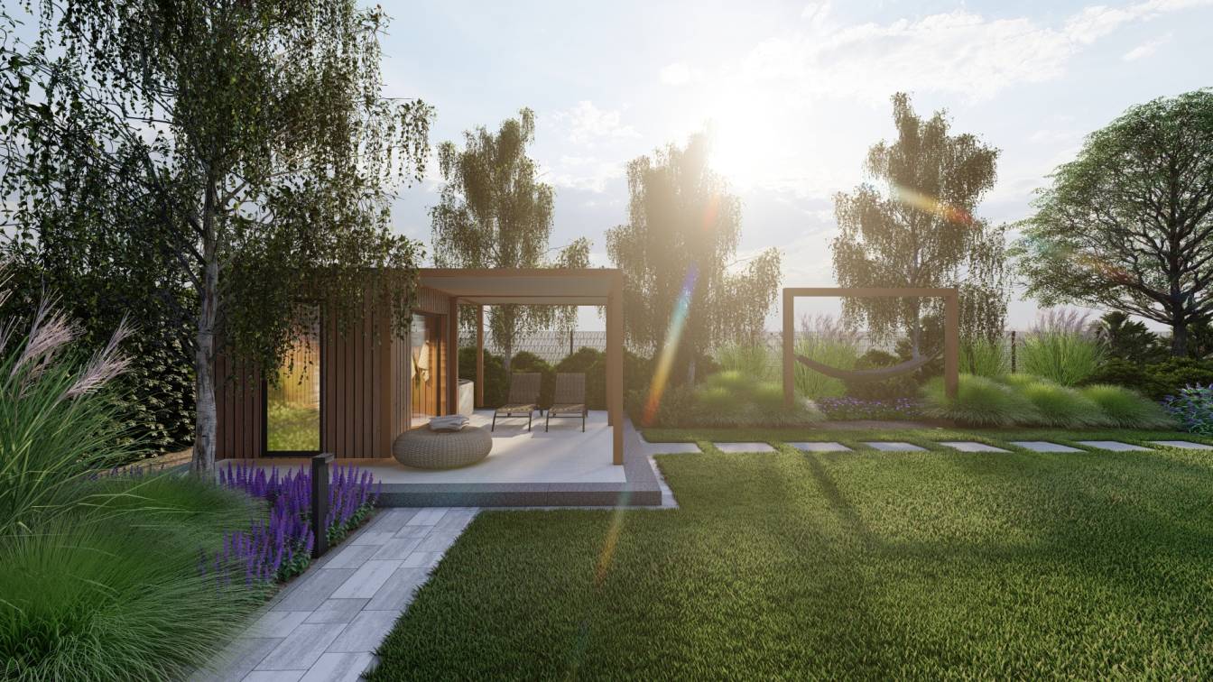 Sercem ogrodu jest strefa grilla oraz dodatkowy plac pod domek saunowy, z miejscem na leżaki.