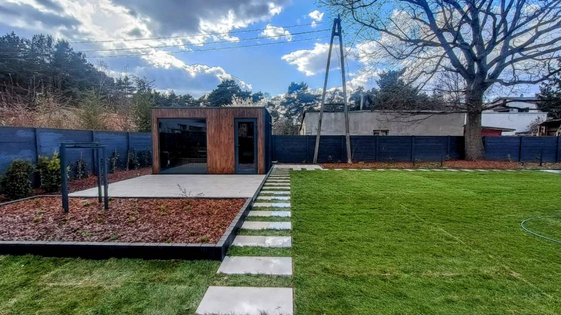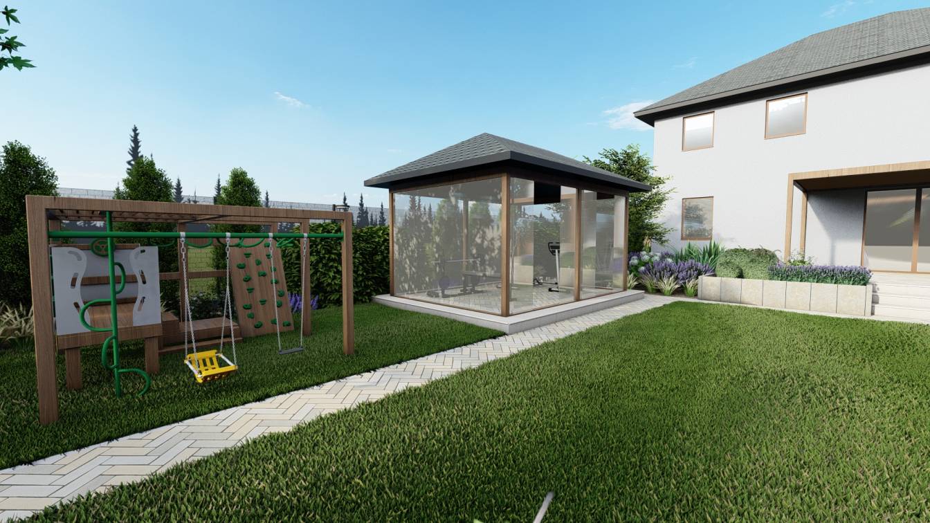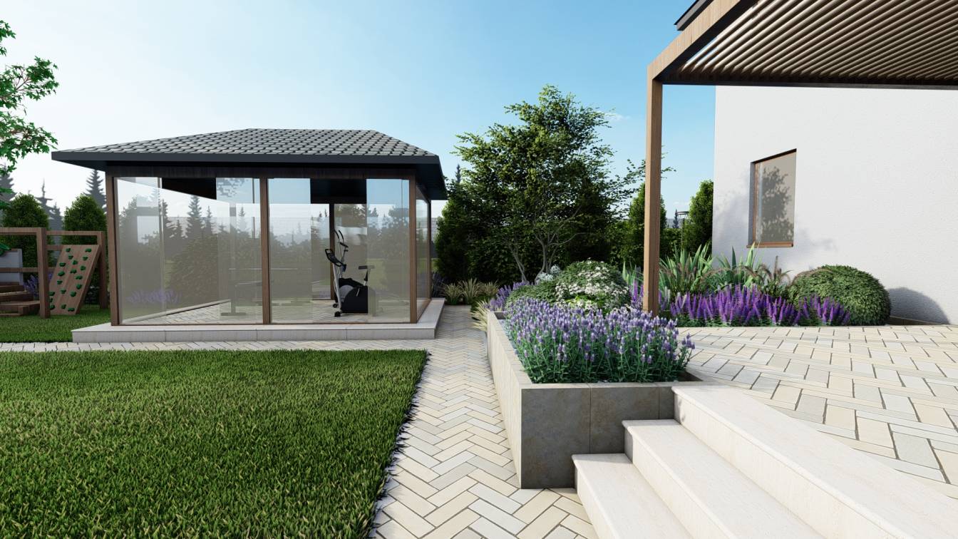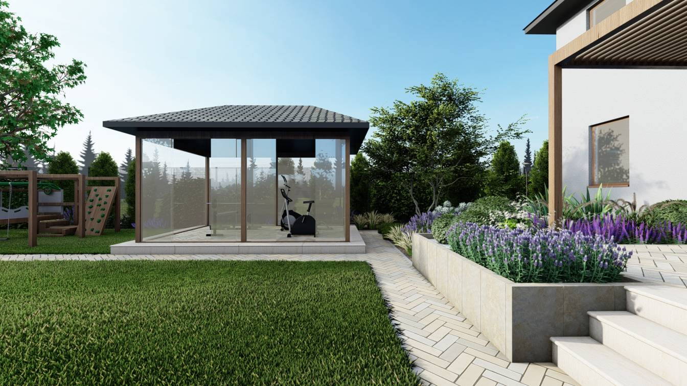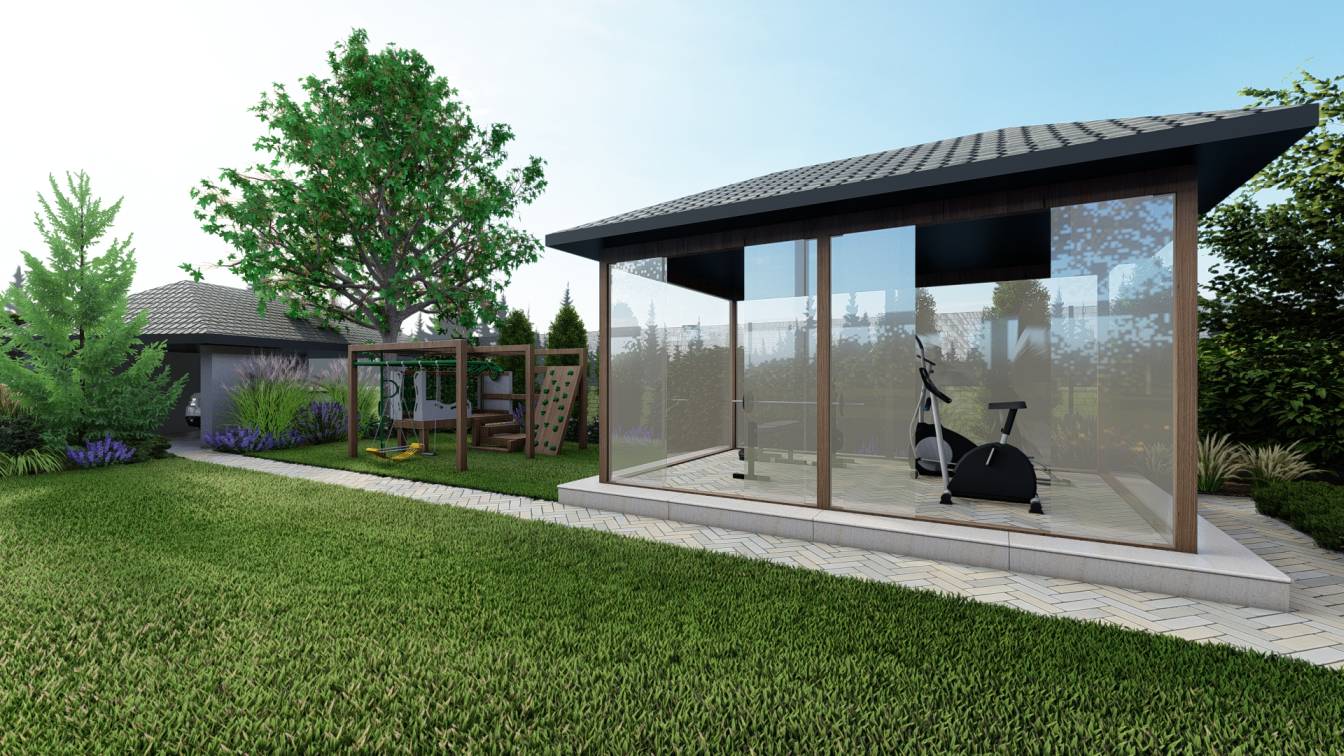 Dodatkowo ustawiono pawilon ogrodowy przeznaczony na siłownię zewnętrzną.