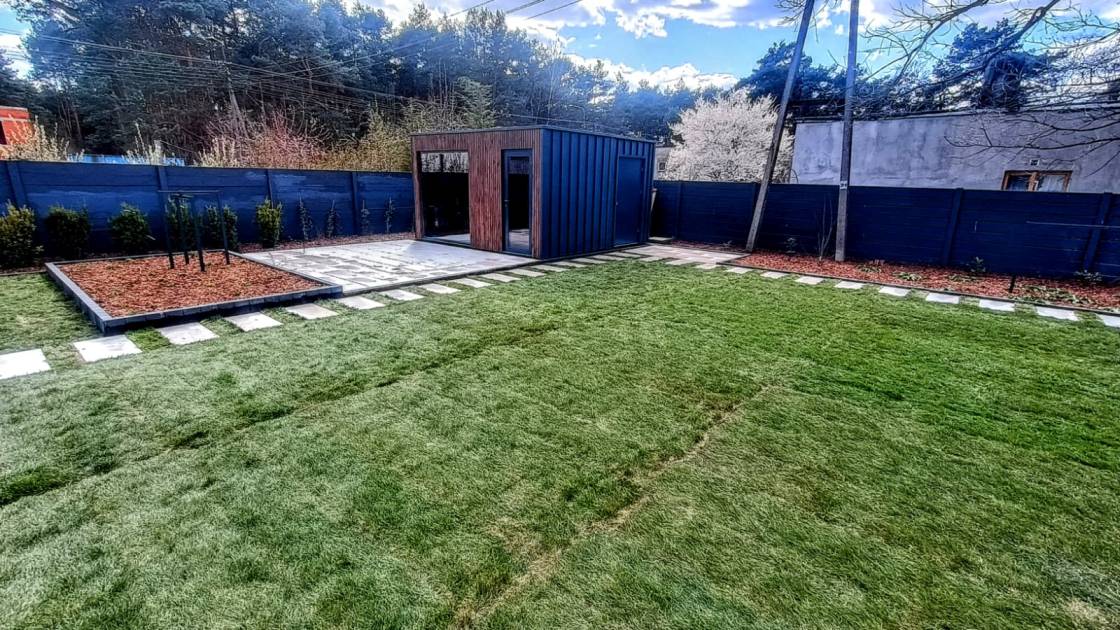 W głębi ogrodu znajduje się narzędziówka oraz wydzielona strefa na hamak lub huśtawkę.