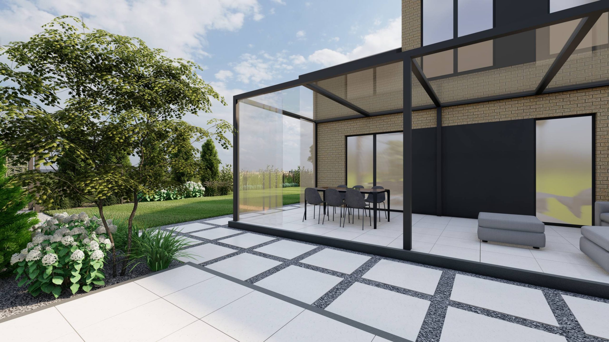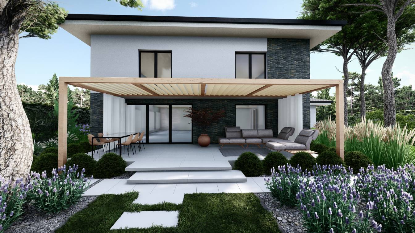Na tarasie przewidziano miejsce na pergolę z ruchomymi lamelami.