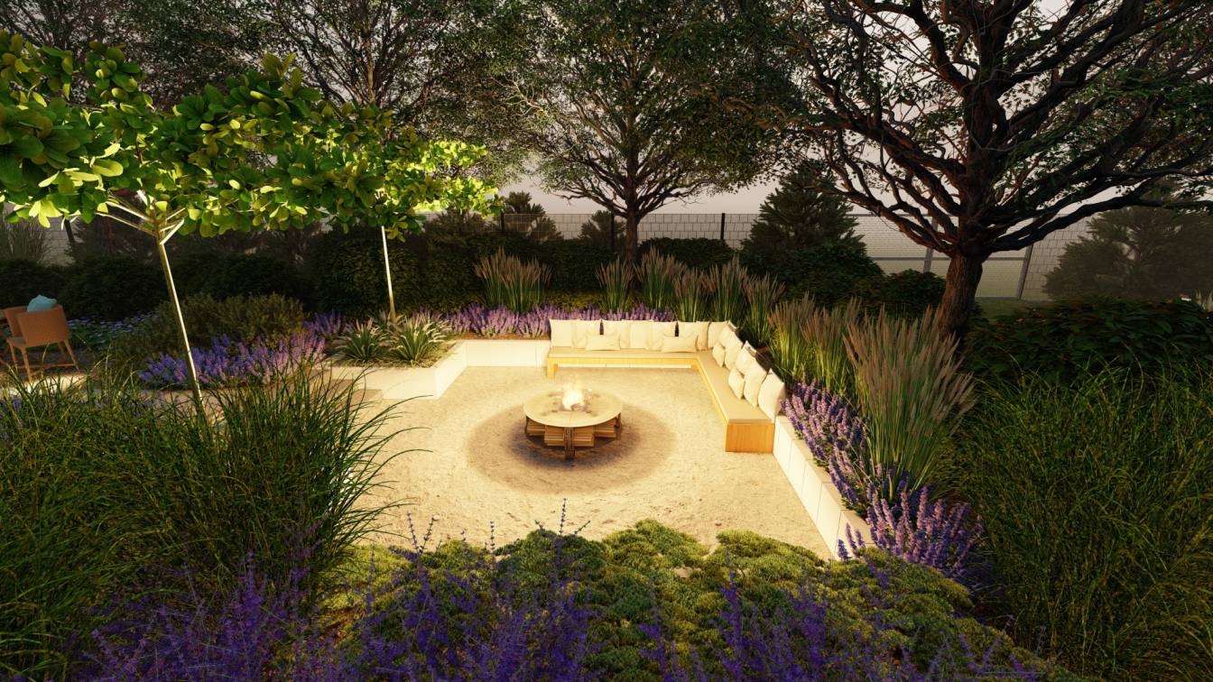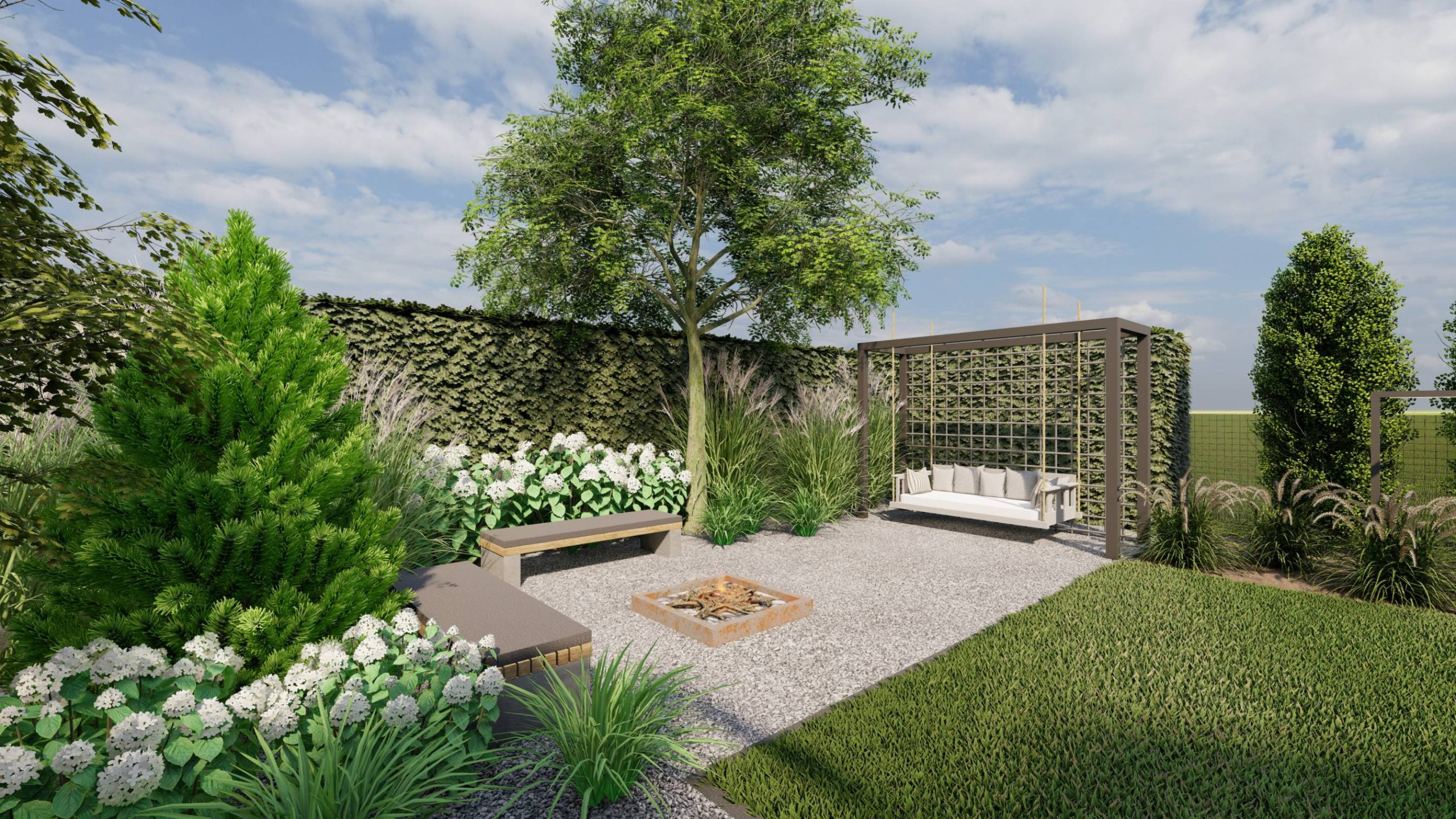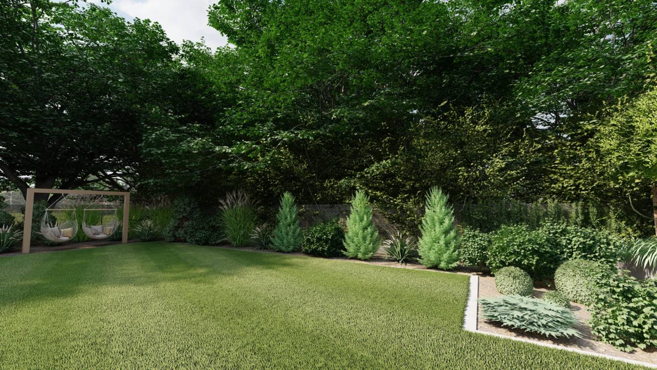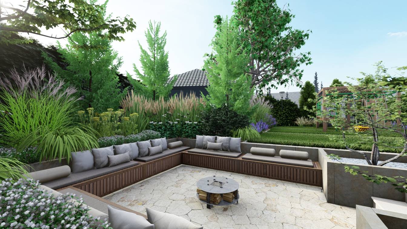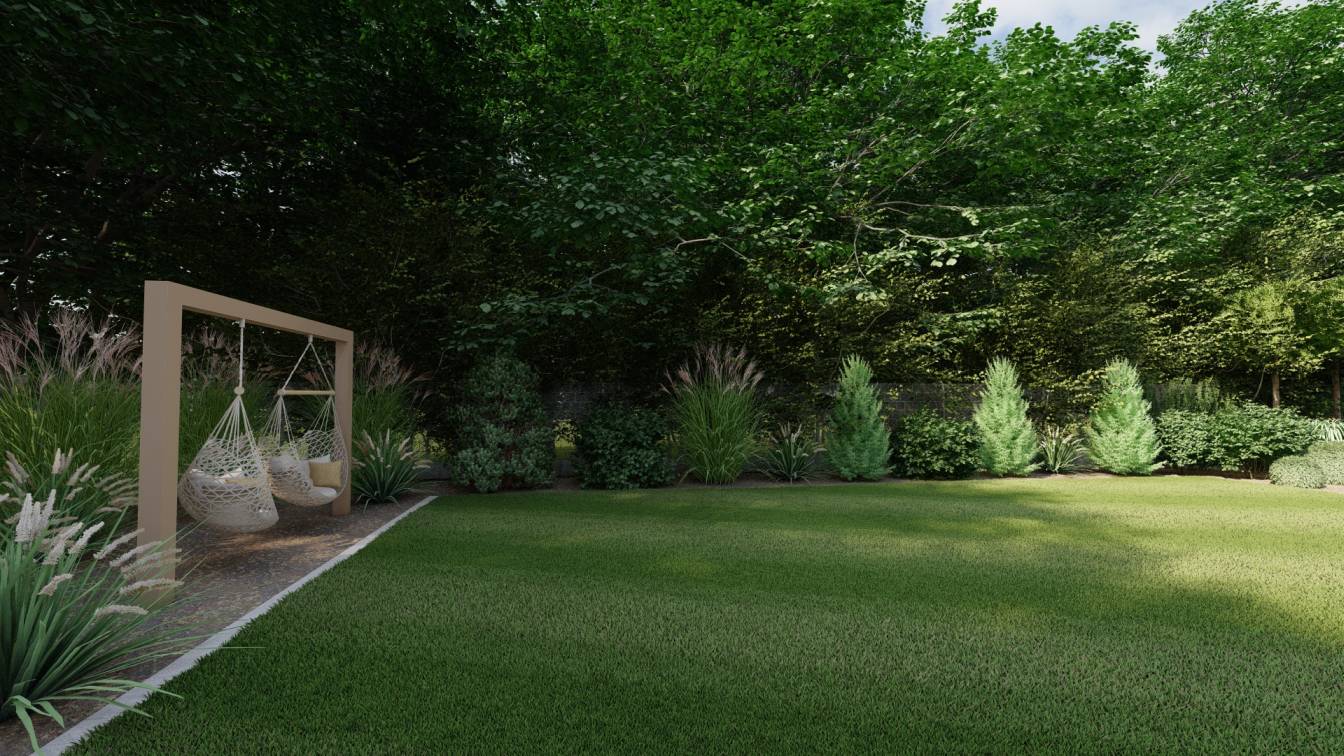 Huśtawkę i palenisko umieszczono tak, aby były widoczne z głównego trawnika.
